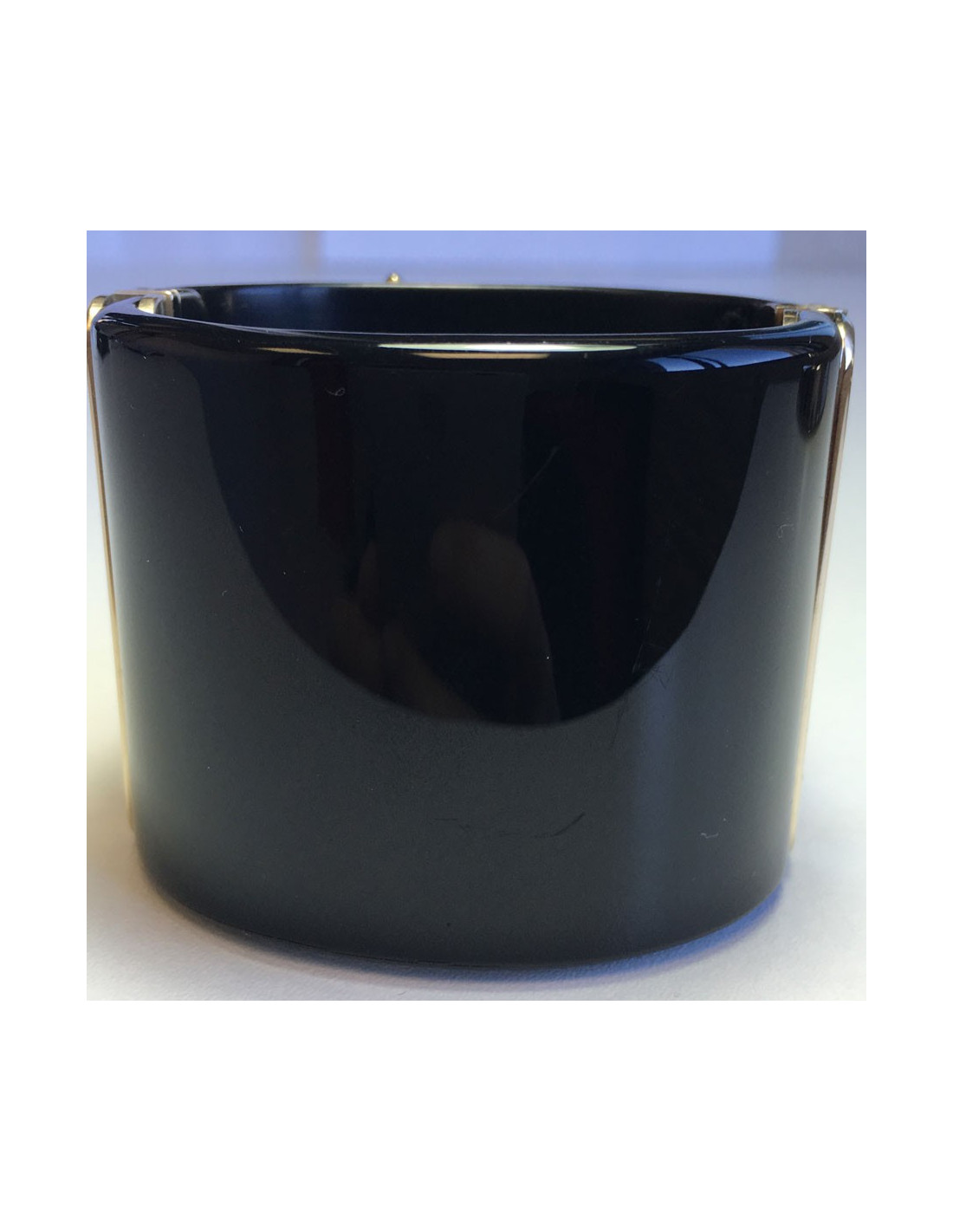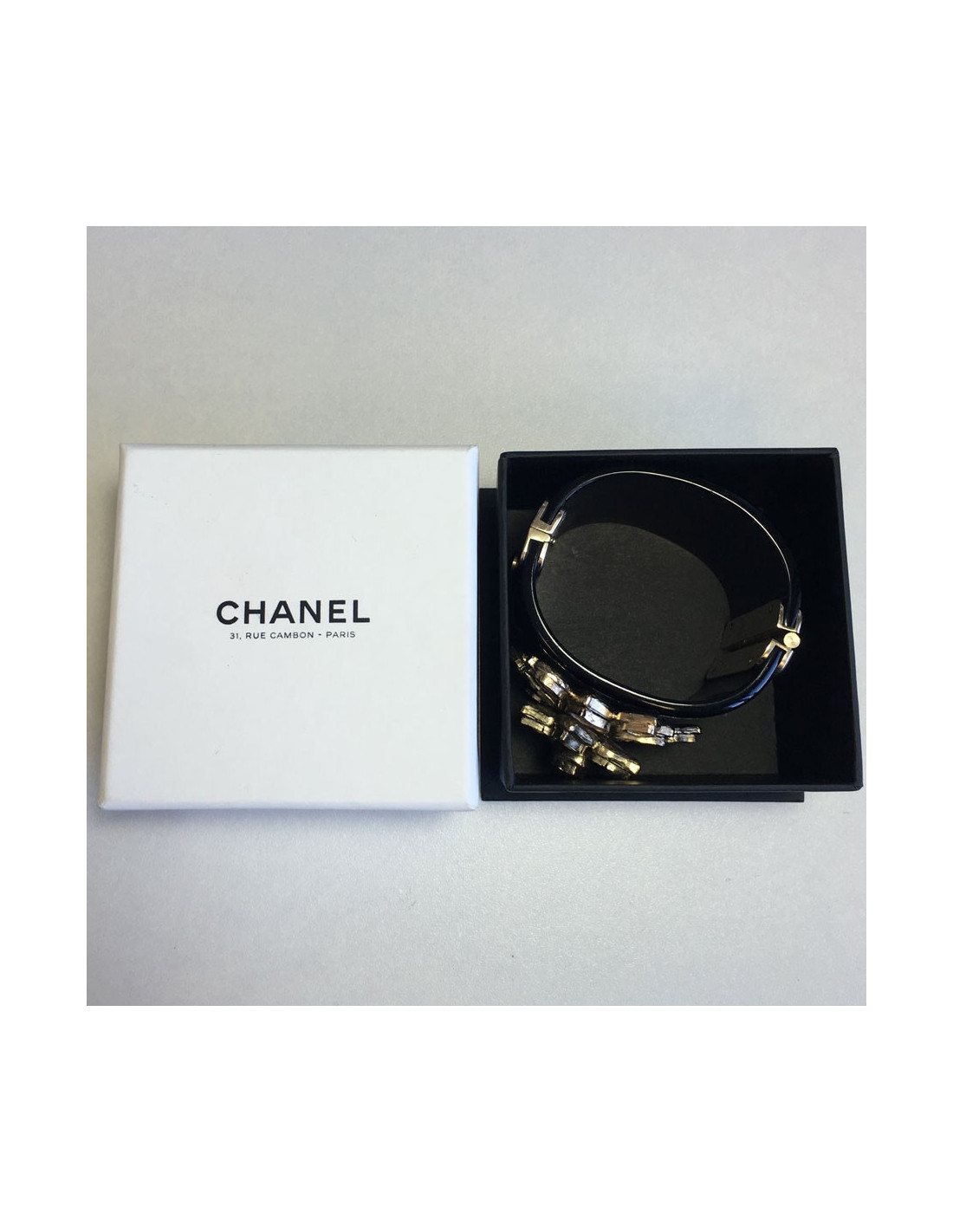 CHANEL Super rigid cuff in black resin. Gem flower matte gold metal, petals in clear resin and CC gold. Lozenge of the brand presents. Collection cruise 2010.