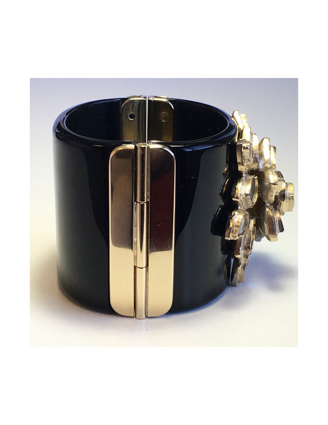CHANEL cuff in black resin and flower in gold metal and transparent resin