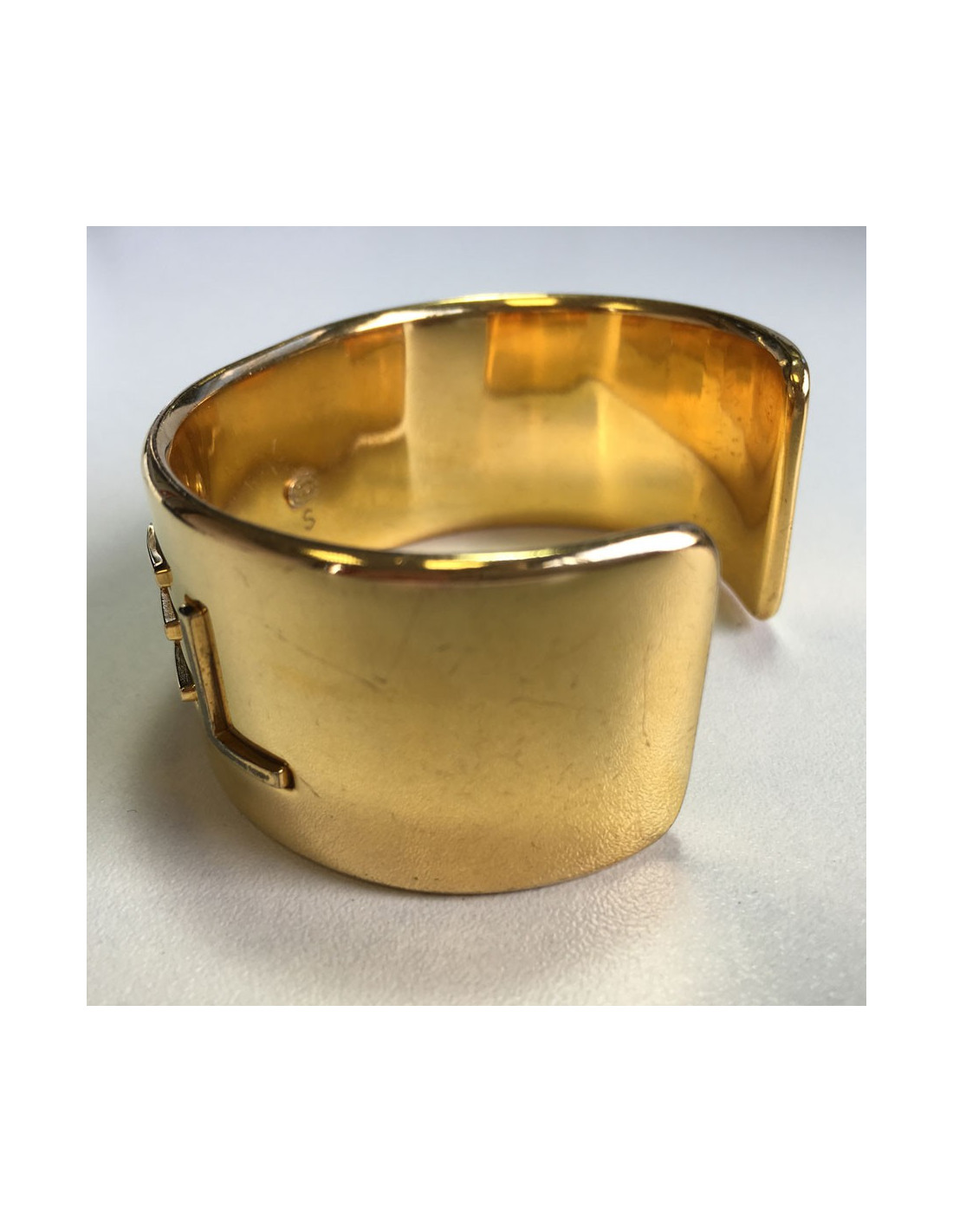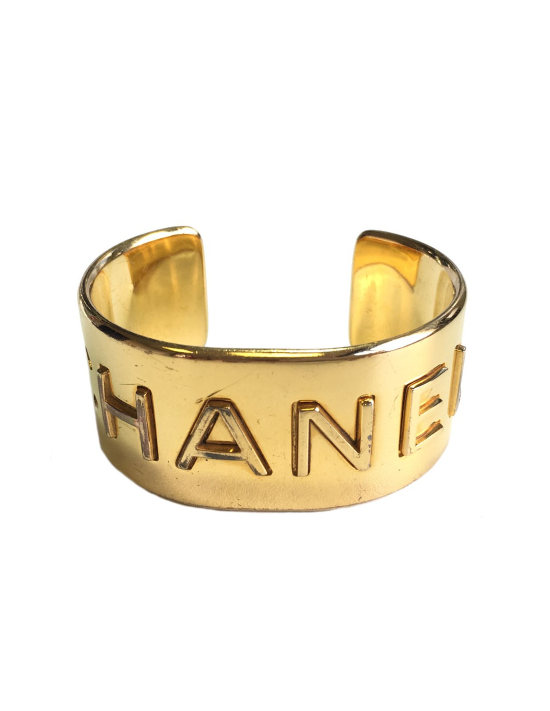 CHANEL cuff rigid gold metal. Vintage piece. CHANEL embossed on the front of this bracelet. The letter C has come off. Some scratches on the bracelet overall. Golden metal came a little.