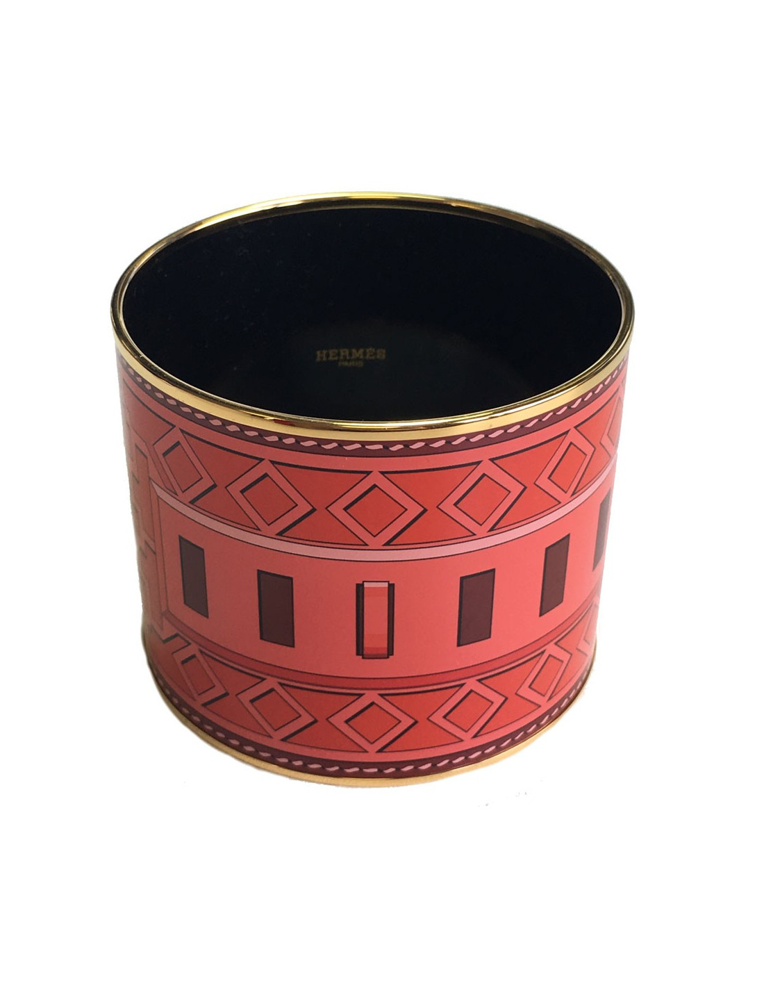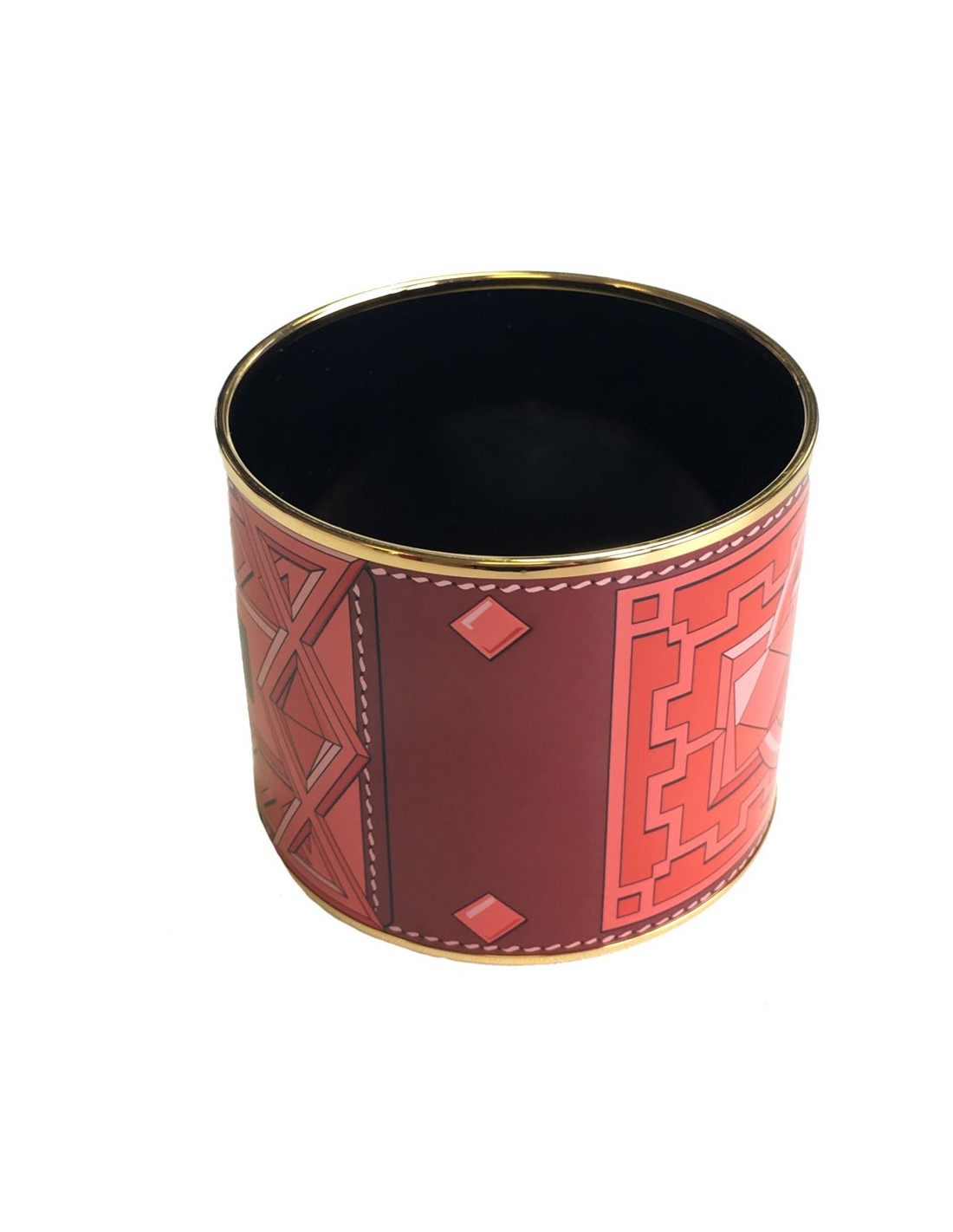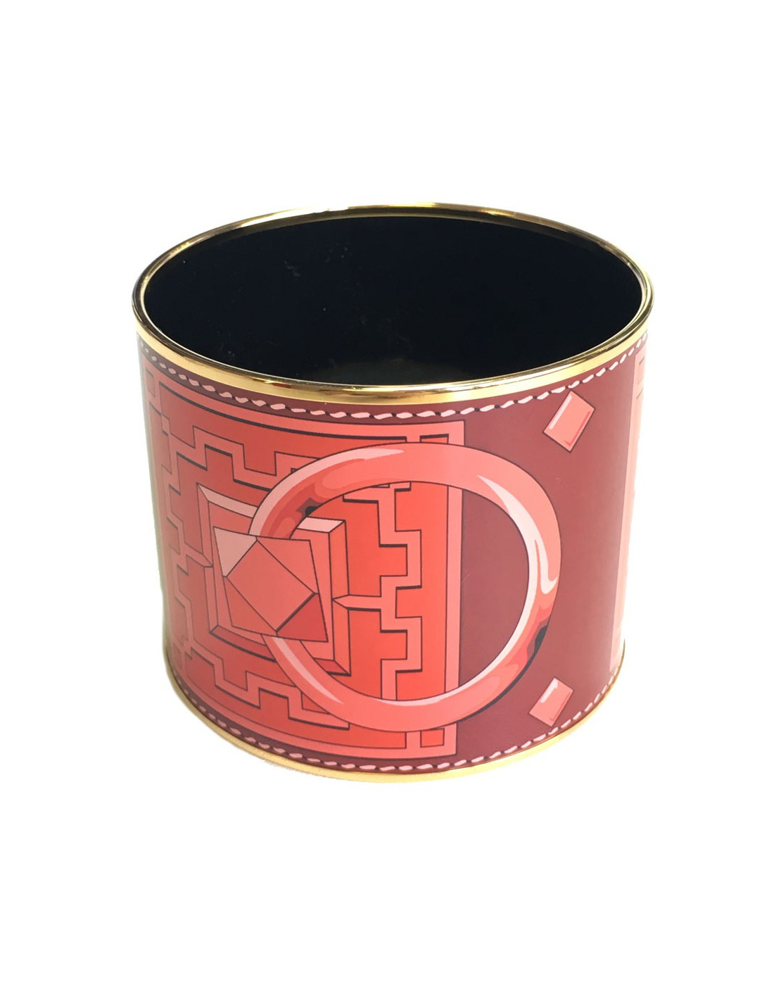Mega wide bracelet in red and pink HERMÈS enamel. The drawings are fine in red tones, dregs of wine and pink. The strapping is plated gold. Scratched 'Made in France + P'.