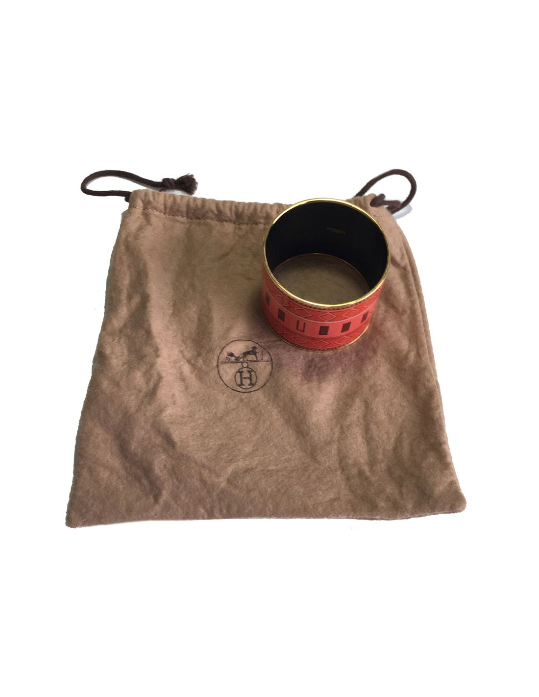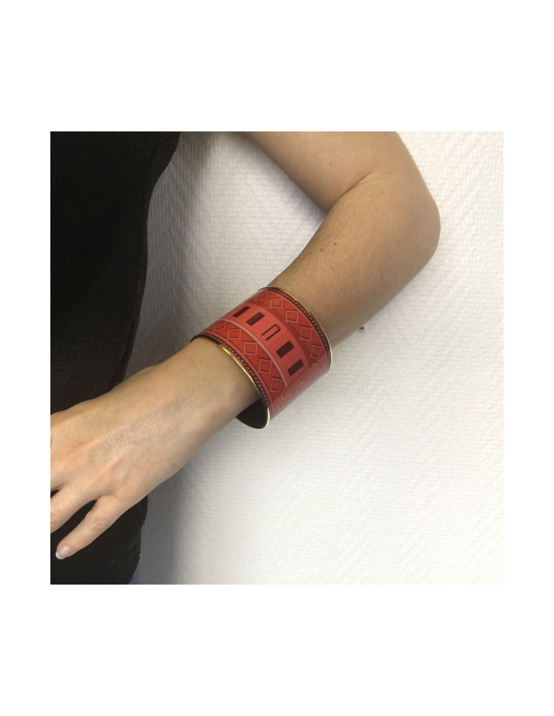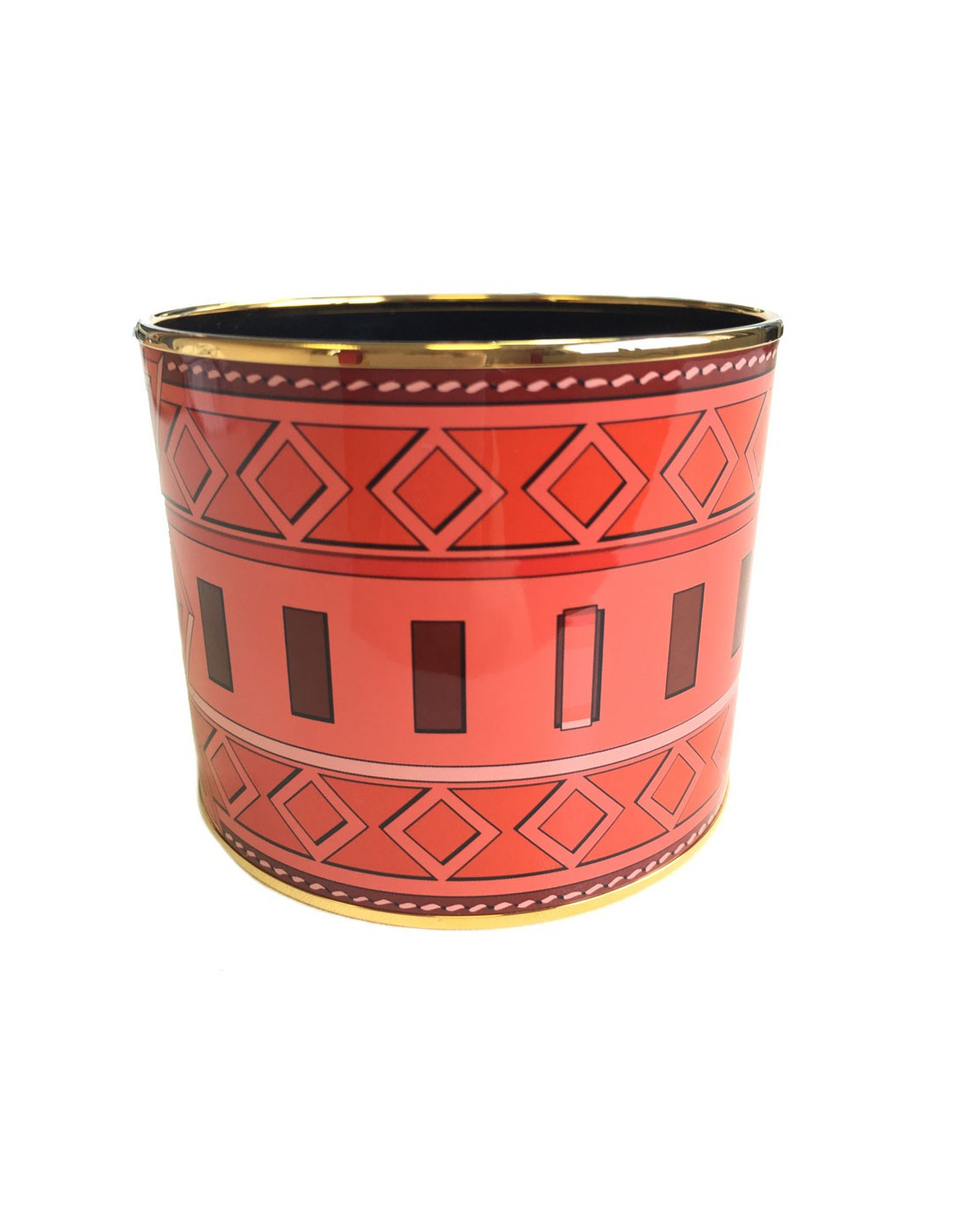Mega wide bracelet in red and pink HERMÈS enamel. The drawings are fine in red tones, dregs of wine and pink. The strapping is plated gold. Scratched 'Made in France + P'.
