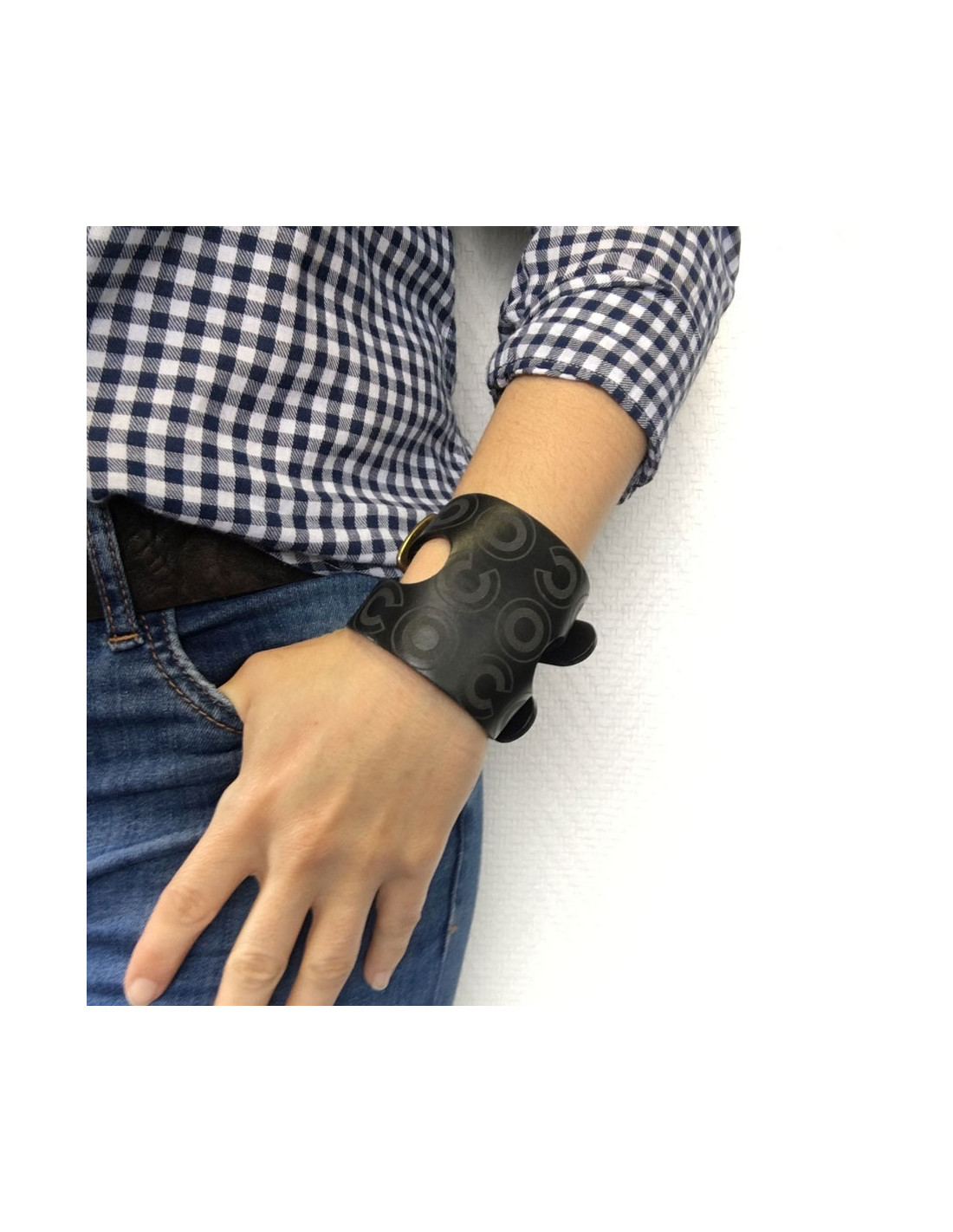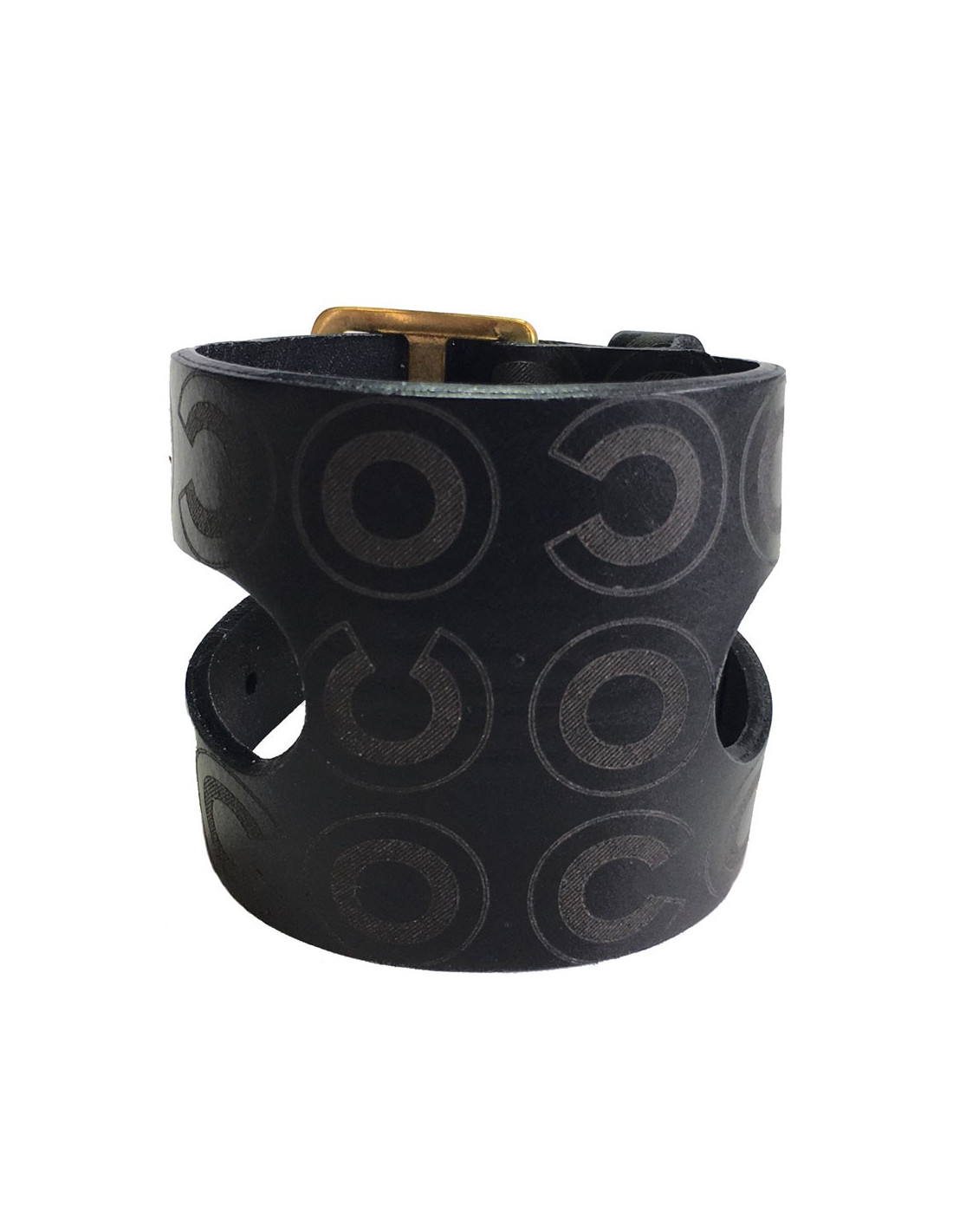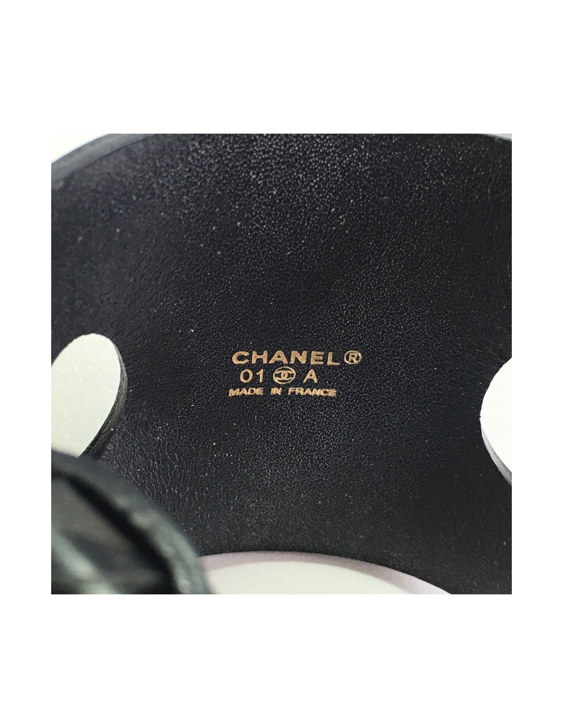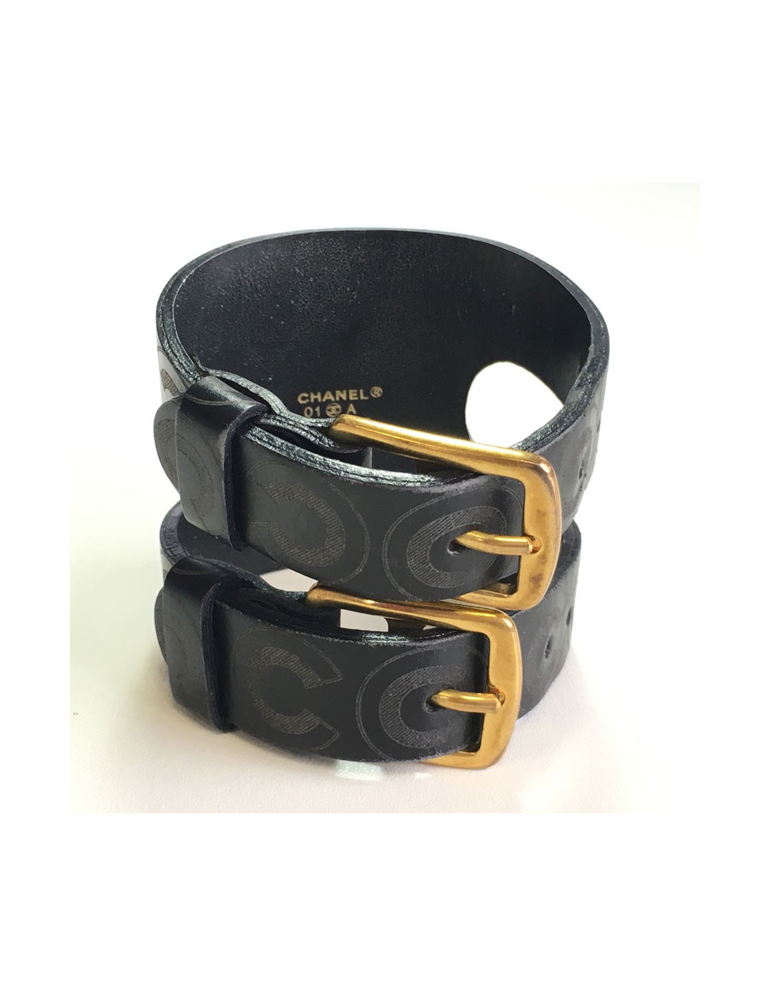 CHANEL 'Coco' cuff in black leather. Double clasp in golden brass. CHANEL registration on each loop. Adjustable size. Vintage.