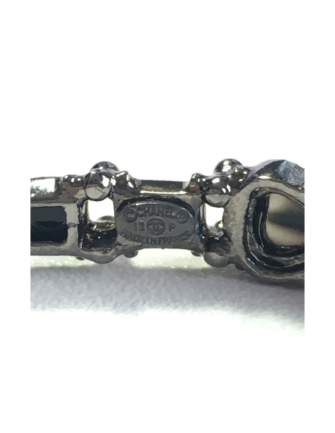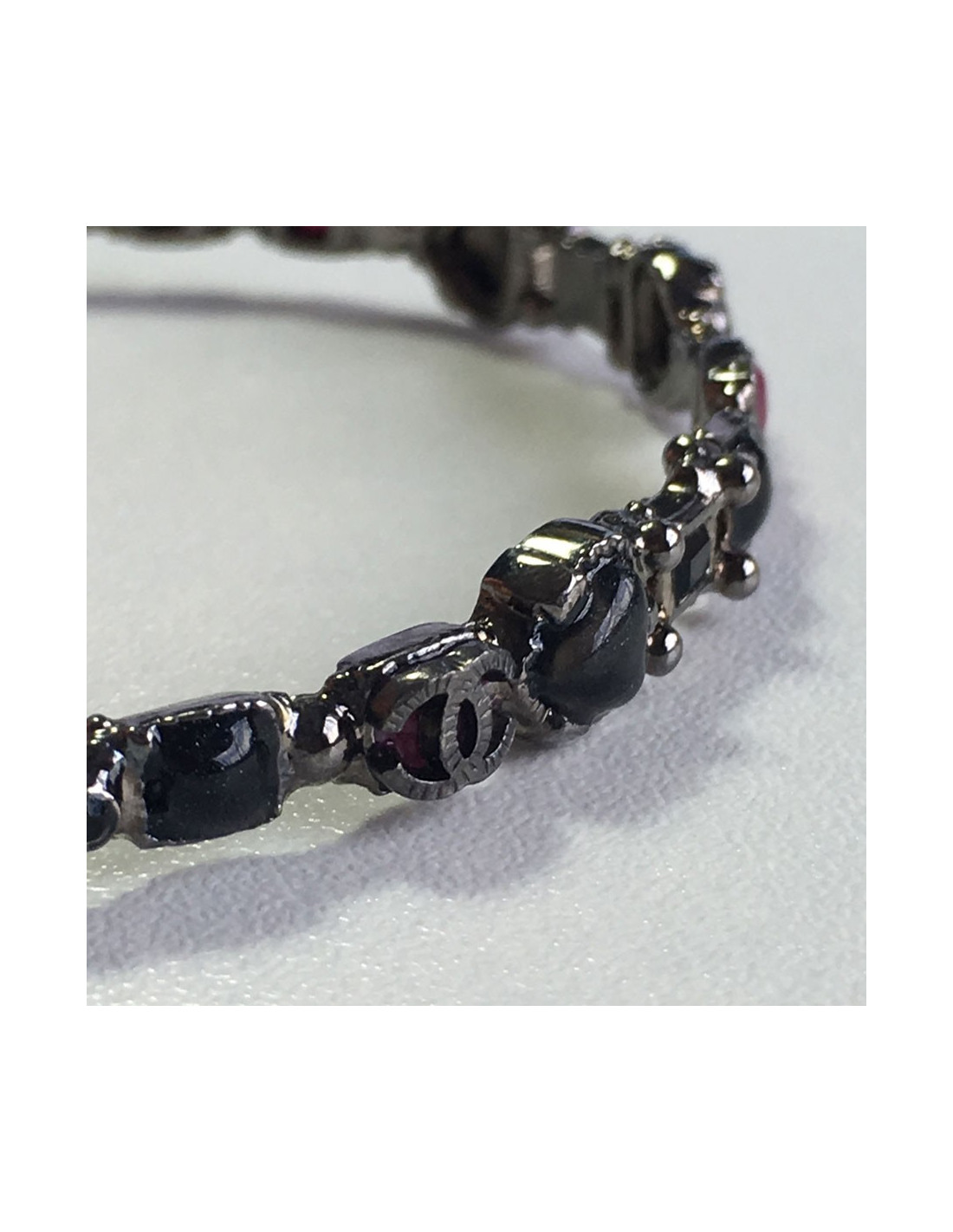 Bracelet Chanel en métal de couleur ruthénium (argent noir) et pâte de verre noir, fushia et gris mêlé et cristal noir, deux CC sur le bracelet. Probablement issu de la Collection Paris Bombay.