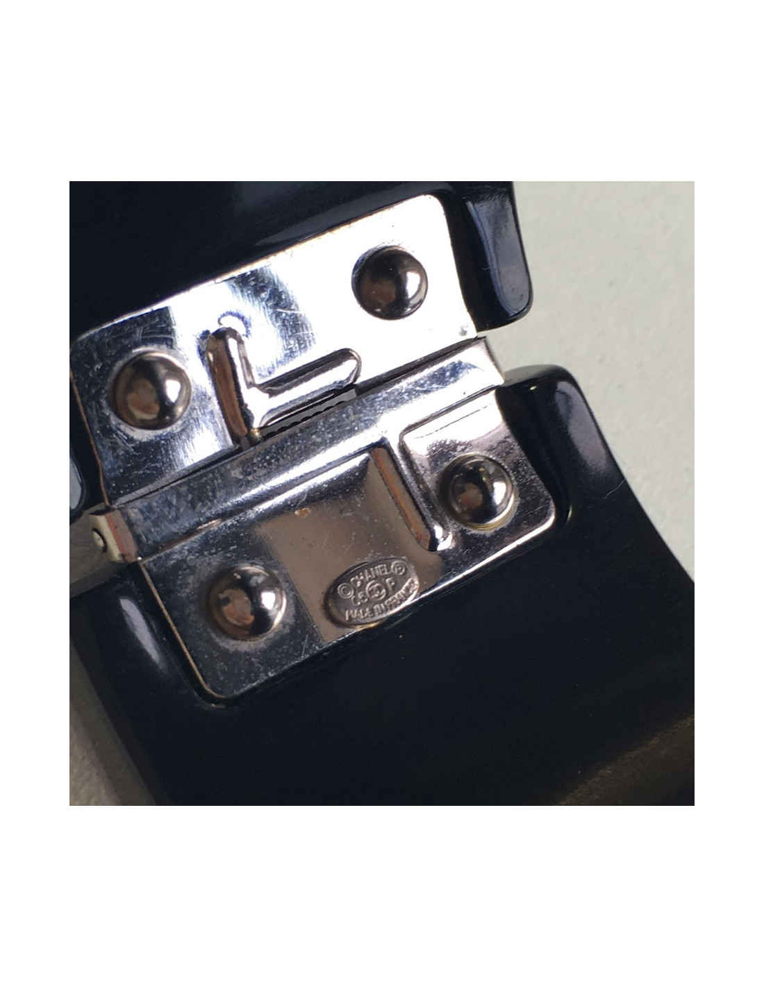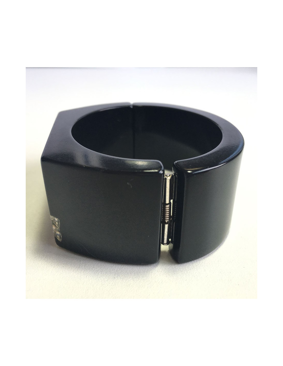 CHANEL cuff in black plastic with inclusion of rhinestones on the front. Join CHANEL in white. Loving clasp.