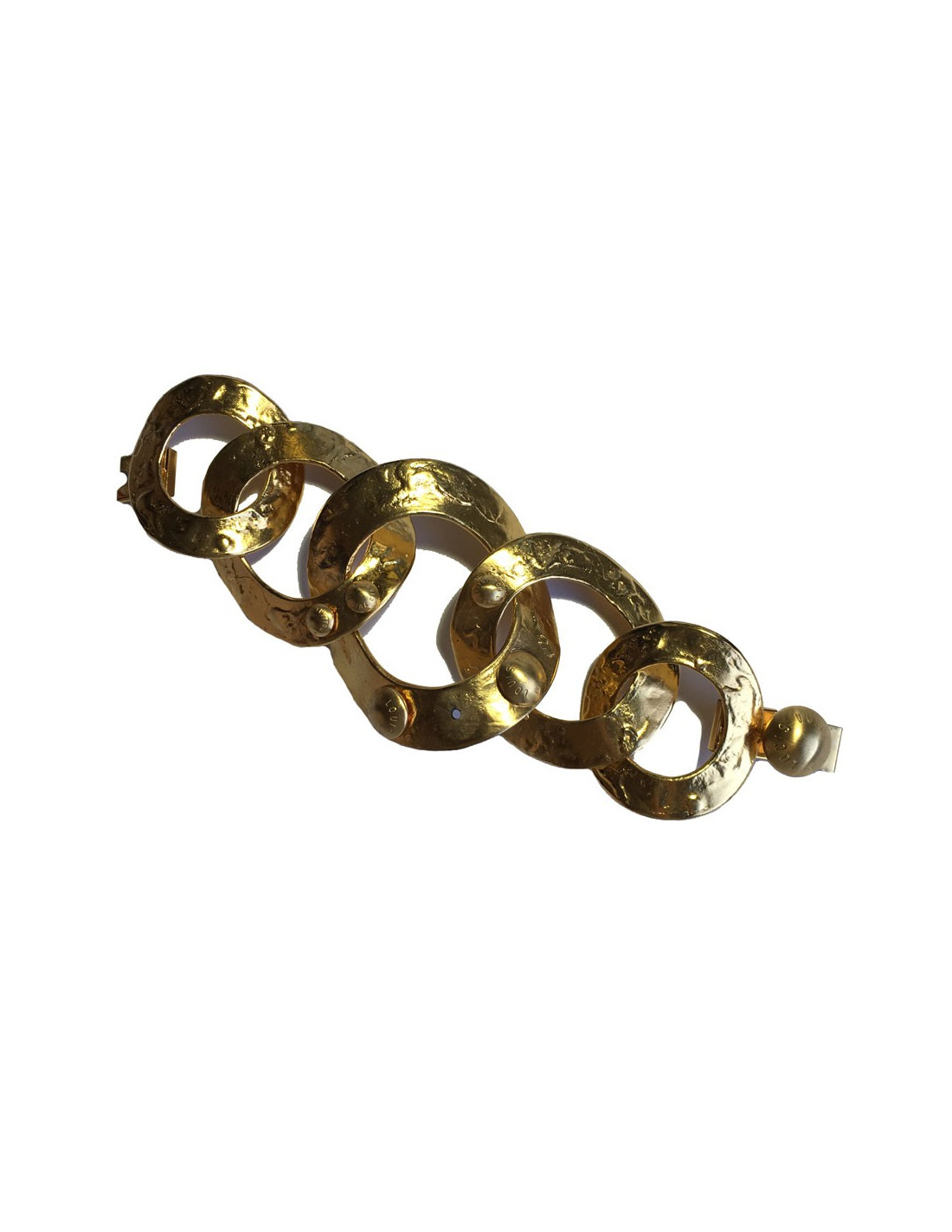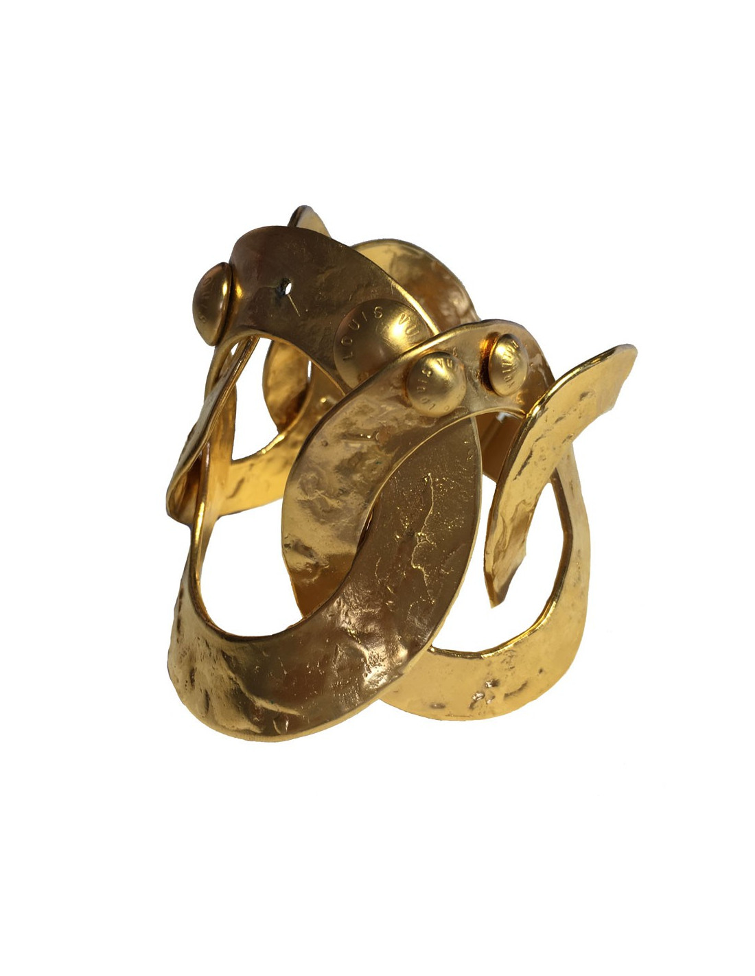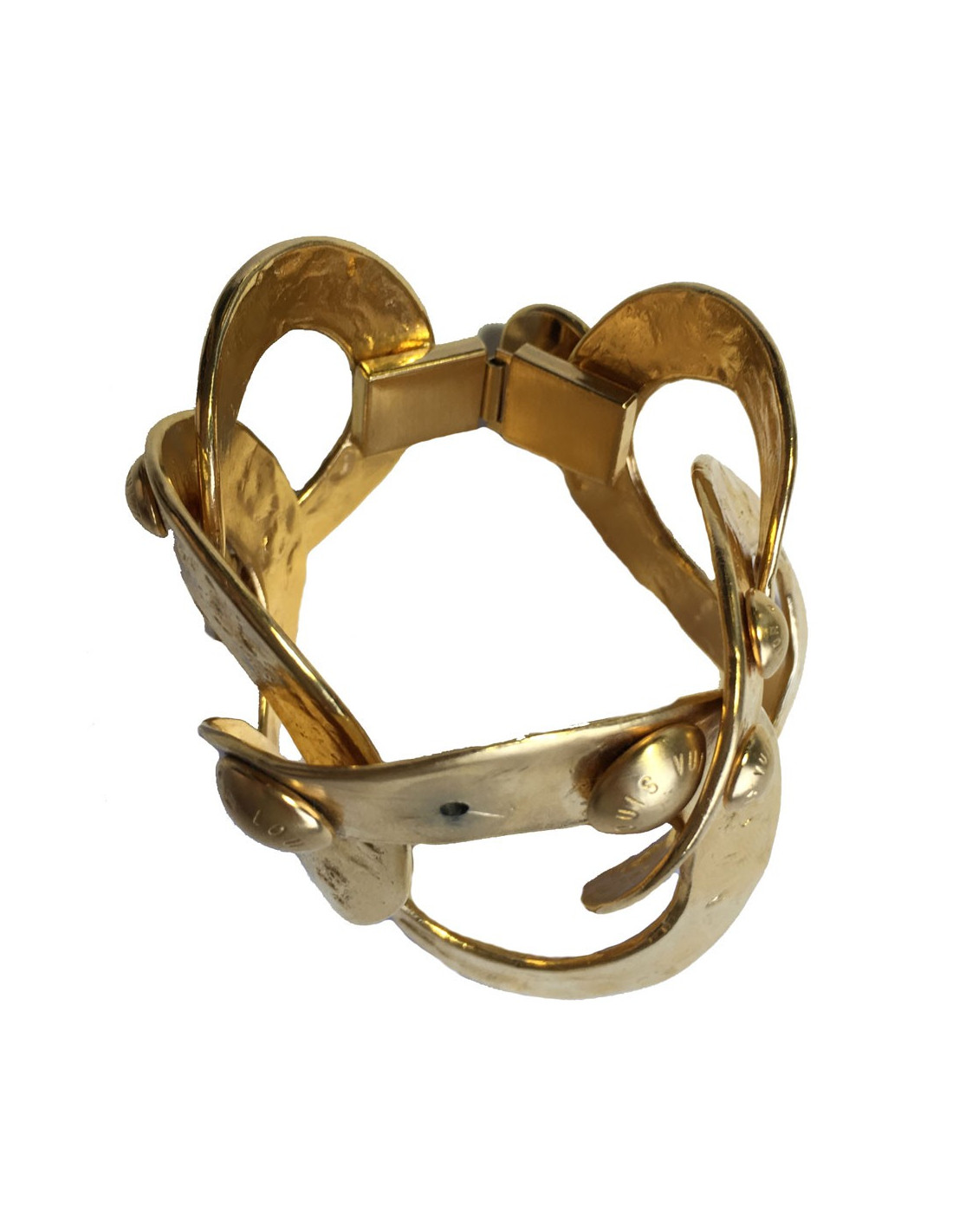 Bracelet LOUIS VUITTON, anneaux en métal plaqué or martelé agrémenté de clous avec la marque gravée dessus. Il manque un clou sur le plus grand anneau (voir photo).