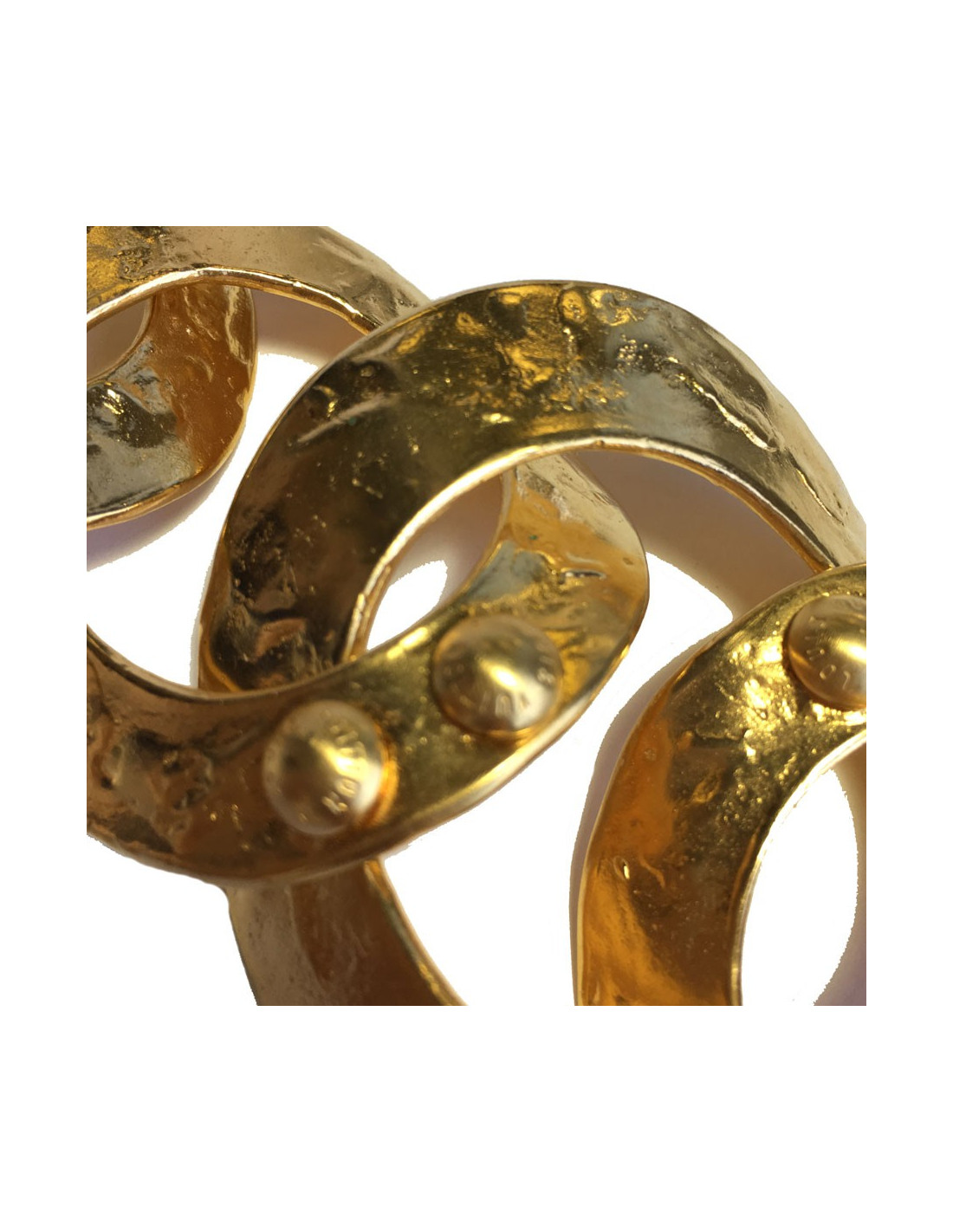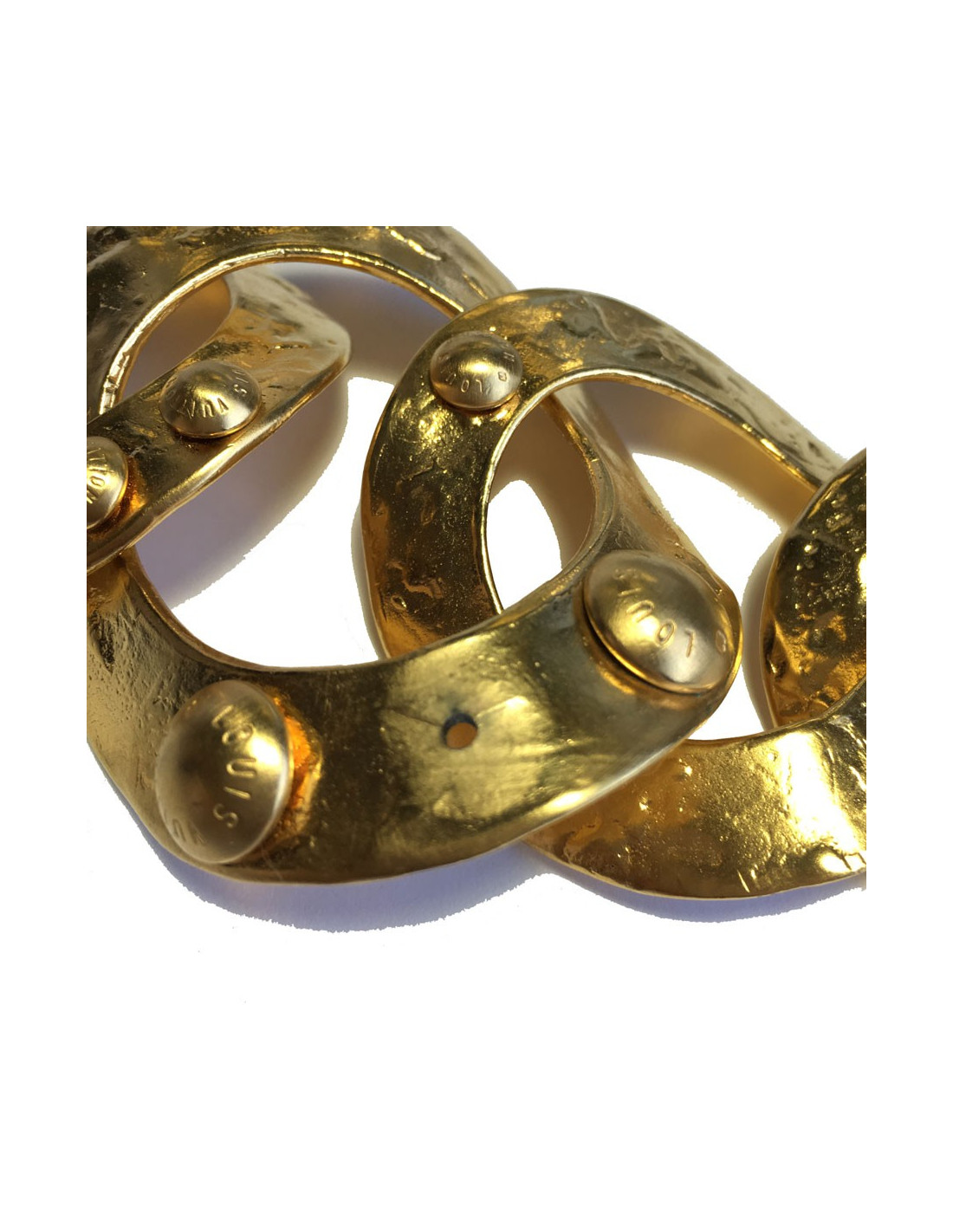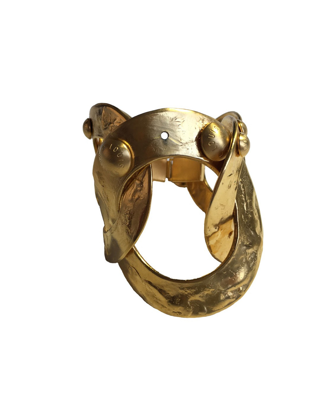 Bracelet LOUIS VUITTON, anneaux en métal plaqué or martelé agrémenté de clous avec la marque gravée dessus. Il manque un clou sur le plus grand anneau (voir photo).