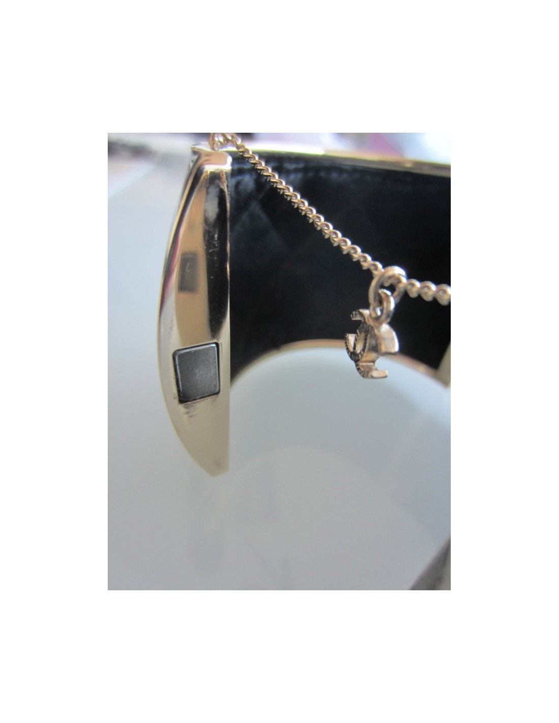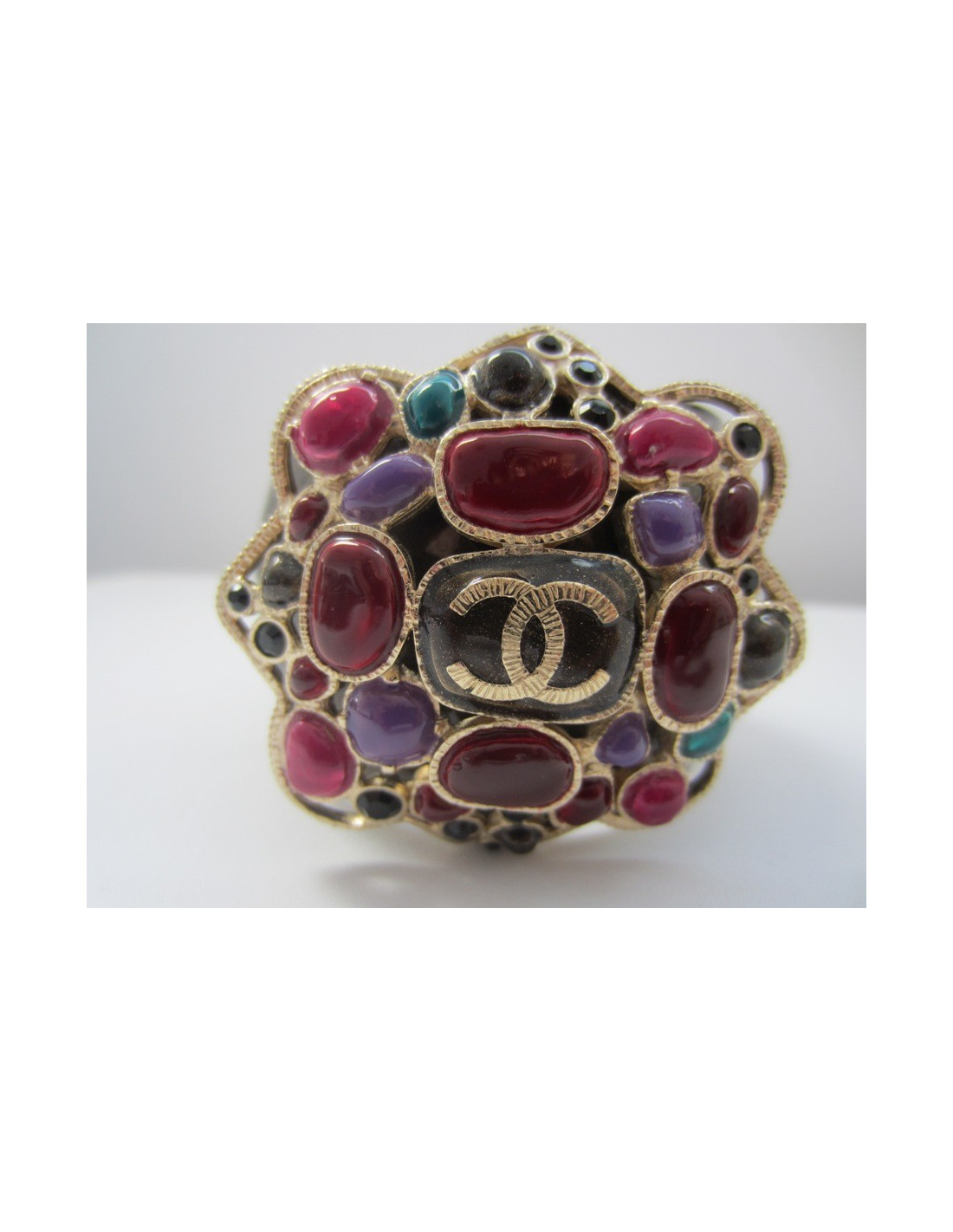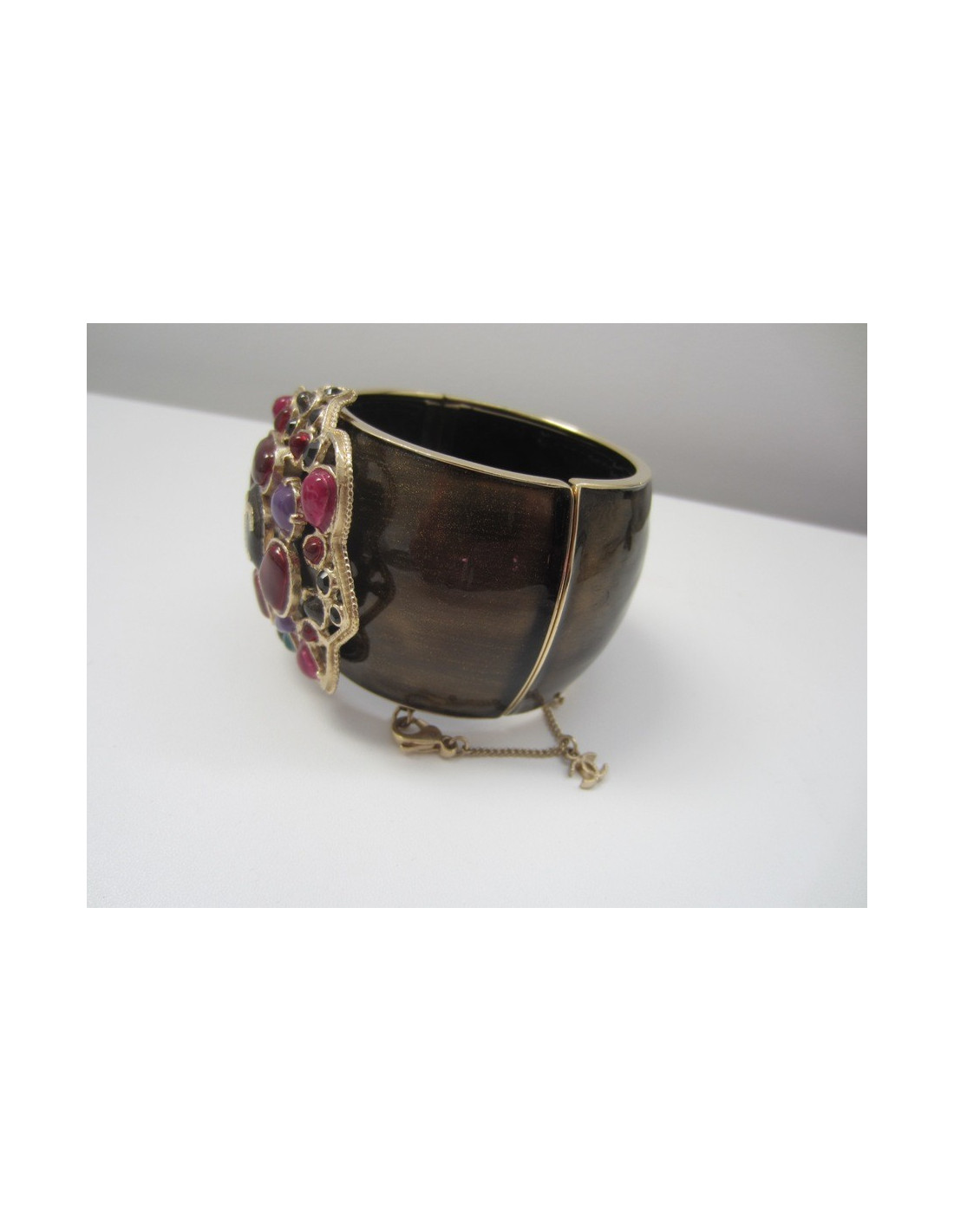 Chanel cuff caramel with a big gem glass fuschia, purple, Green & Black faceted Pearl. Sublime jewel, the Interior is quilted fabric, a small chain of security, it is closed by a magnet.