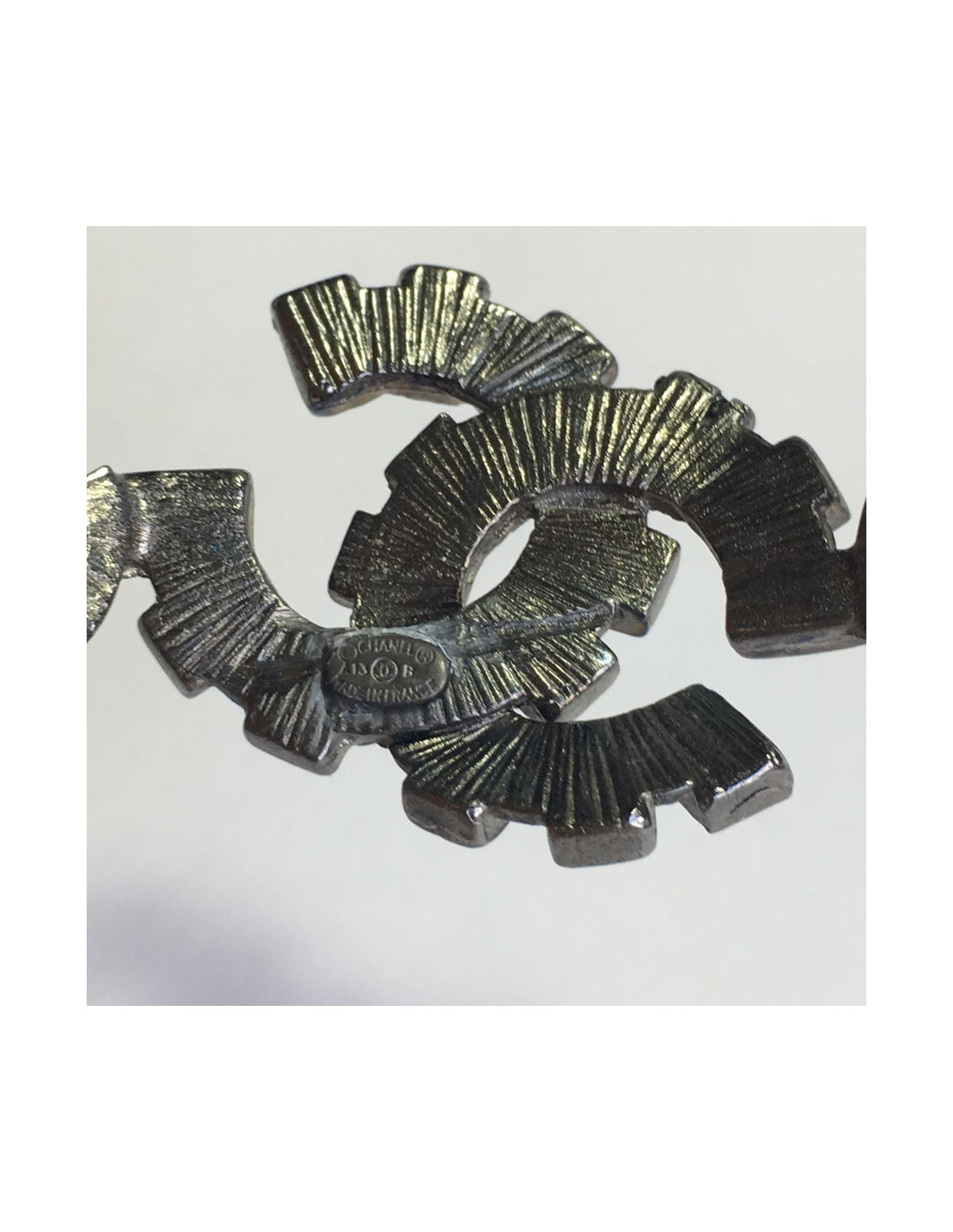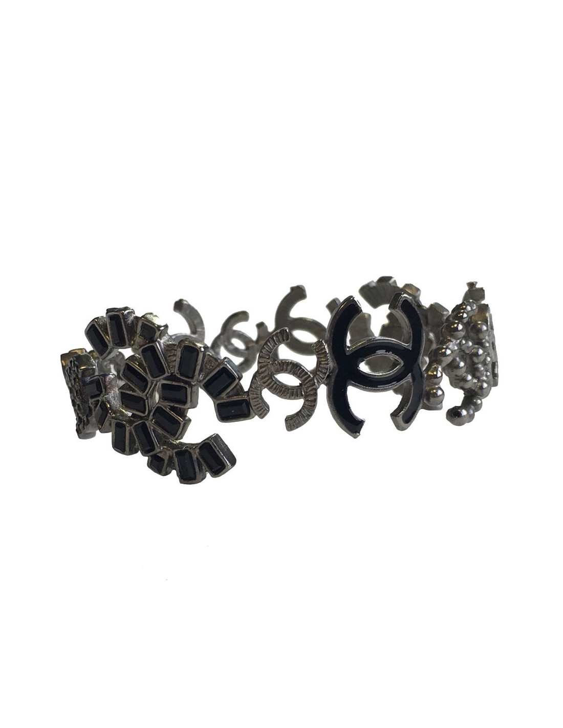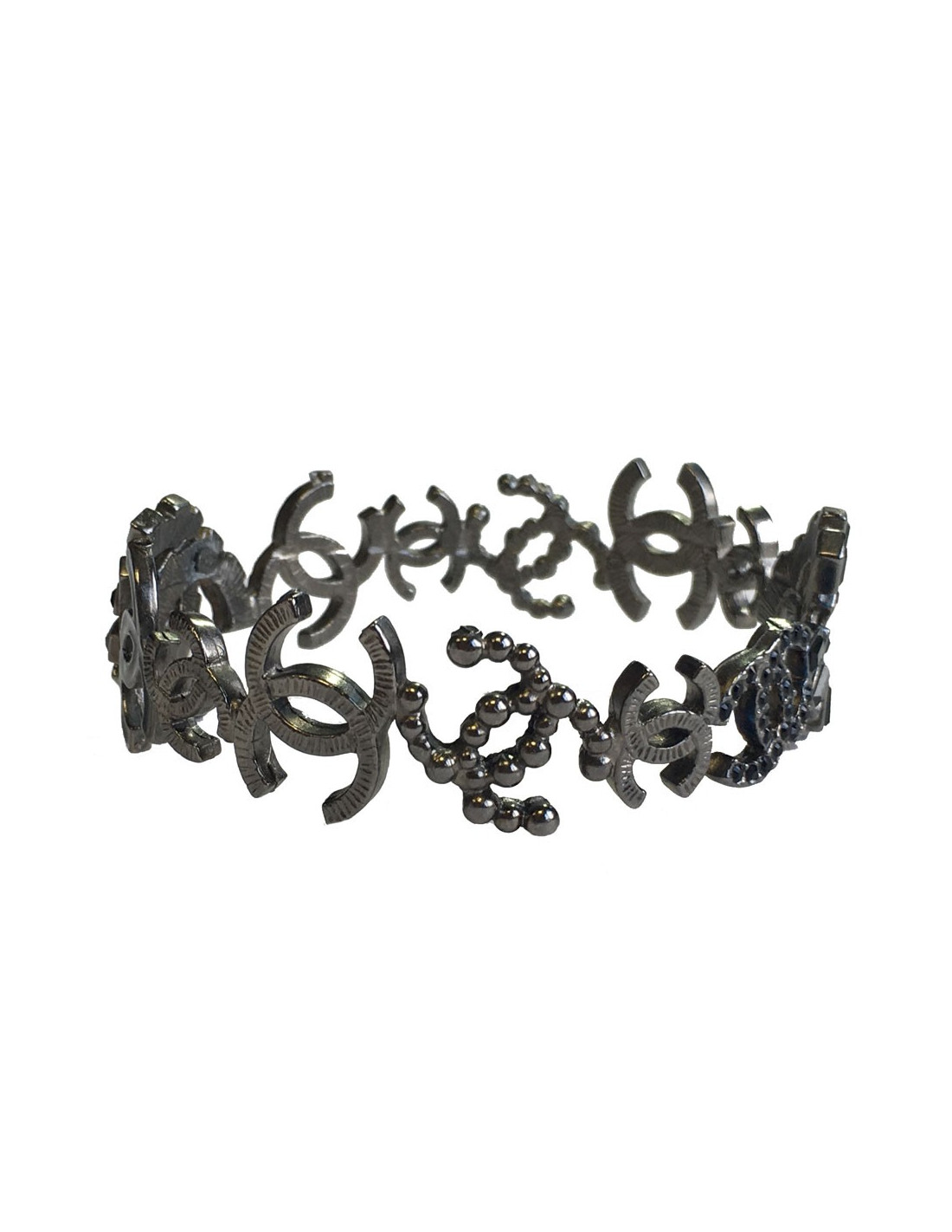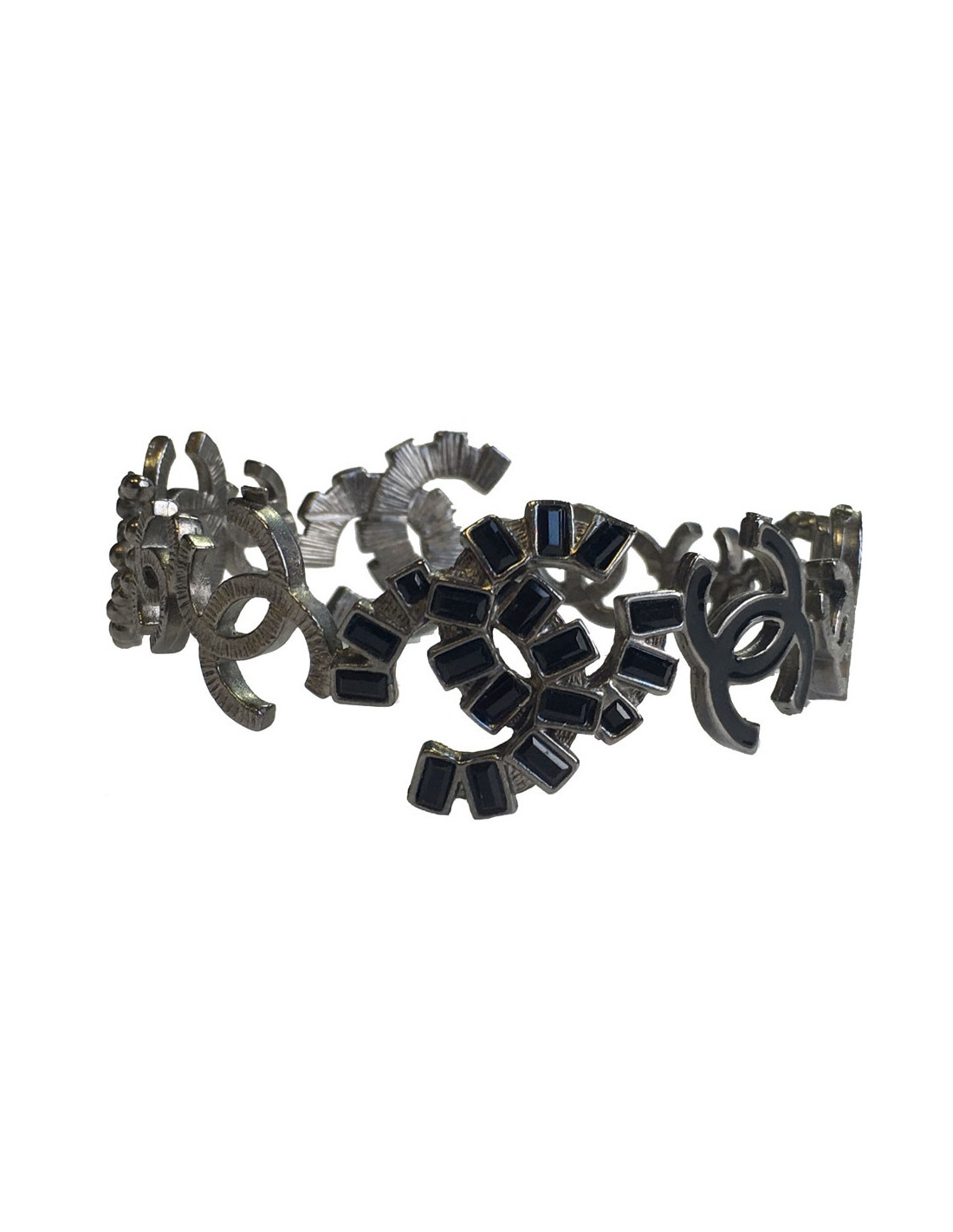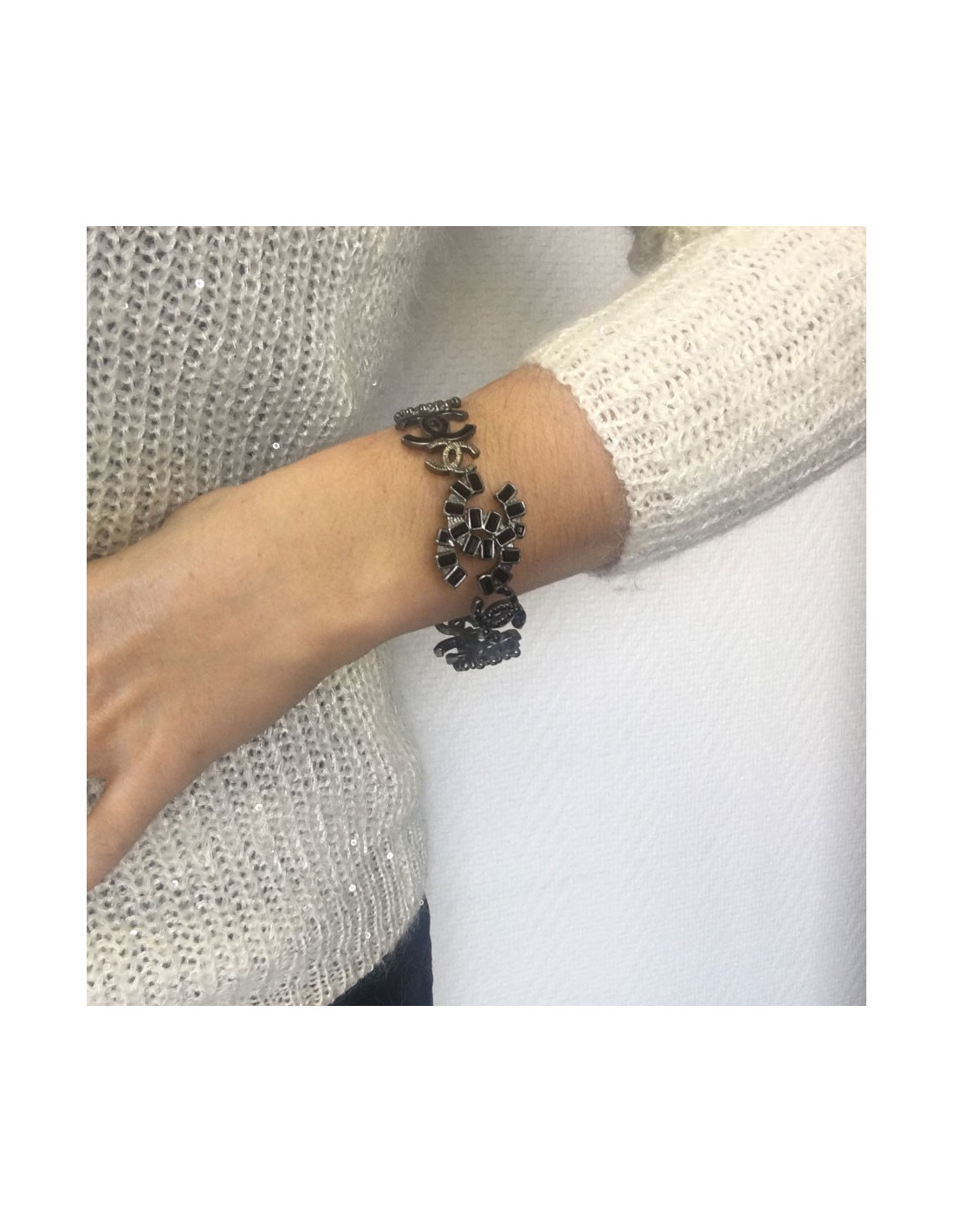 Superbe bracelet CHANEL CC de toutes tailles en métal ruthénium. Les CC sont sertis de strass noirs, strass baguette, résine noire. Certains CC sont en métal argenté.