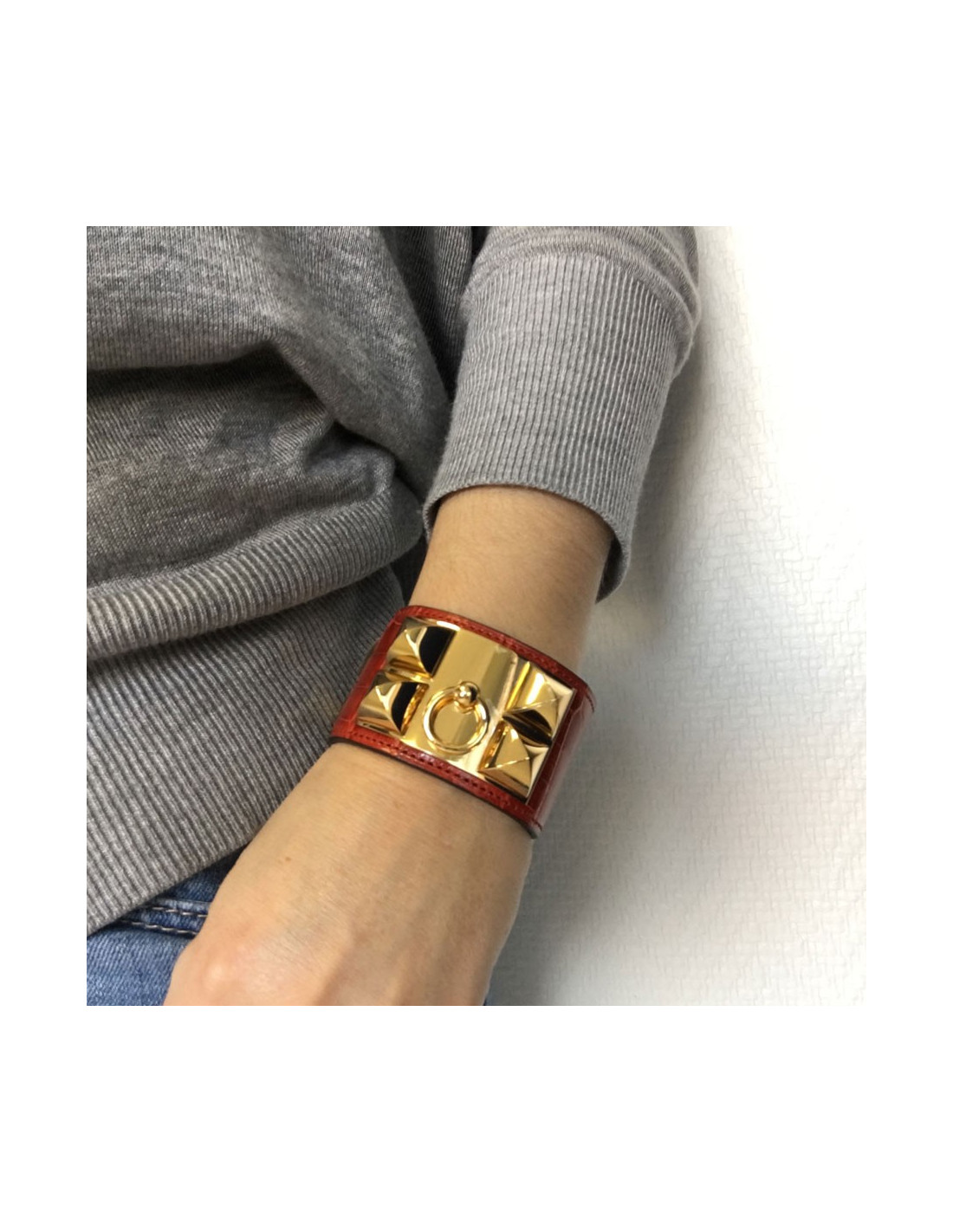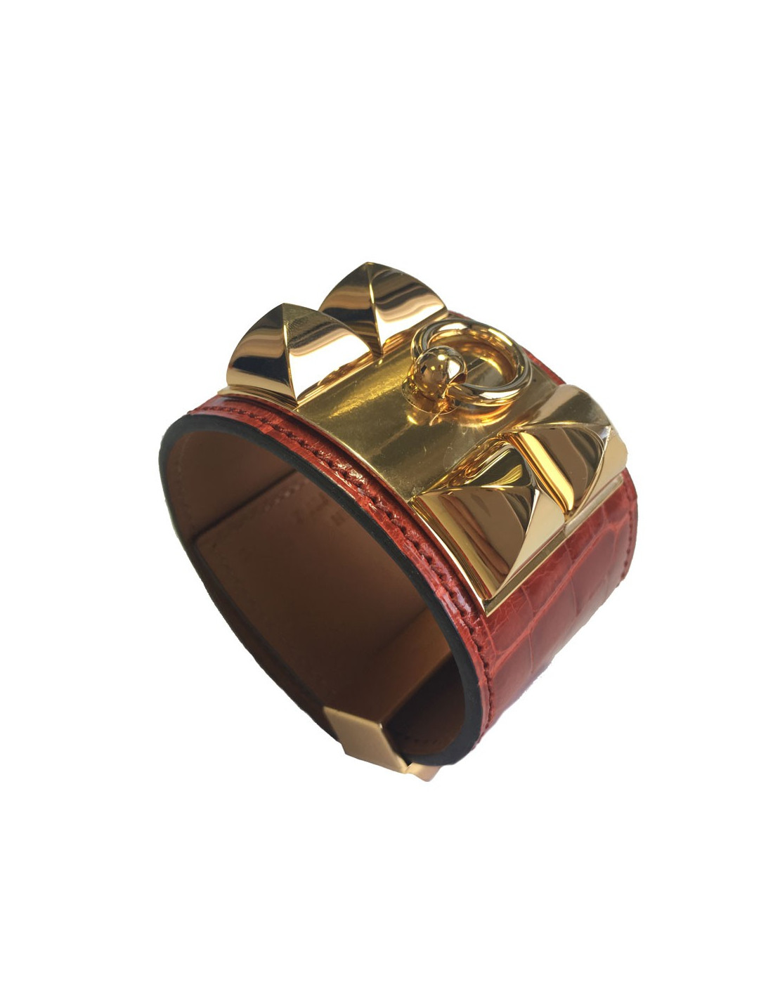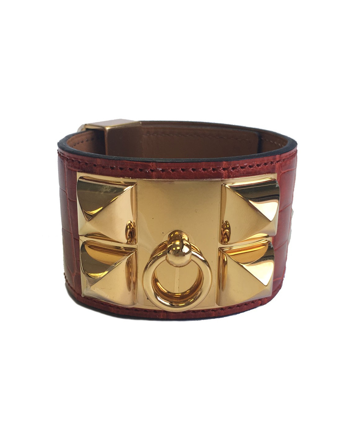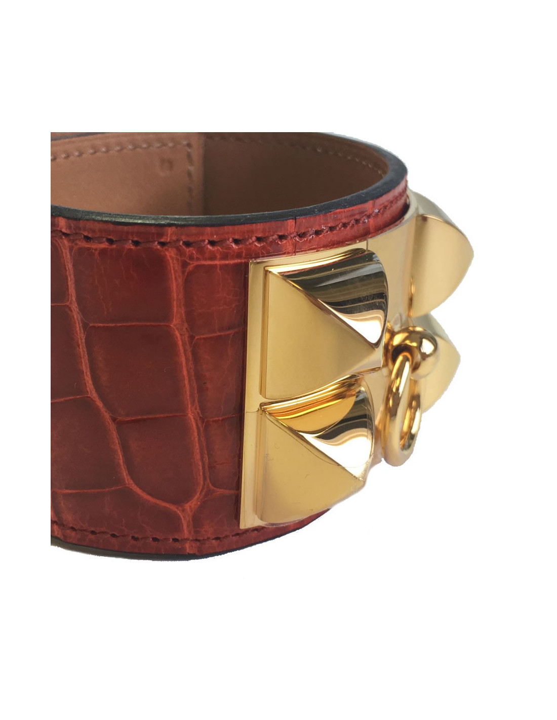 Hermès Dog Collar cuff in blood-colored Mississippi alligator. Clasp in gilded brass finish. New condition. Letter T (year 2015). S sales