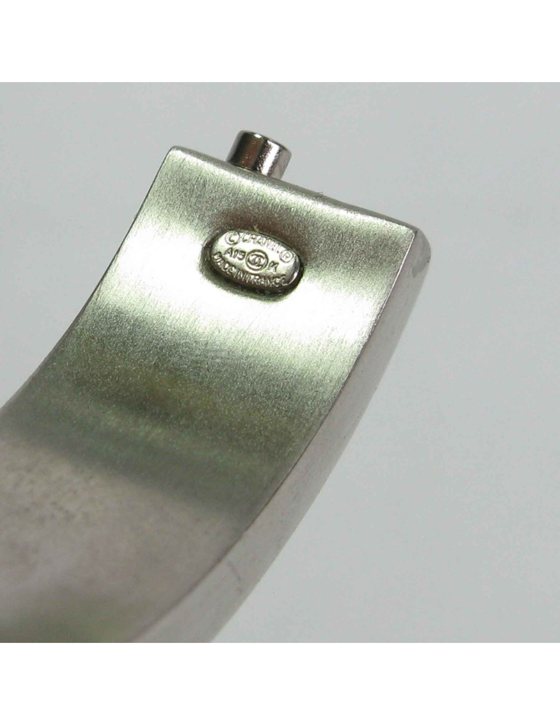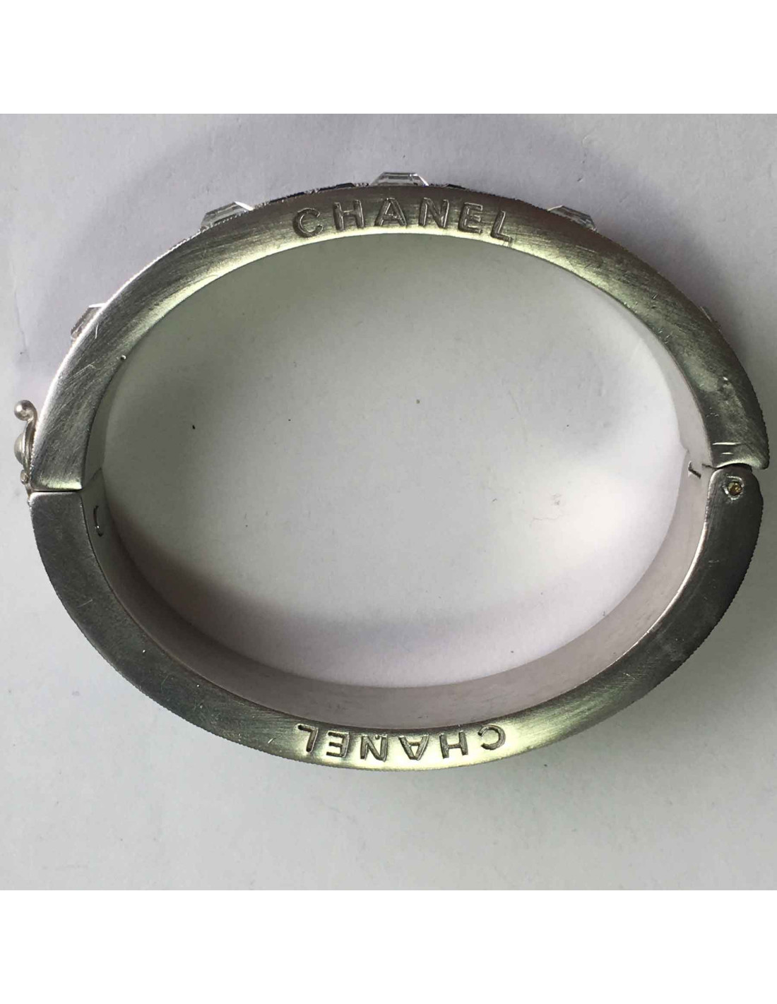 Bracelet Chanel rigide en métal argenté brossé serti sur tout le pourtour de strass noirs et brillants. La marque CHANEL est gravée sur le métal.