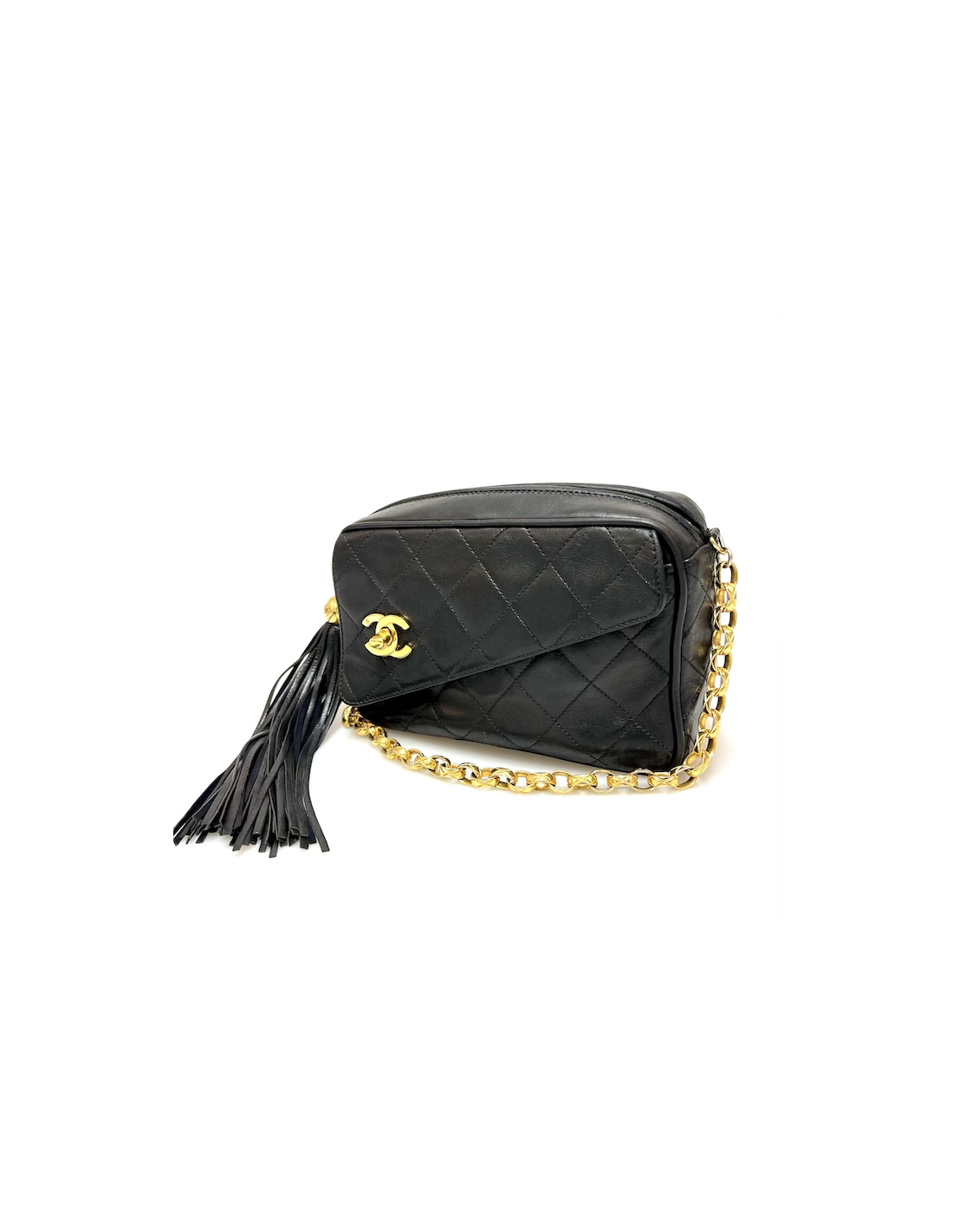 Last items in stock CAMERA CHANEL CHANEL vintage Camera GM bag CHANEL 34571 4,300.00 € Chanel black Caméra GM bag Condition : very goodMade in ItalyCollection : Caméra grand modèleGender : womanMaterial : leatherLining : black leatherColor : blackMeasurements : 27 x 20 x 8 cmShoulder strap : 104 cmHologram: noAuthenticity card : yesYear : 1989-1991Hardware :24K gold plated metalDetails : iconic pompn tassel Add to cart