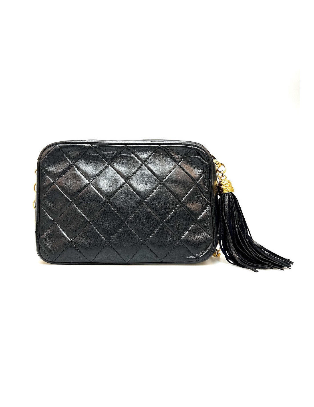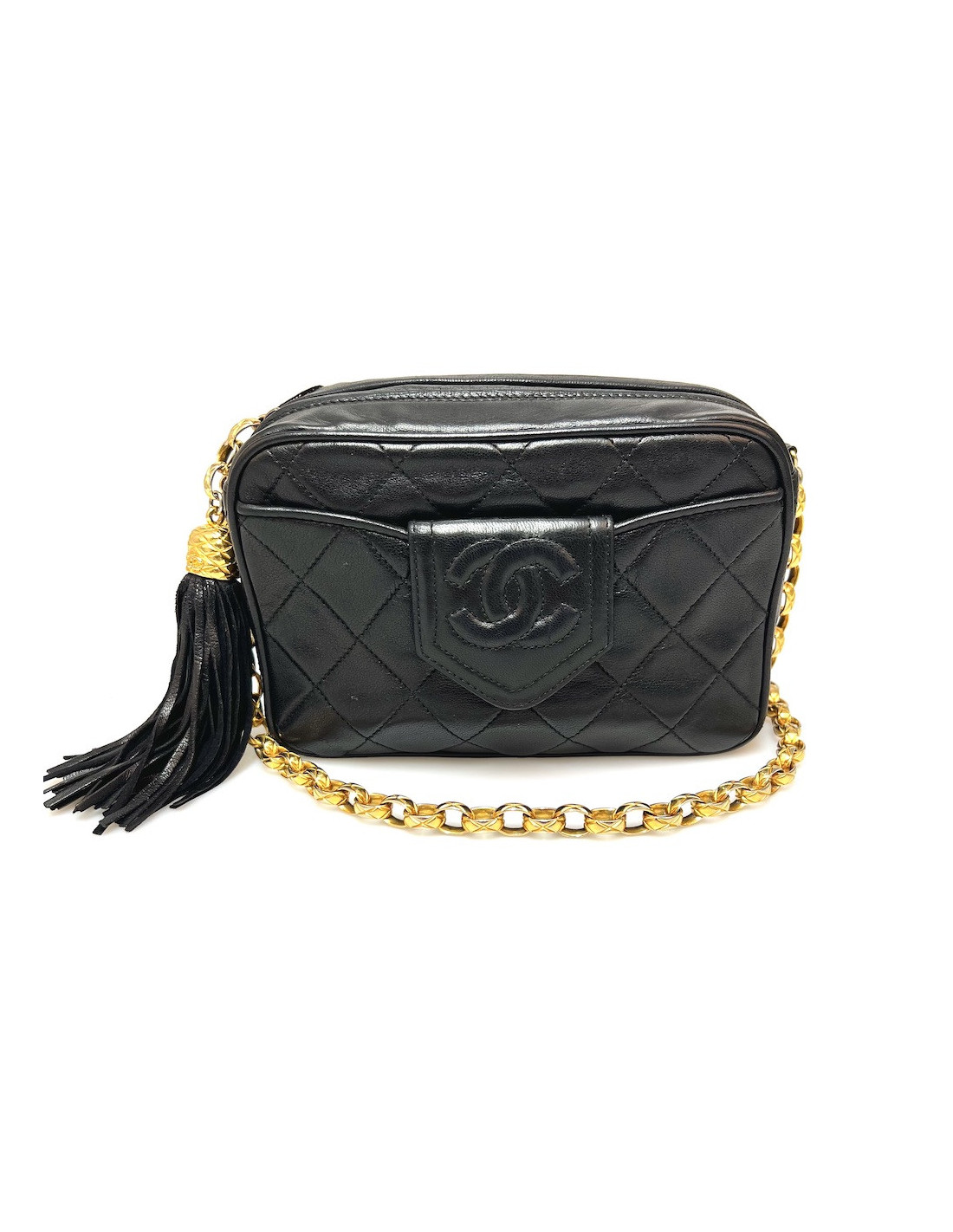 Last items in stock CAMERA CHANEL CHANEL vintage Camera GM bag CHANEL 34571 4,300.00 € Chanel black Caméra GM bag Condition : very goodMade in ItalyCollection : Caméra grand modèleGender : womanMaterial : leatherLining : black leatherColor : blackMeasurements : 27 x 20 x 8 cmShoulder strap : 104 cmHologram: noAuthenticity card : yesYear : 1989-1991Hardware :24K gold plated metalDetails : iconic pompn tassel Add to cart