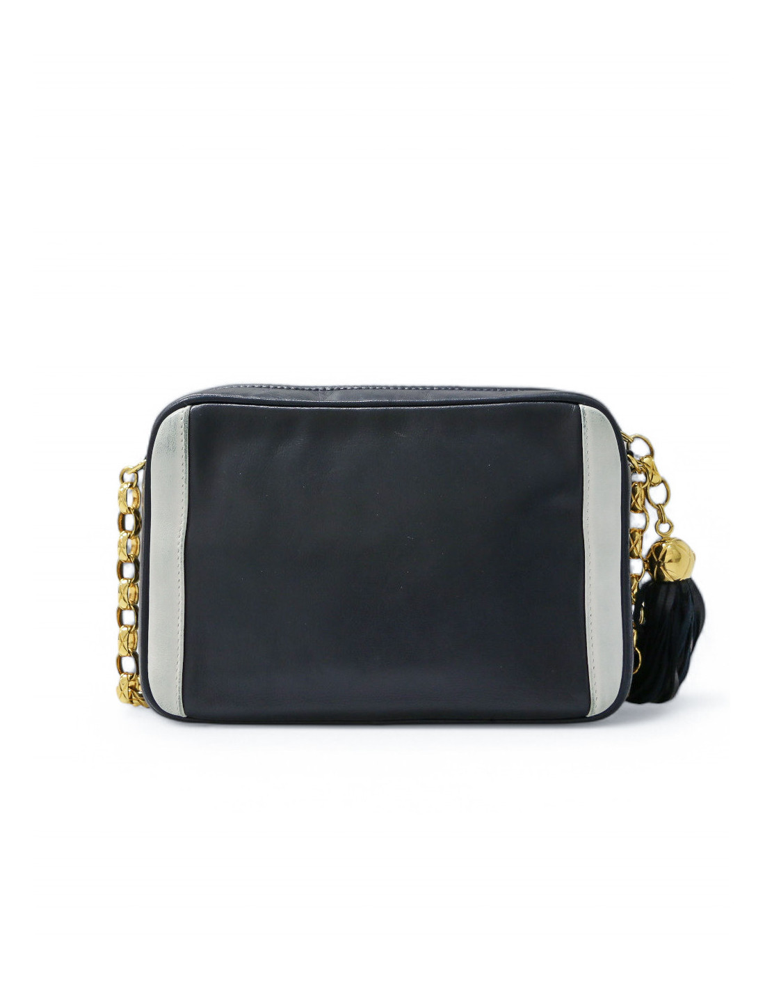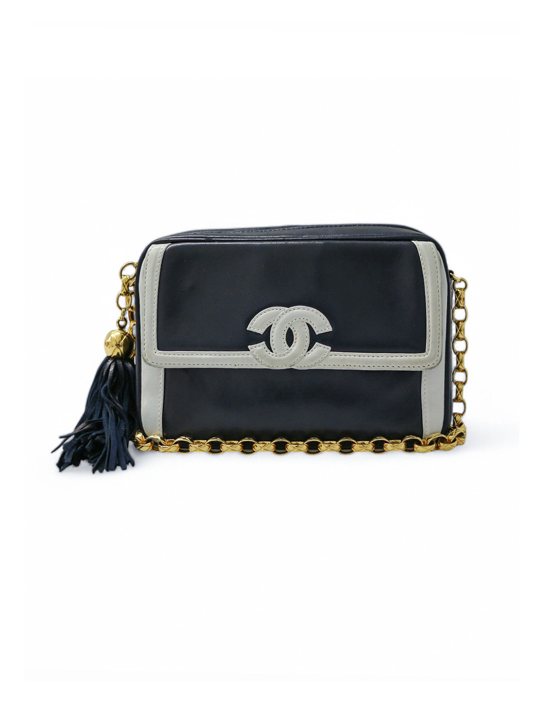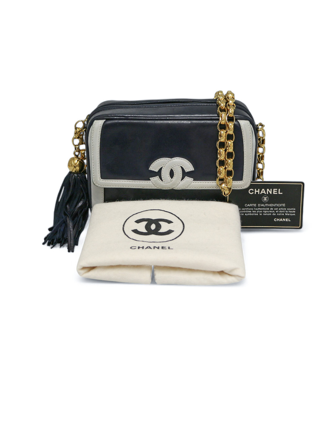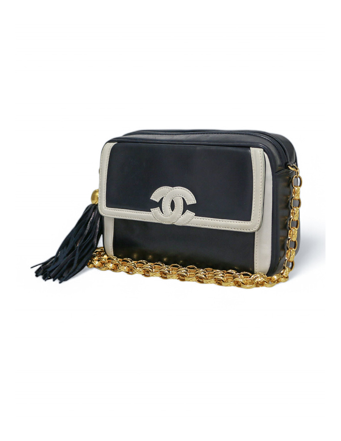 Last items in stock CAMERA CHANEL CHANEL vintage Camera GM bag CHANEL 34571 4,300.00 € Chanel black Caméra GM bag Condition : very goodMade in ItalyCollection : Caméra grand modèleGender : womanMaterial : leatherLining : black leatherColor : blackMeasurements : 27 x 20 x 8 cmShoulder strap : 104 cmHologram: noAuthenticity card : yesYear : 1989-1991Hardware :24K gold plated metalDetails : iconic pompn tassel Add to cart