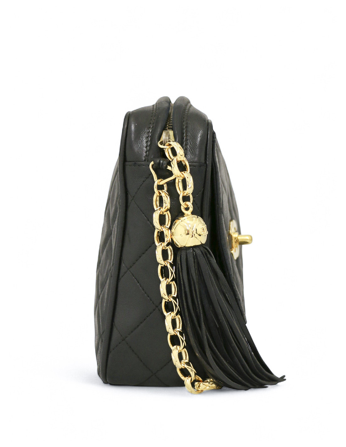 Last items in stock CAMERA CHANEL CHANEL vintage Camera GM bag CHANEL 34571 4,300.00 € Chanel black Caméra GM bag Condition : very goodMade in ItalyCollection : Caméra grand modèleGender : womanMaterial : leatherLining : black leatherColor : blackMeasurements : 27 x 20 x 8 cmShoulder strap : 104 cmHologram: noAuthenticity card : yesYear : 1989-1991Hardware :24K gold plated metalDetails : iconic pompn tassel Add to cart