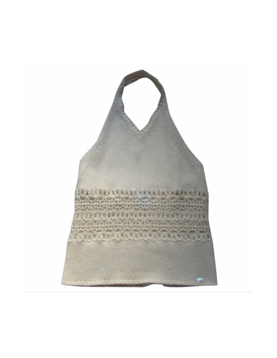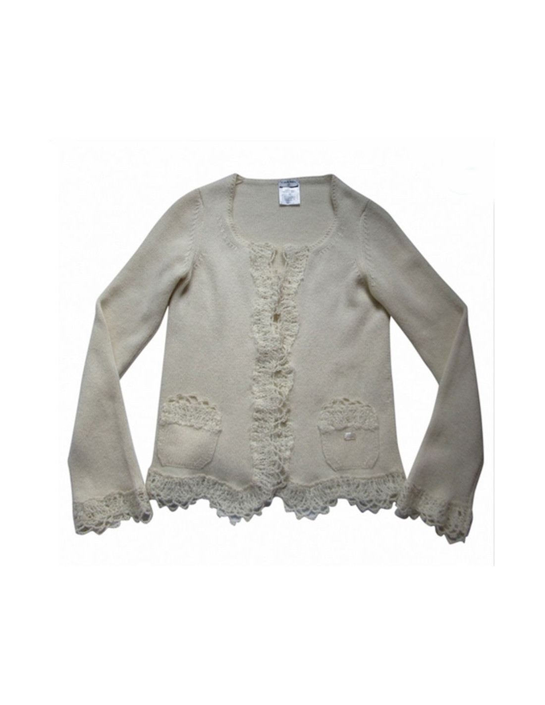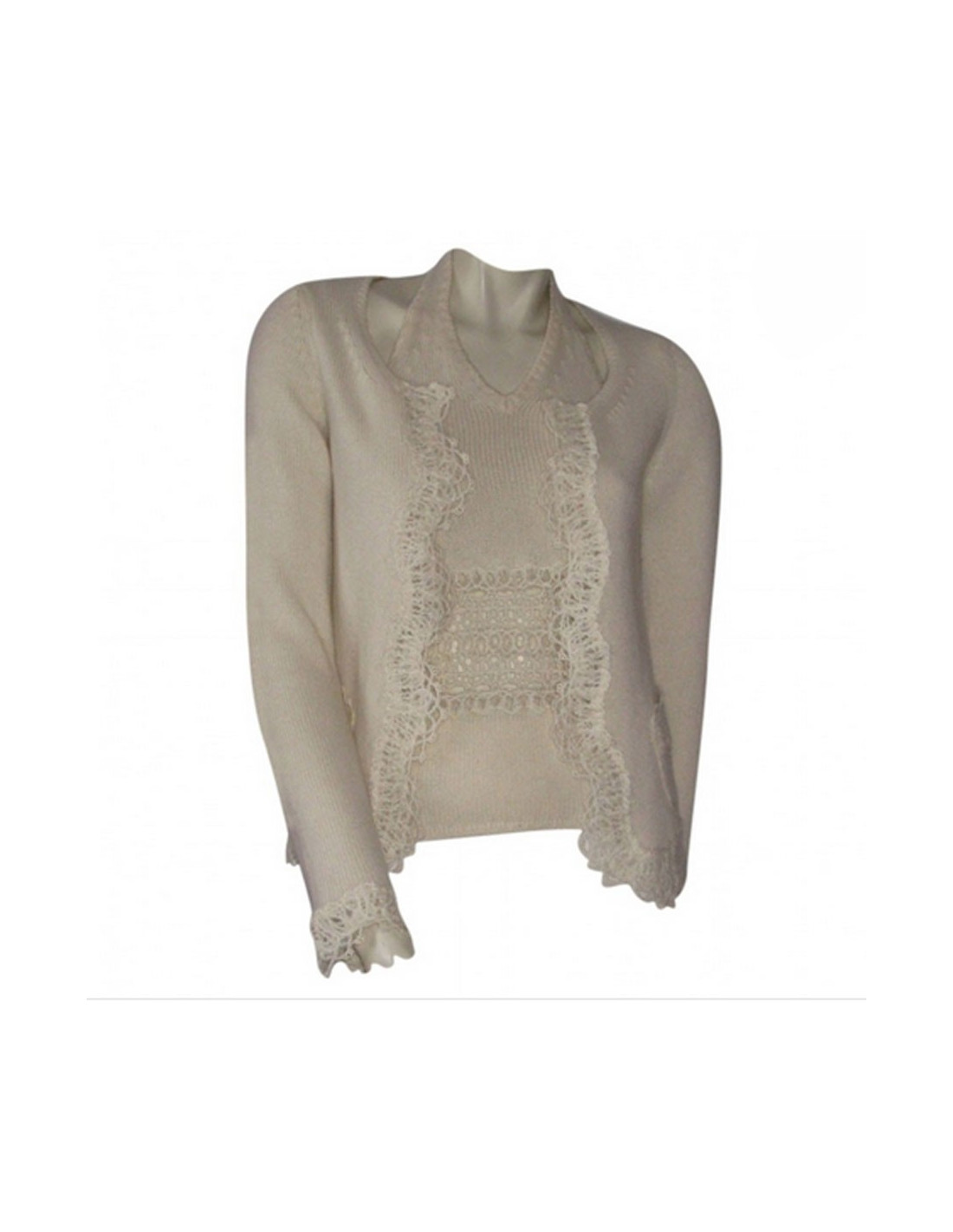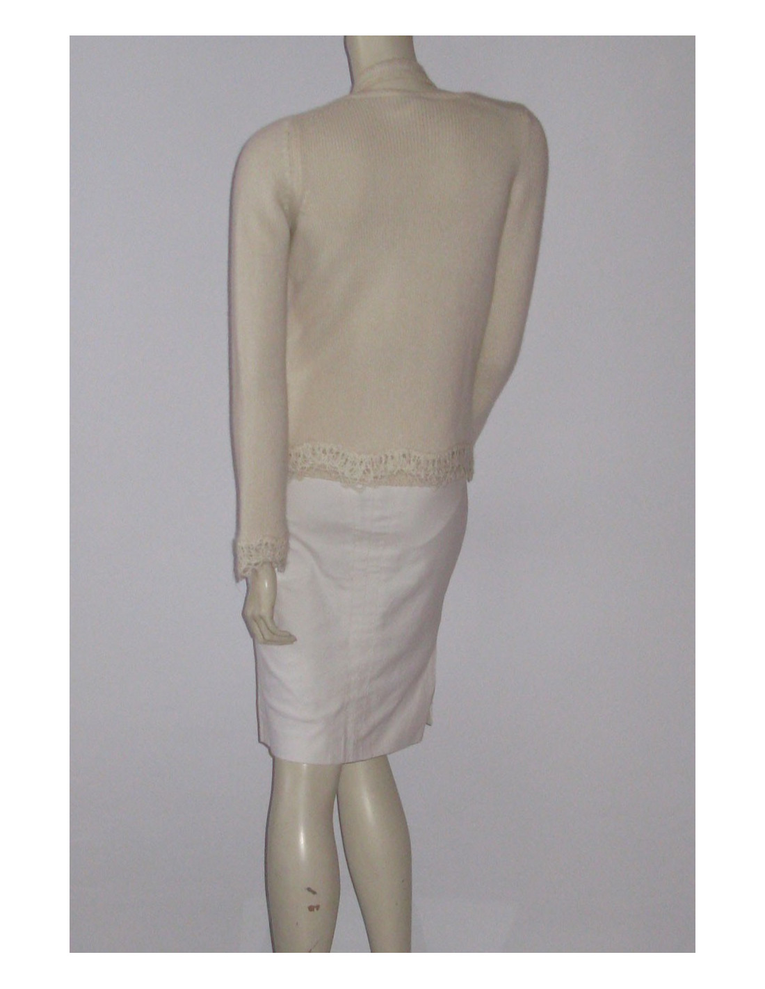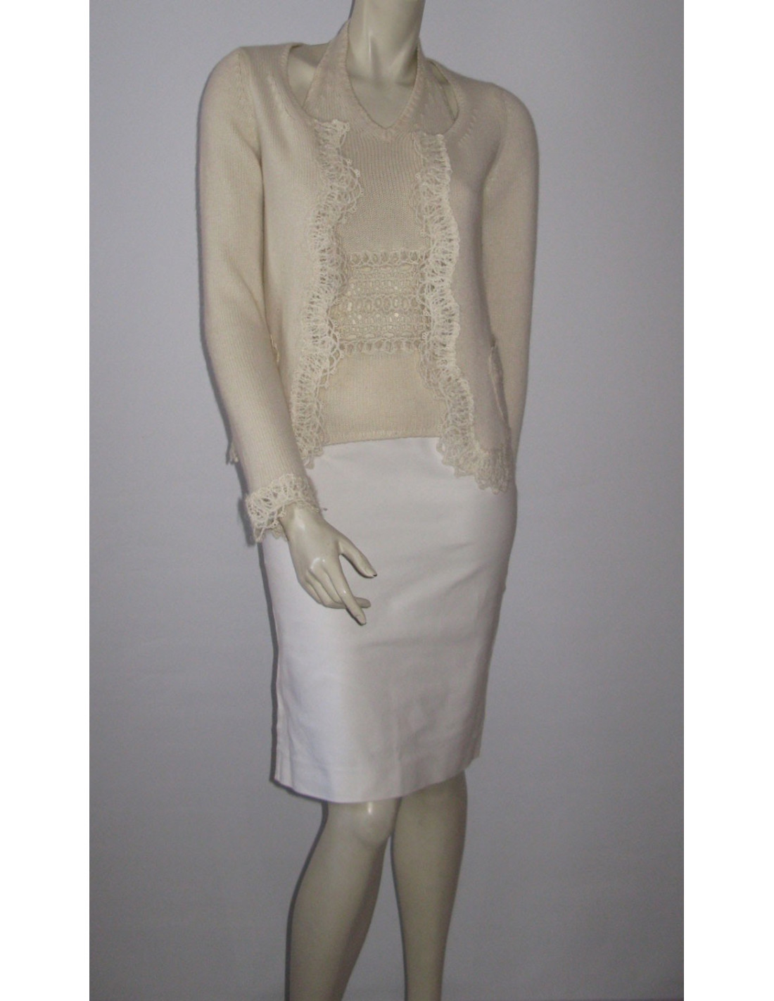 Twinset CHANEL beige cashmere collection cruise 2006. This twinset is composed of a jacket in cashmere and crochet beige size 38 and a halter in cashmere and hook size 36 top. The vest has two small lower pockets. The top and the vest are decorated with a small white mother-of-Pearl plaque on which is inscribed CHANEL. The top has a small spot of Brown makeup on the pass. Jacket length: 54 cm, Sleeve jacket length: 64 cm Shoulder width: 34 cm, Chest width: 38 cm Top length: 60 cm, Chest top width: 36 cm Top neck circumference: 54 cm