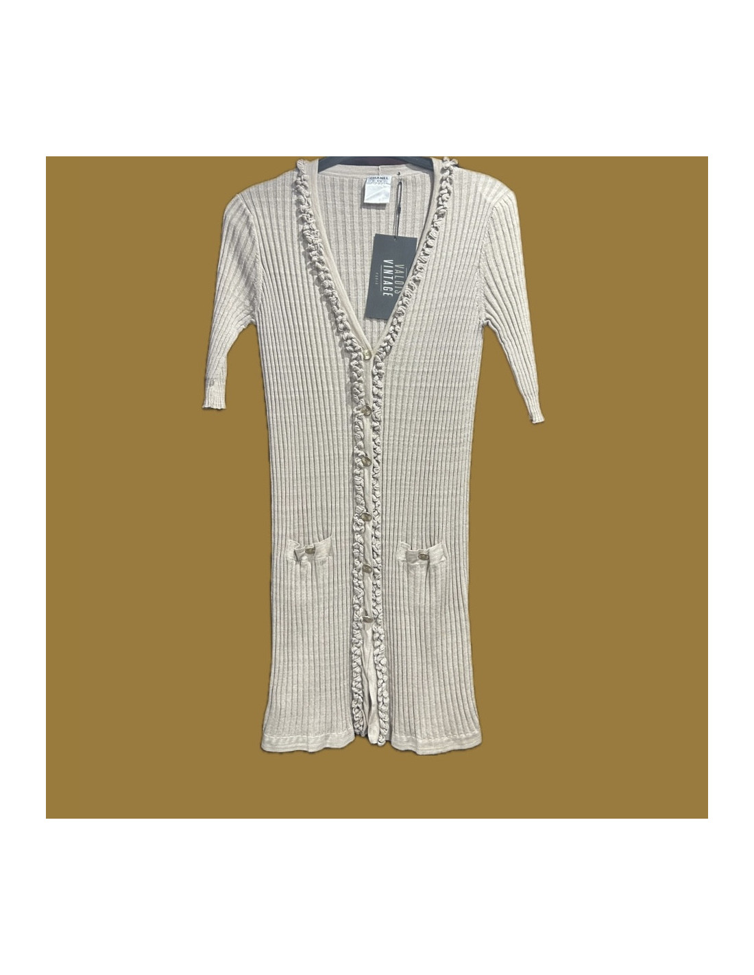 Last items in stock CARDIGANS-VEST-KNITWEAR CHANEL long blue cashmere cardigan CHANEL 31133 1,300.00 € CHANEL long blue cashmere cardigan Condition : very goodSize : 40-42FR (no tag)Color : navy blueMaterial : cashmereMeasurements : shoulders: 50 cm , underbust: 55 cm x height: 78 cm x bottom: 38 cm x sleeves length 58 cm x wrist circumference: 20 cm Add to cart