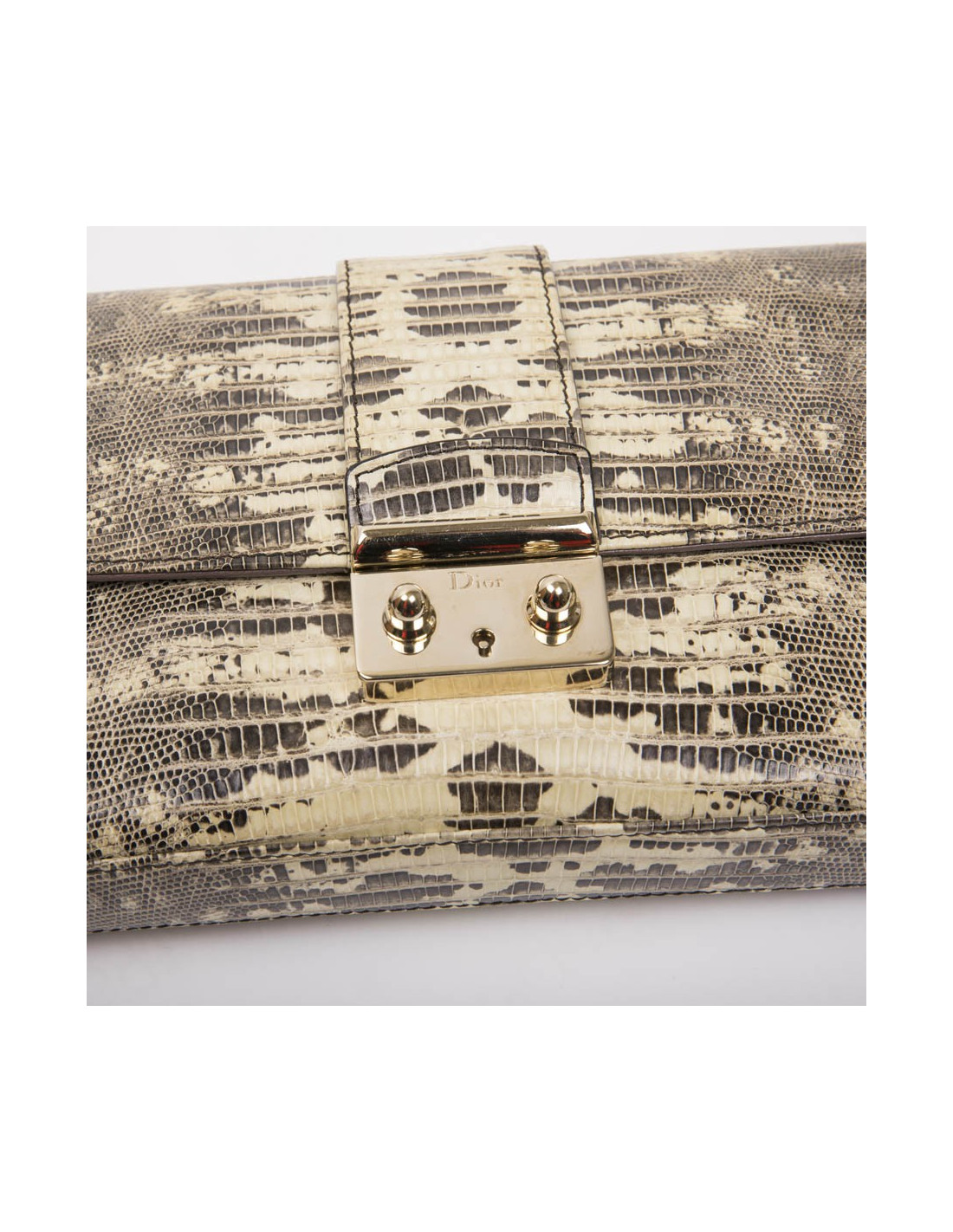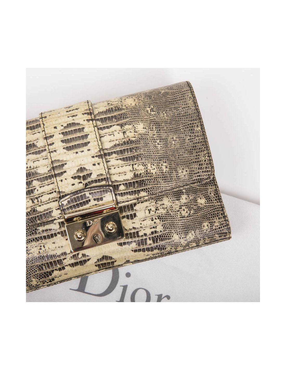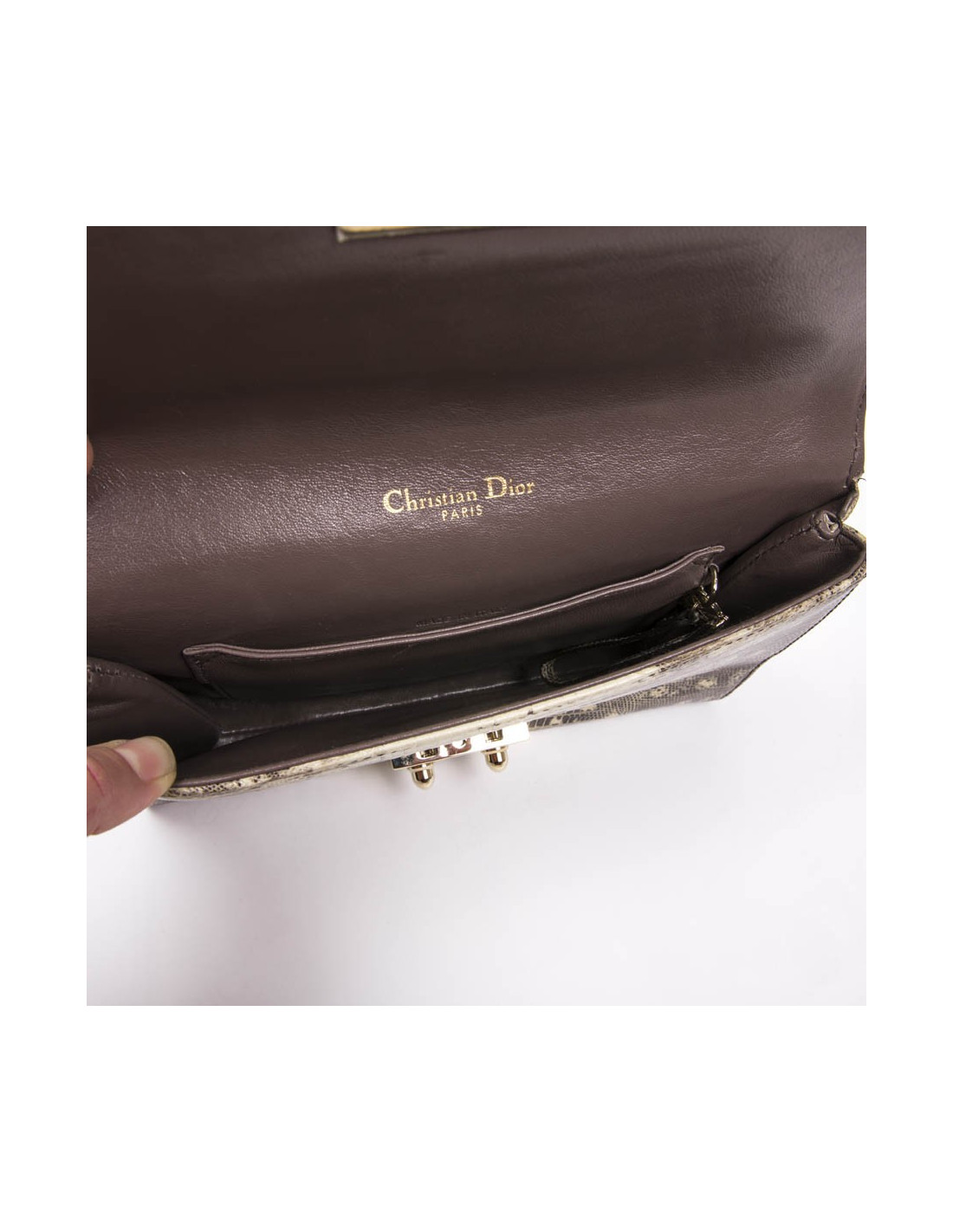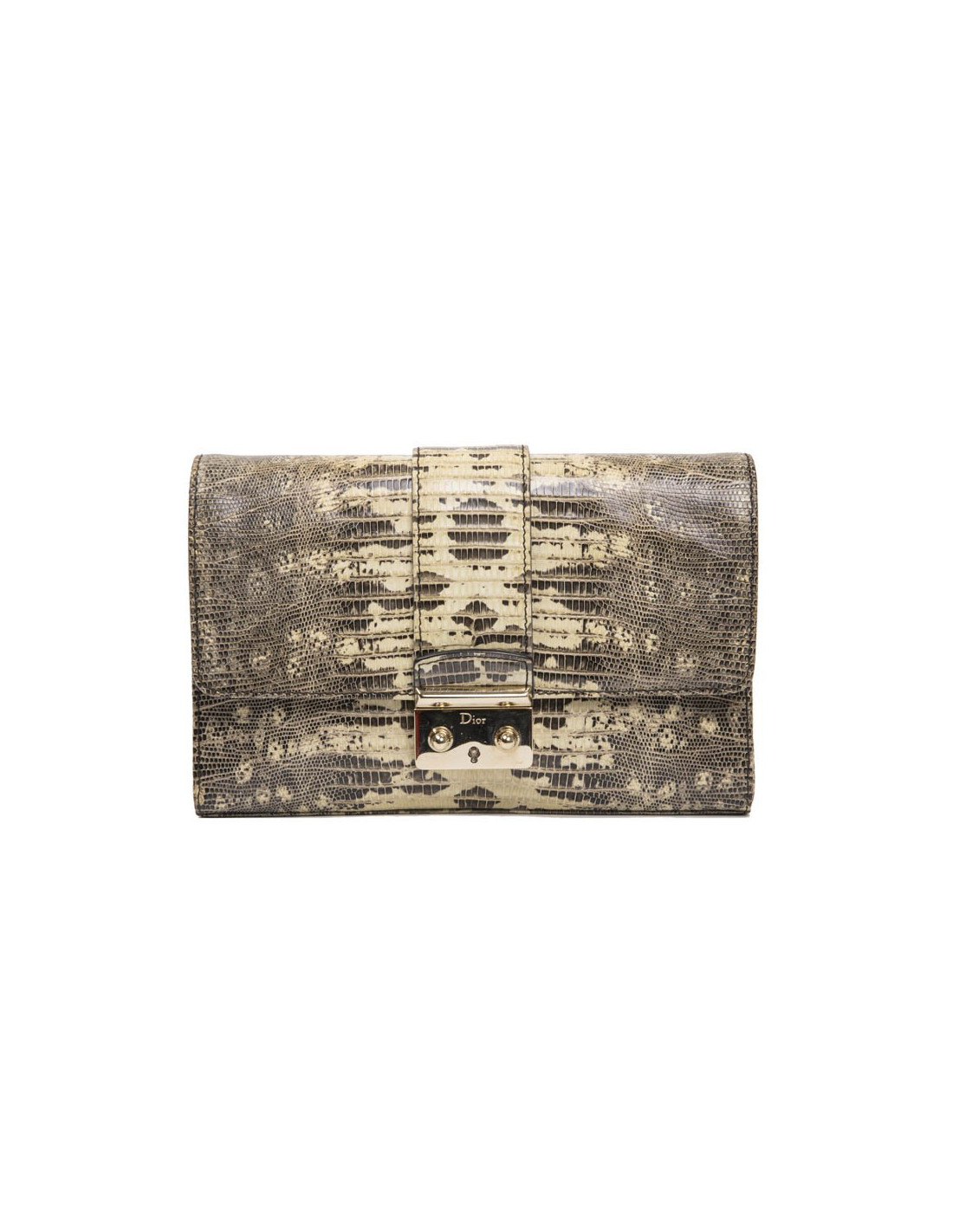 Dior clutch in water snake skin. Signature clasp in shiny gold metal hardware. The interior is in light brown leather (pen mark) with a patch pocket.