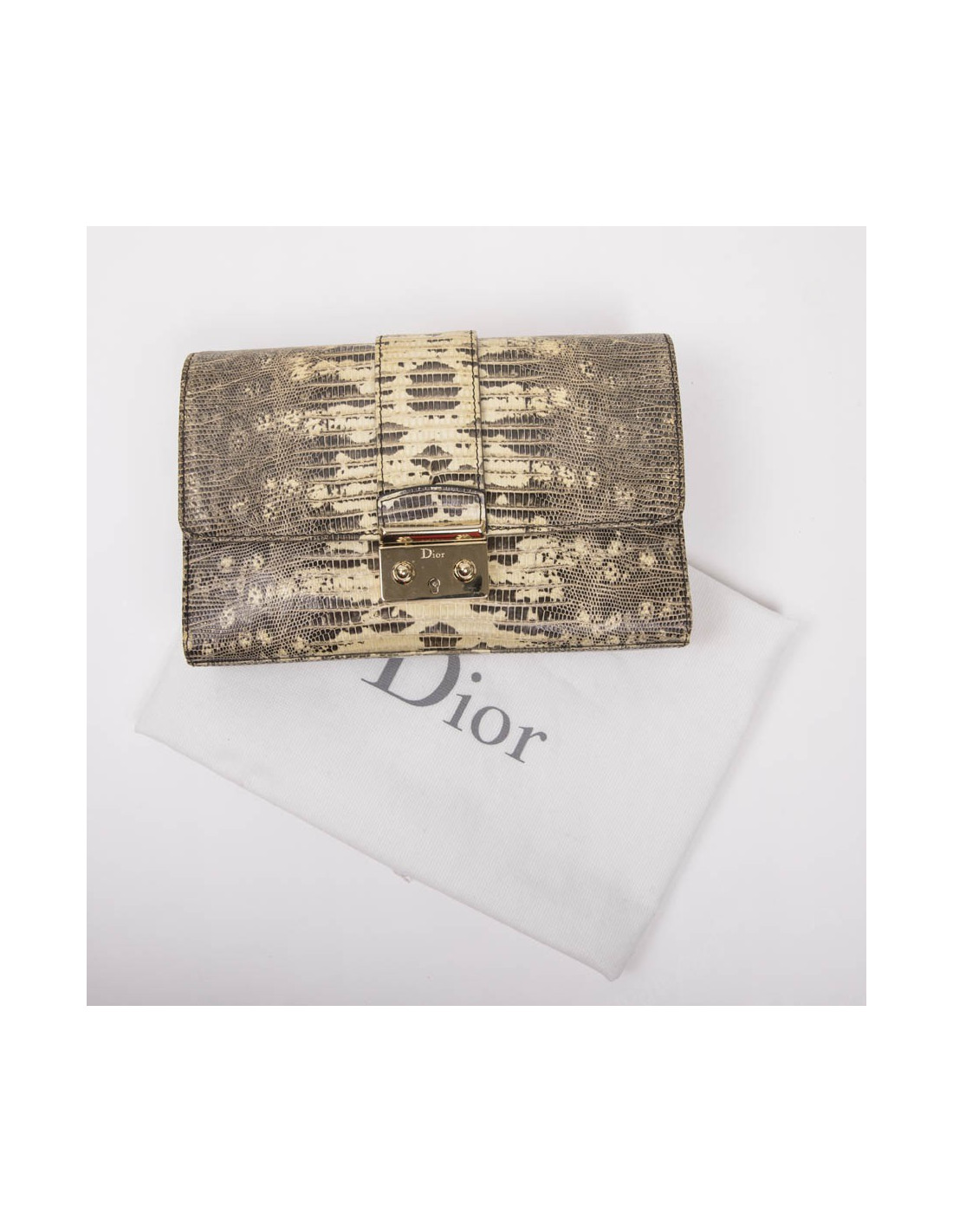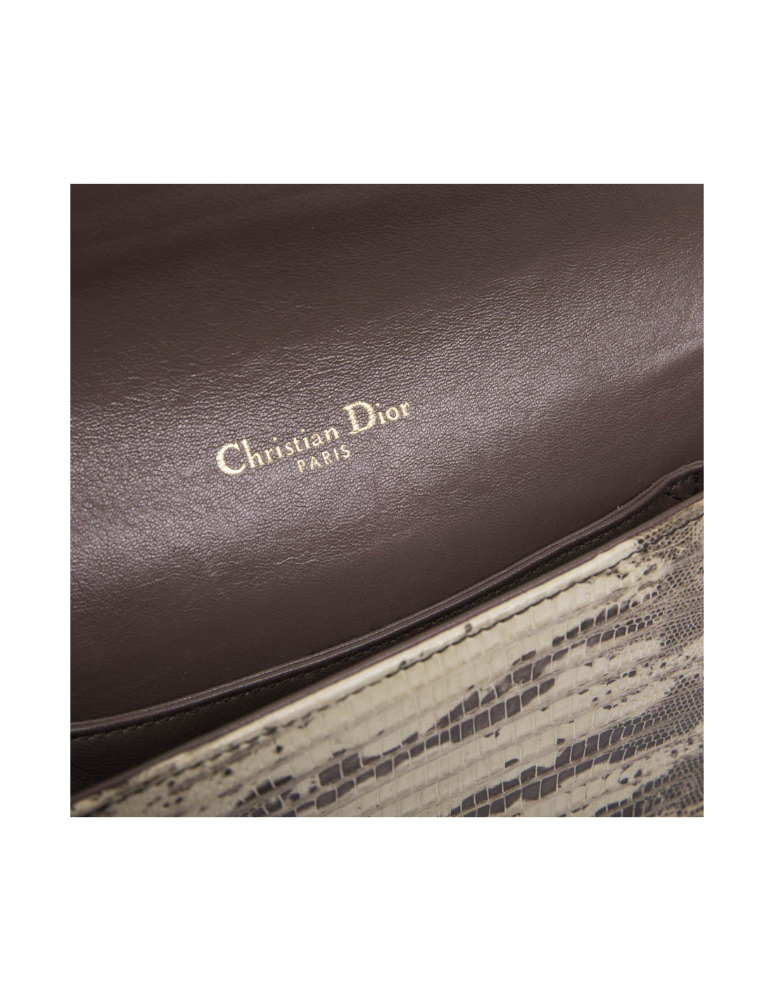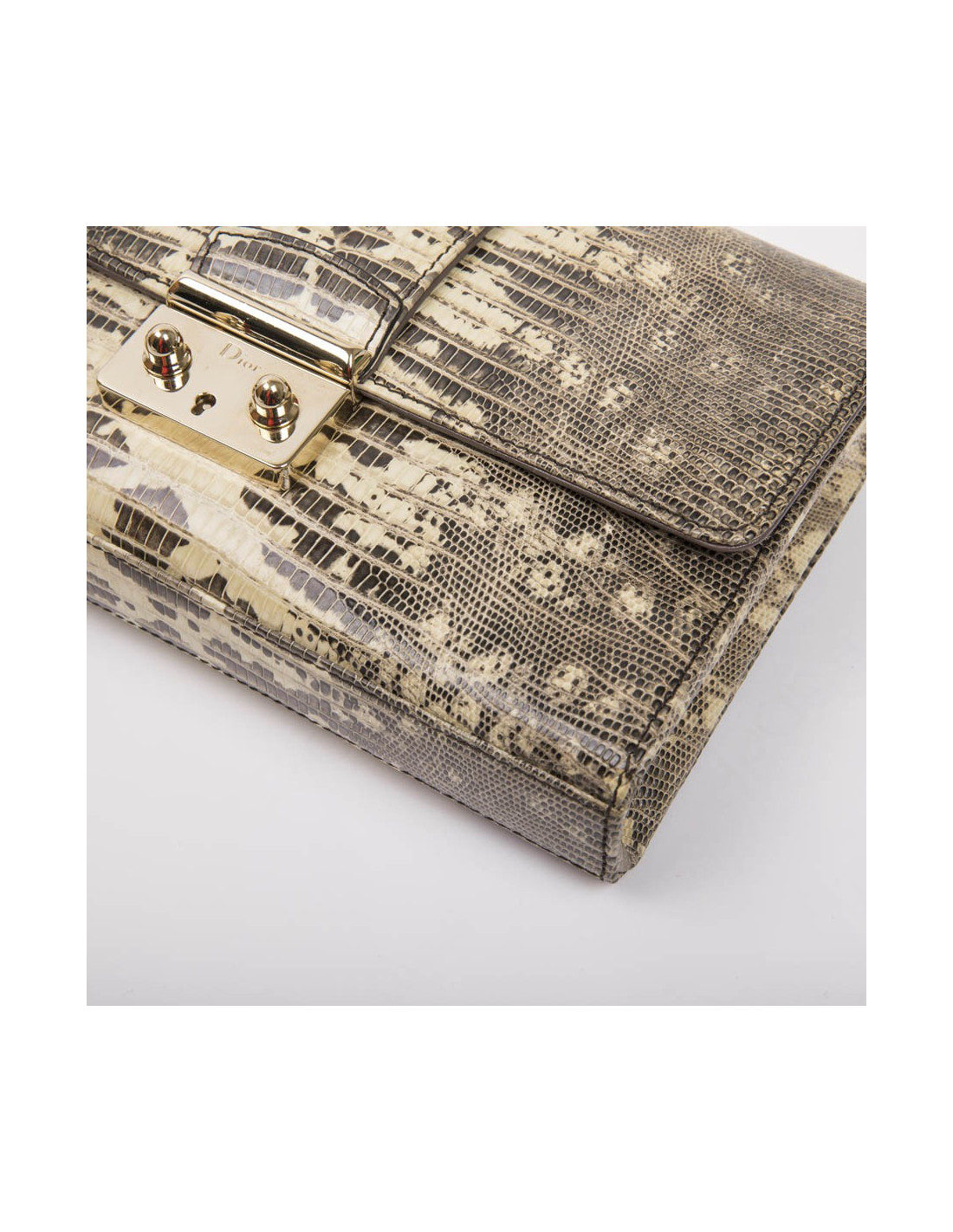 Dior clutch in water snake skin. Signature clasp in shiny gold metal hardware. The interior is in light brown leather (pen mark) with a patch pocket.