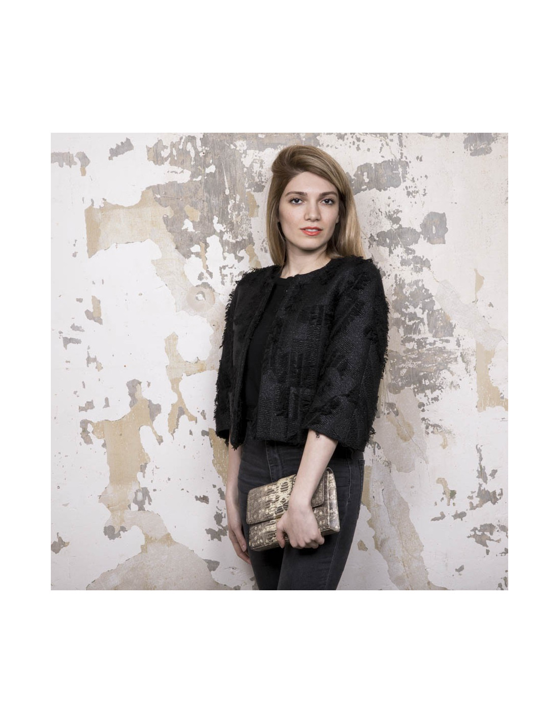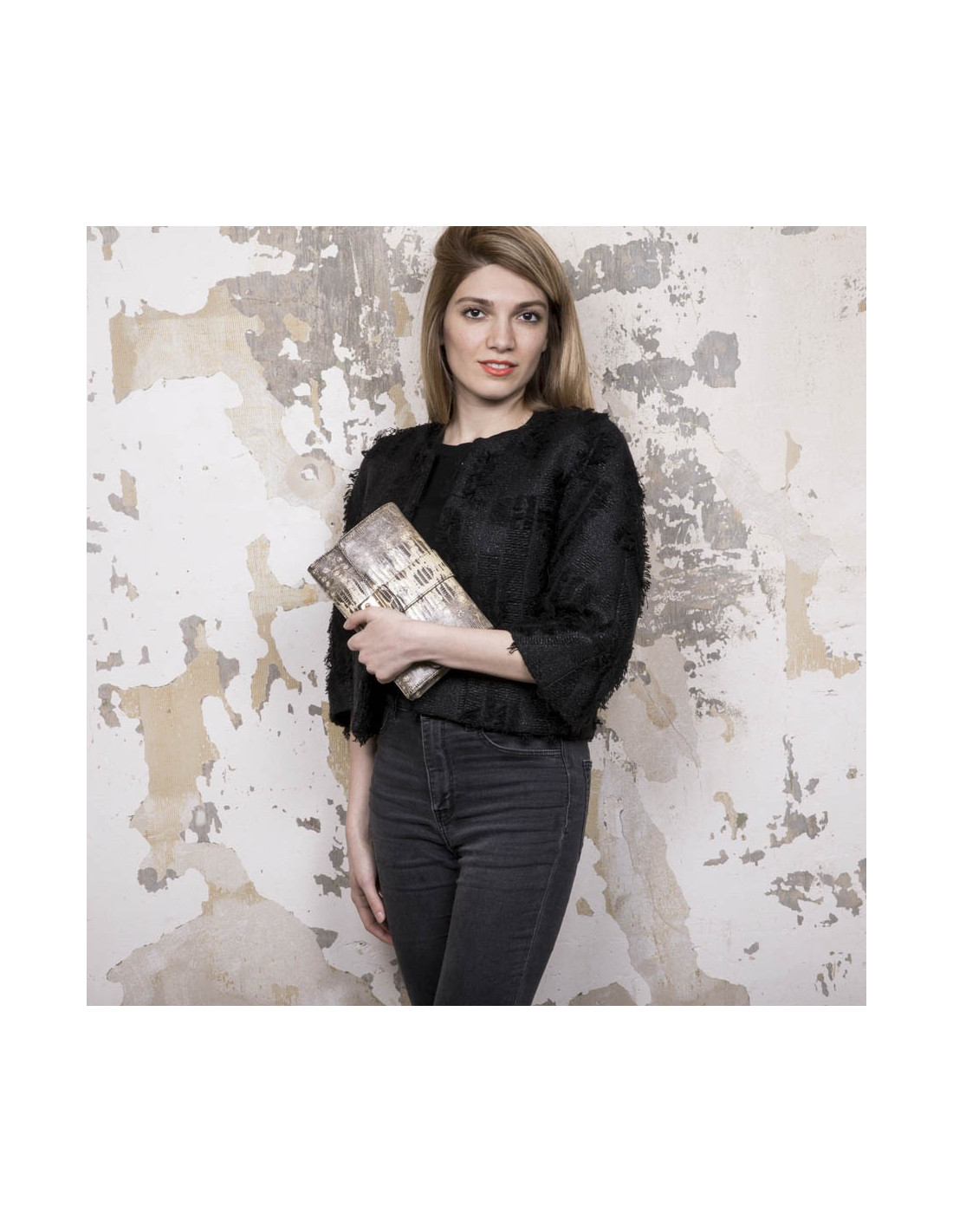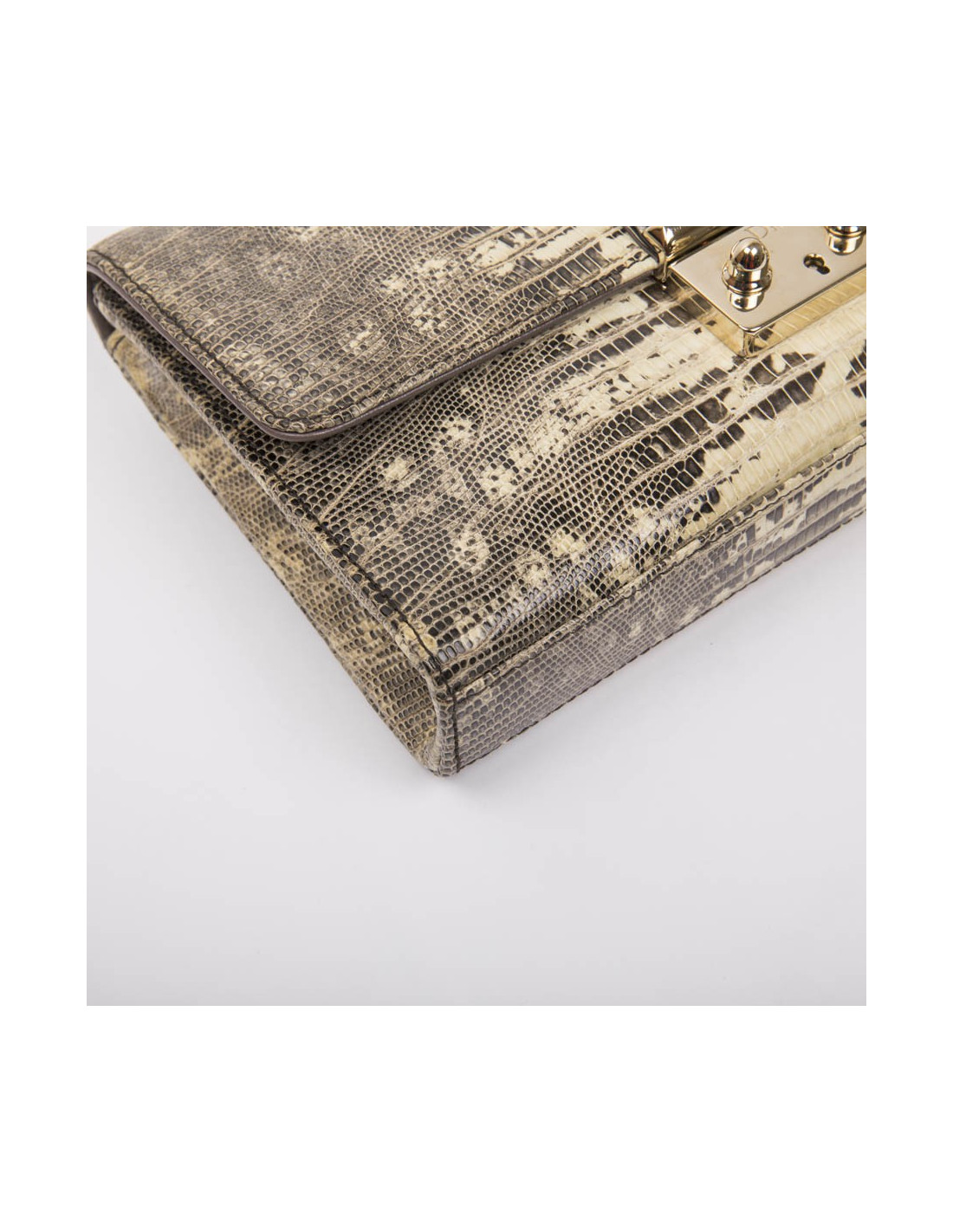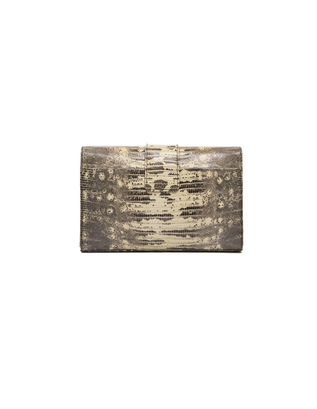 Dior clutch in water snake skin. Signature clasp in shiny gold metal hardware. The interior is in light brown leather (pen mark) with a patch pocket.