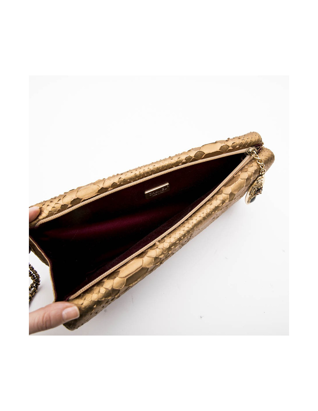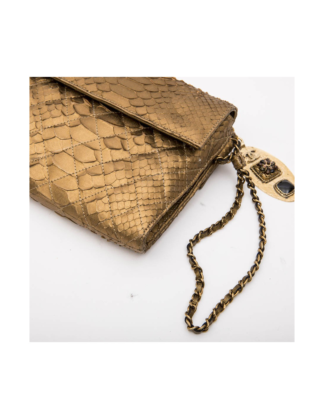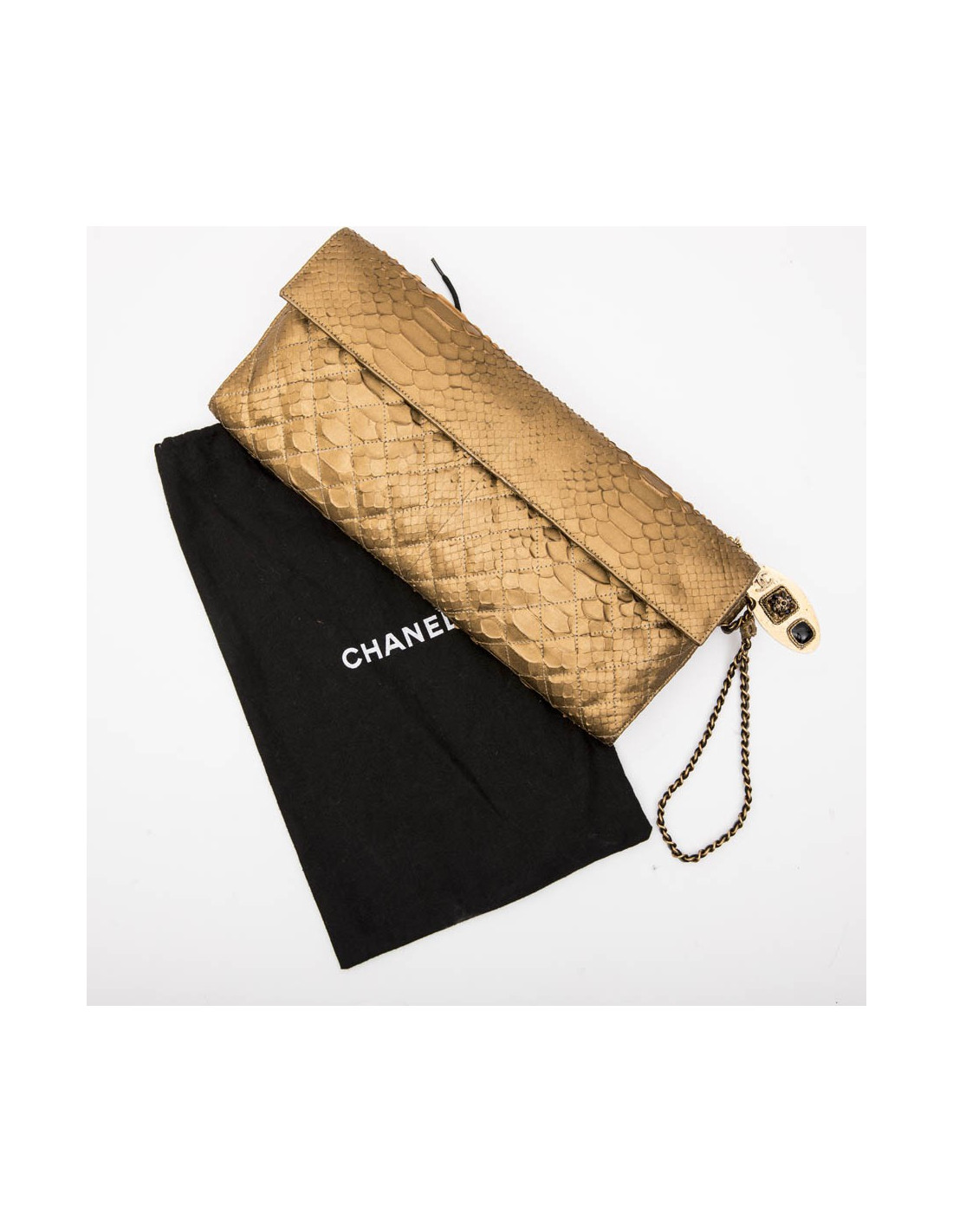 Long Chanel pouch in matte copper gold python. The interior is in burgundy satin duchesse with 3 gussets including one zipped. Gilded brass hardware. Zipper with hammered medallion and Molten glass.