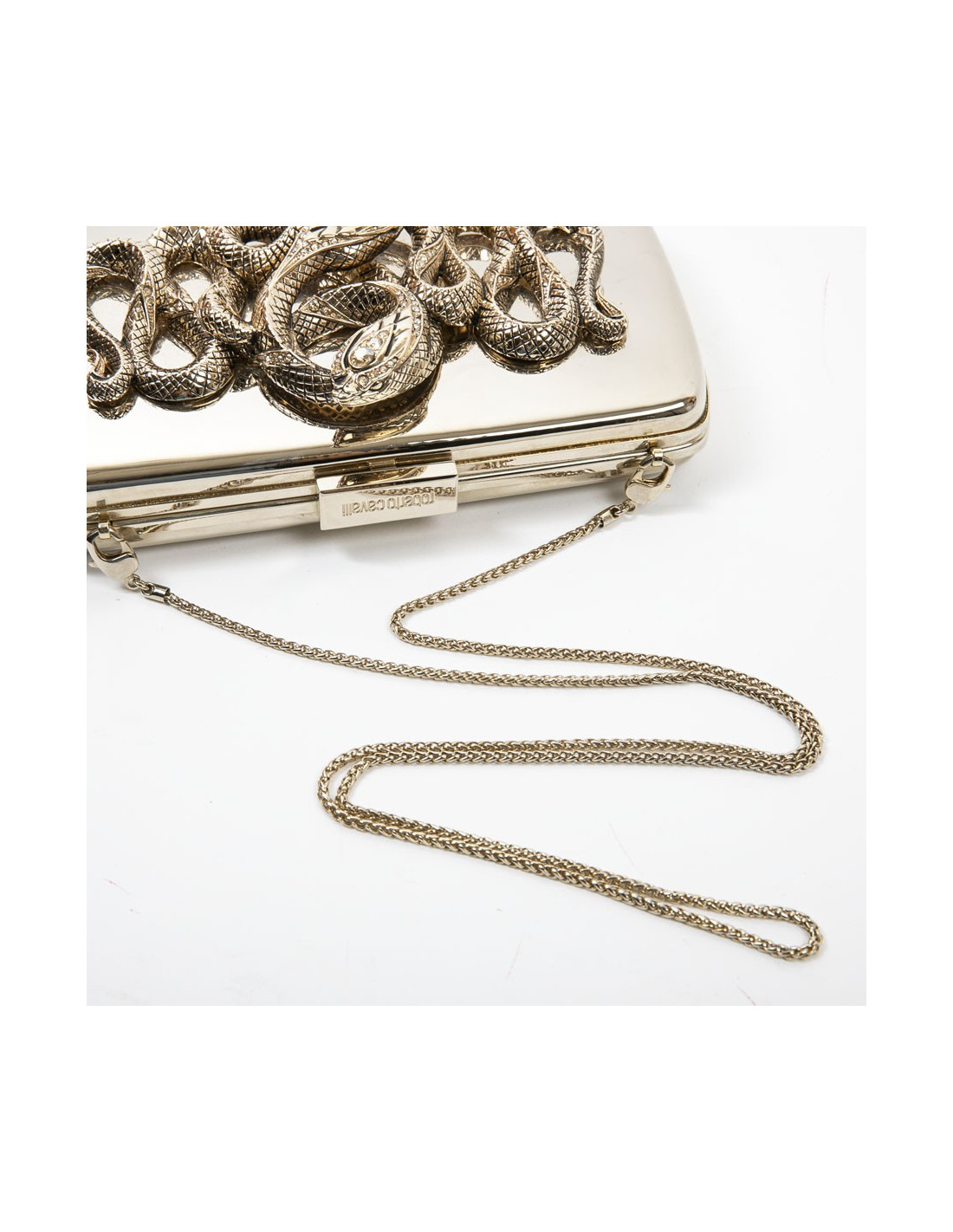 Roberto Cavalli minaudière in gold metal mirror effect and snake ornament in metal and rhinestones. Removable golden metal chain. Satin lining.