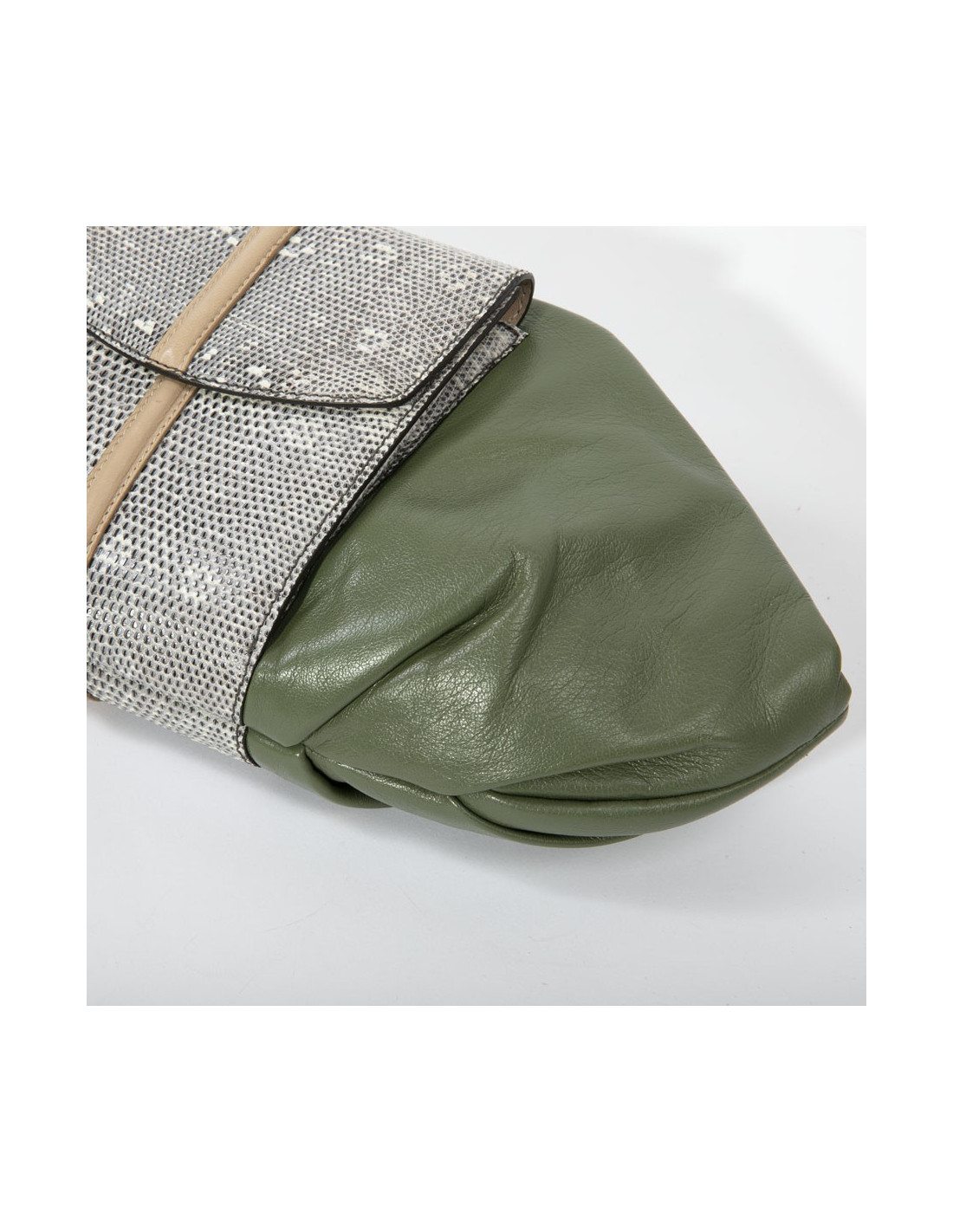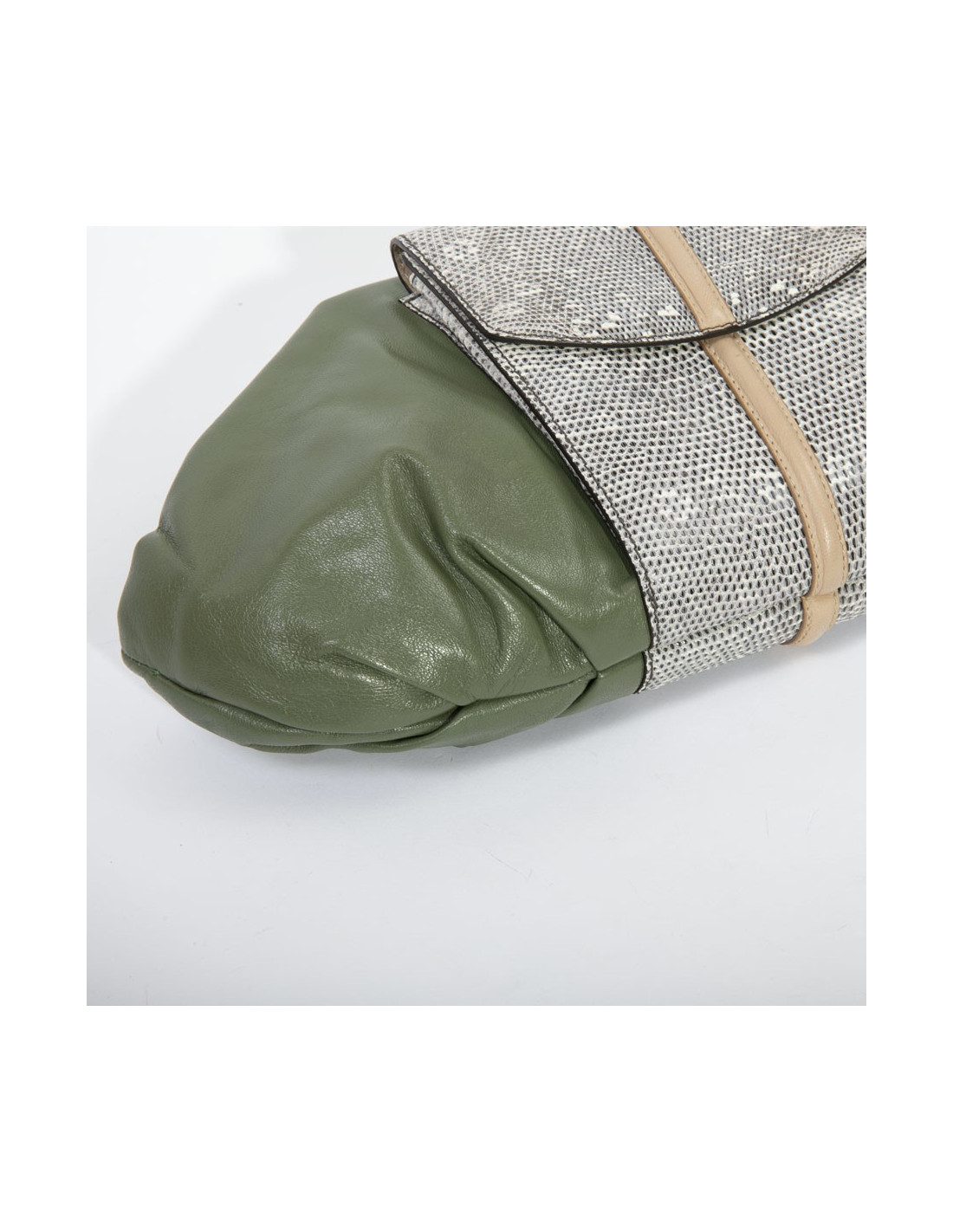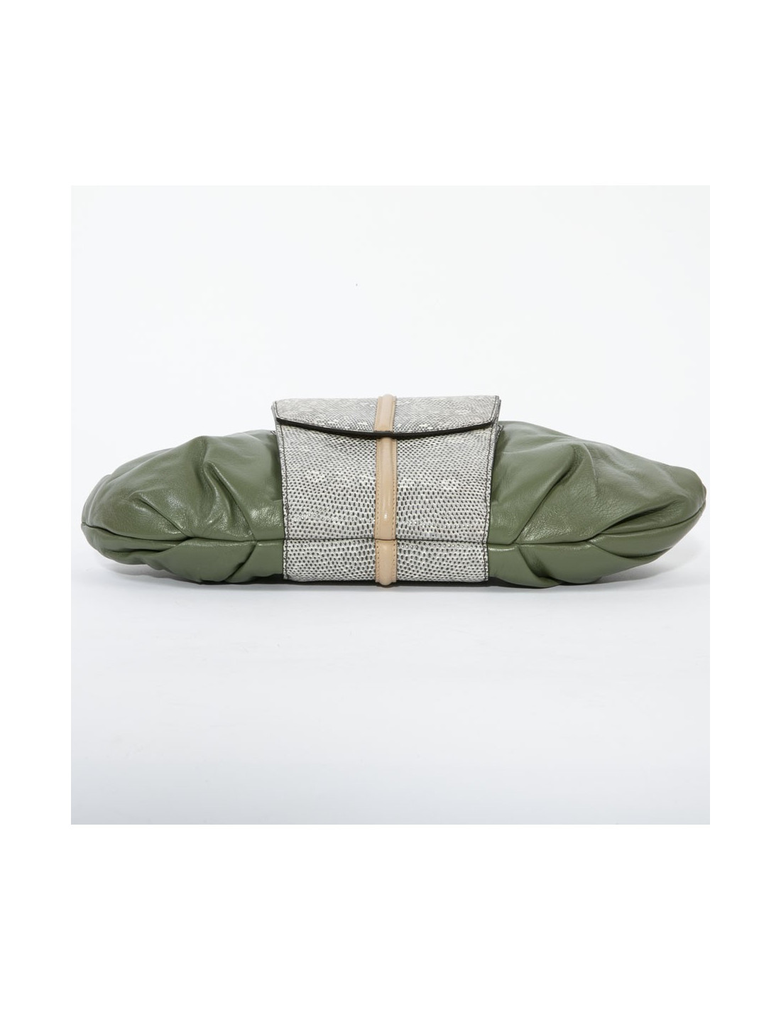 This Francesca Castagnacci clutch is in green leather and lizard (white and black). A nude leather border runs down the middle of the lizard pouch. The pouch closes with a zipper. The bag has two pockets with snap closures, one on the front and the other on the back of the bag (both in lizard). The inner lining is bronze-colored leather with two flat pockets, one of which is zippered. The fittings are in gilded metal. It is in perfect condition and has never been worn.