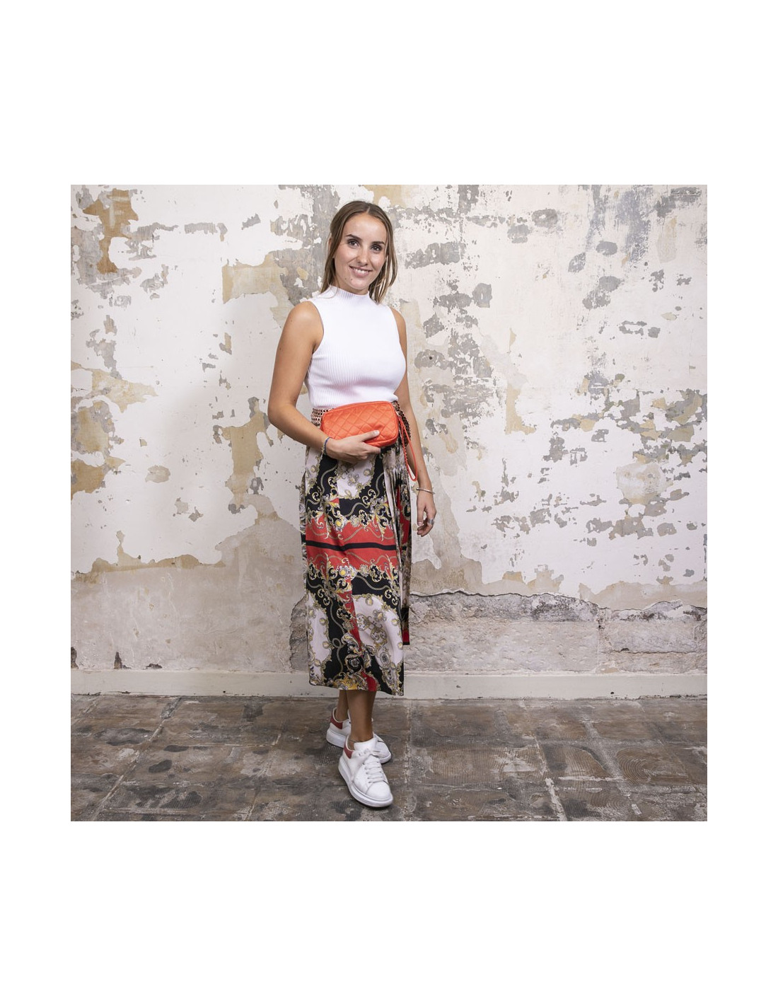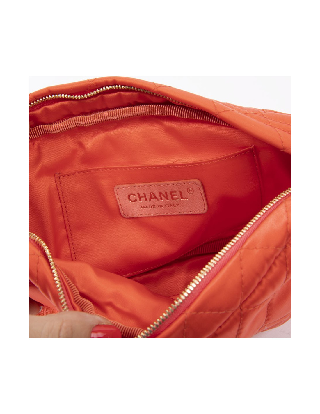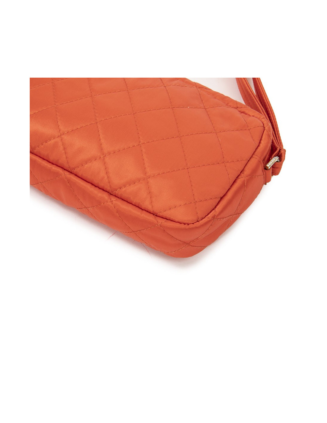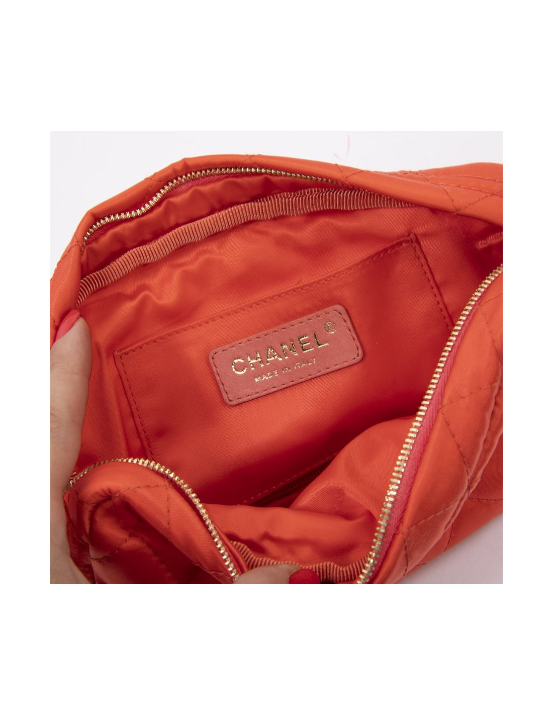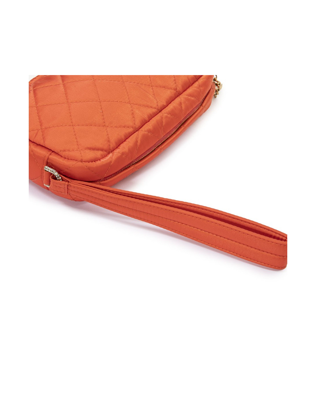 Chanel clutch in orange satin. Worn by hand with a strap.