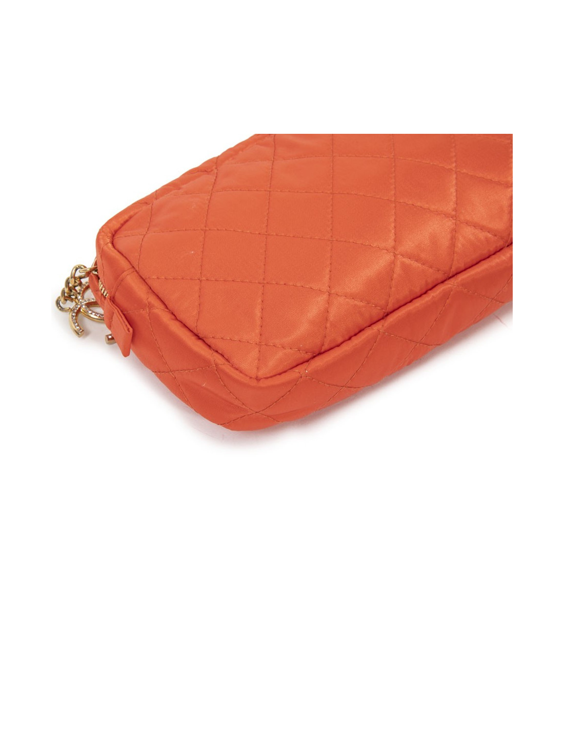 Gilt metal zipper closure with golden rhinestone CC charms (5 mini rhinestones missing). Satin lining. Flat pocket inside