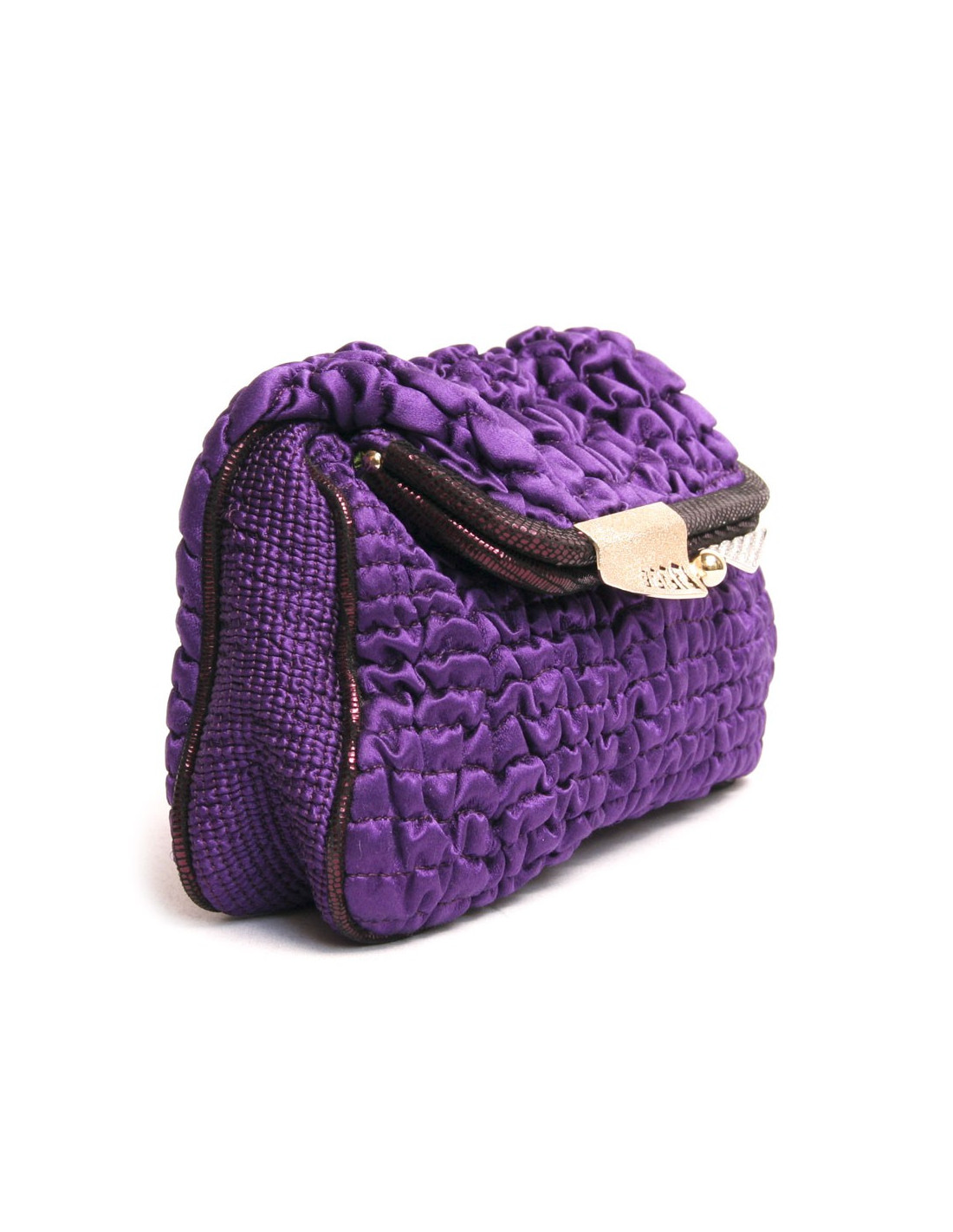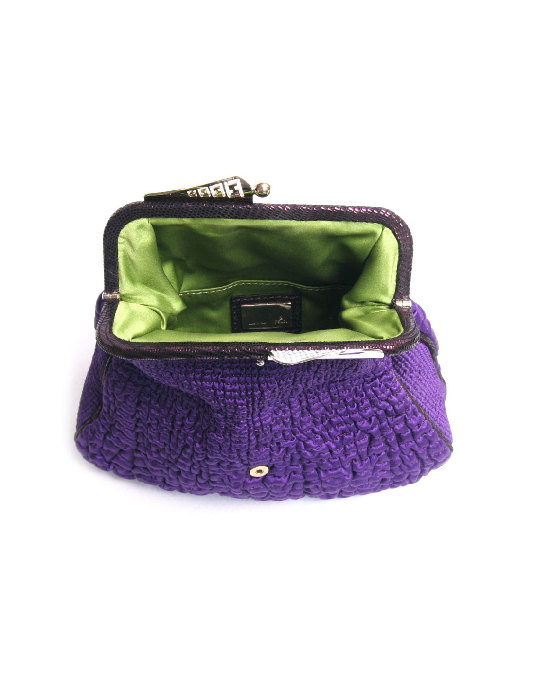 Lovely cover smoke of the Fendi House of color silk purple. The jewelry is gold metal. The Interior is green silk with a small patch pocket. Snap button closure. On the clasp you can see rhinestones as well as the "F" logo in the place and upside for Fendi in silver and gold metal. In very good condition.