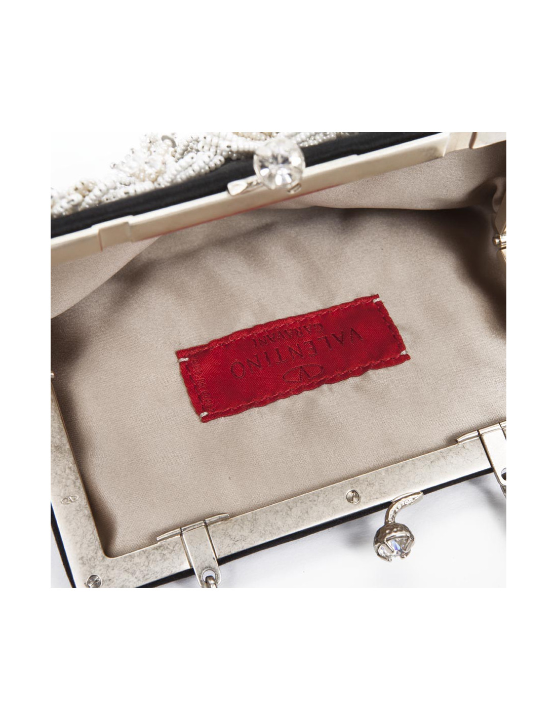 Small Valentino evening bag in black silk satin. There are pearls flowers sewn and set with brilliants on both sides of the bag. Some brilliants are missing (not very visible).