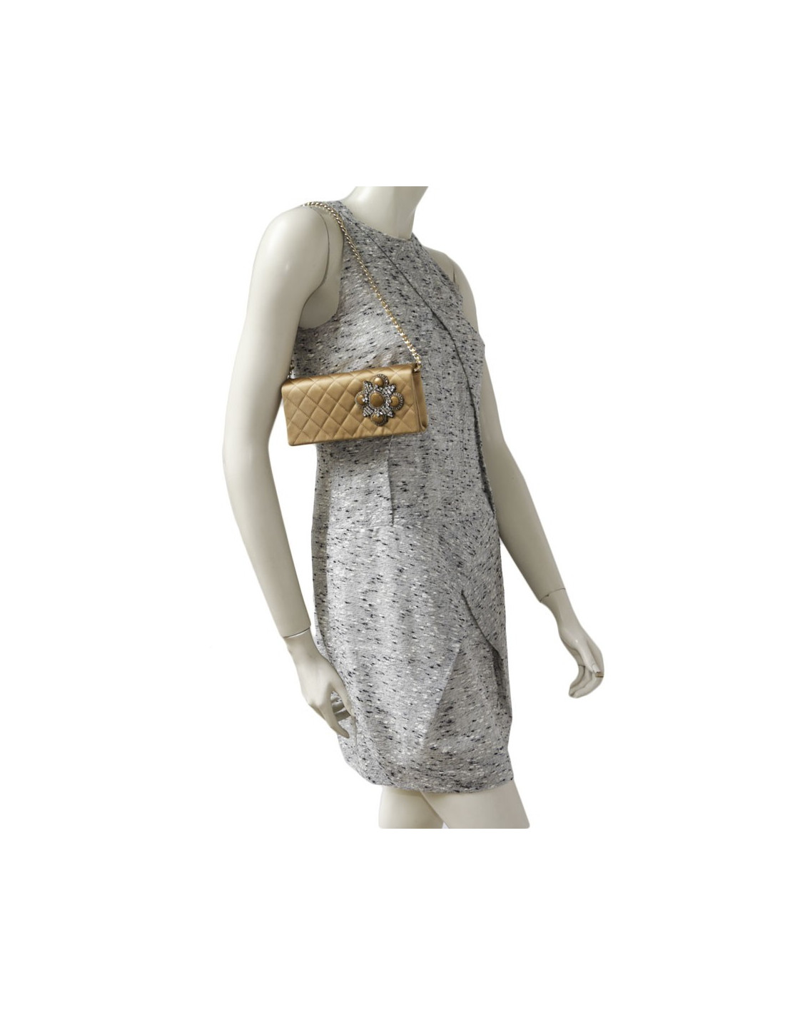 Worn by hand as a clutch or on the shoulder with a shoulder strap in gold chain and gilt leather. The inside is in silk satin with a small patch pocket.