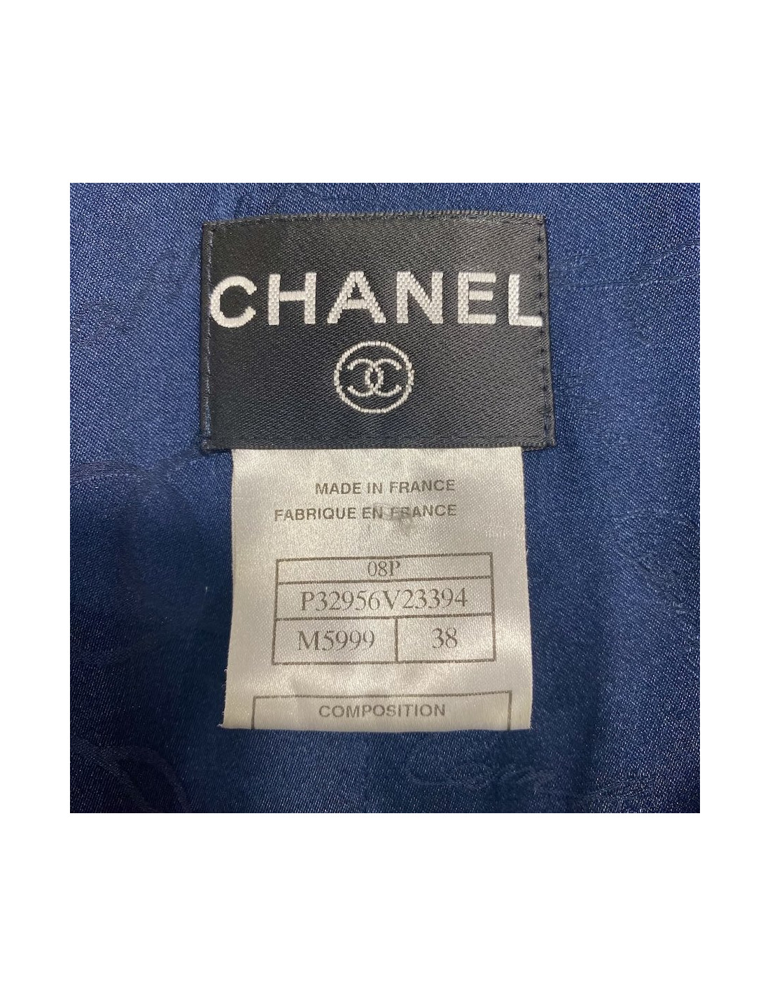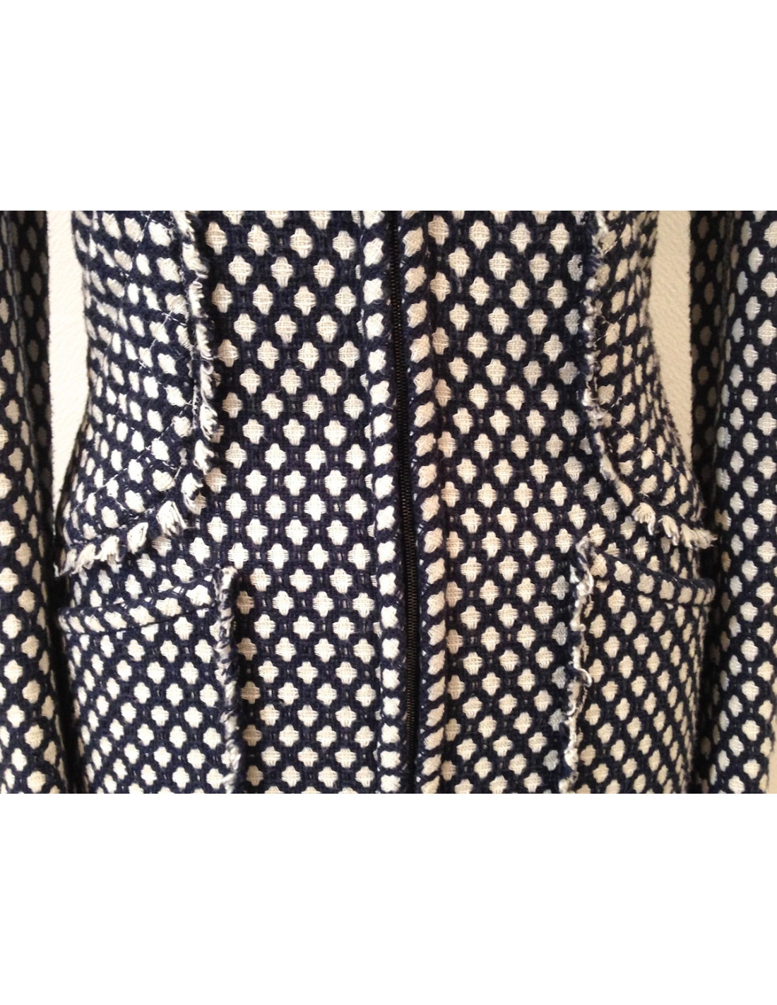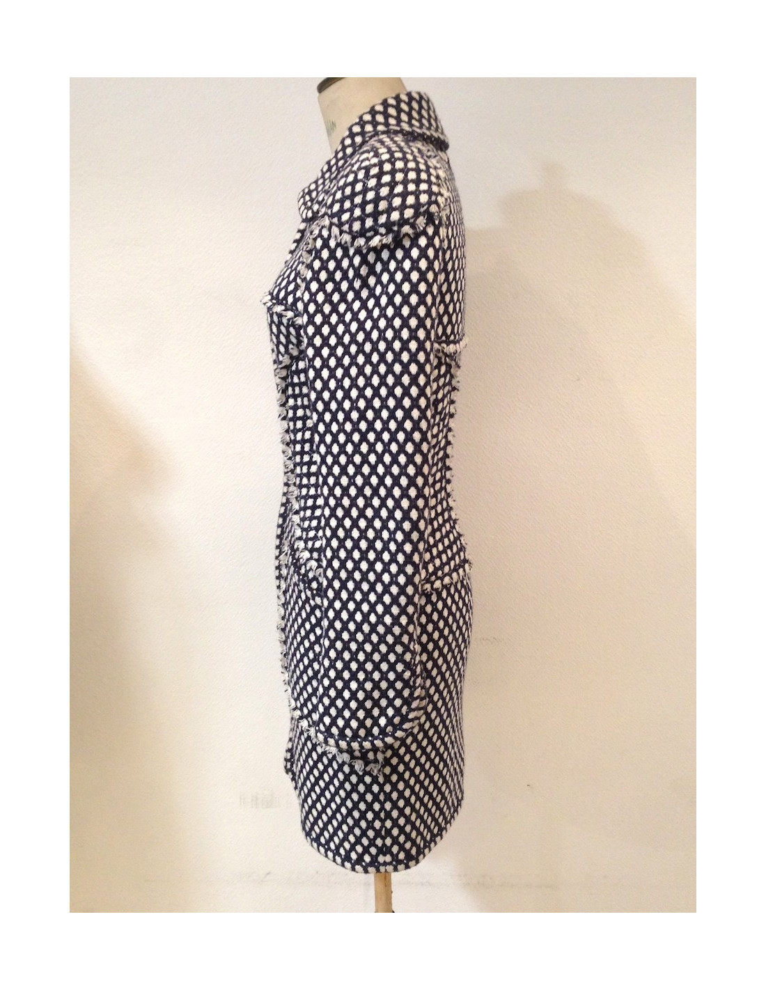 marine blue tweed coat dress and white CHANEL size 38. The lining is fully 100% silk, in very good condition