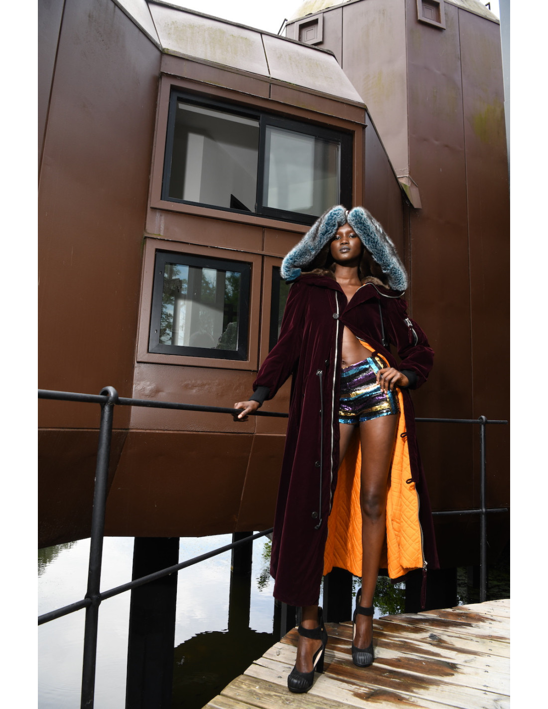 Details : Bomber shape on the orange lining and oversized look on the outside. Zip fastening all the way up to the head. Grey, brown and blue faux fur hood. 2 large pockets on each side and one on the sleeve.