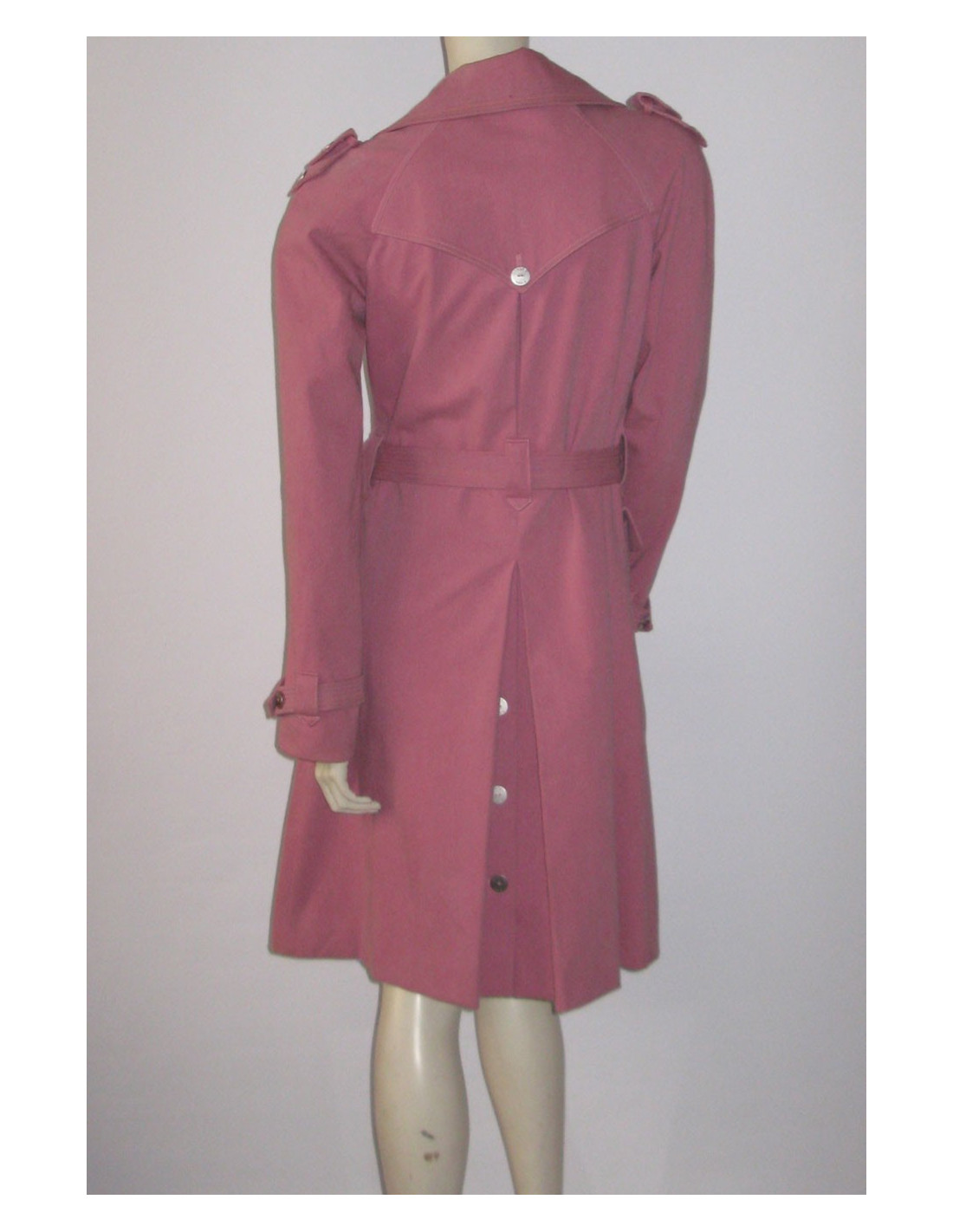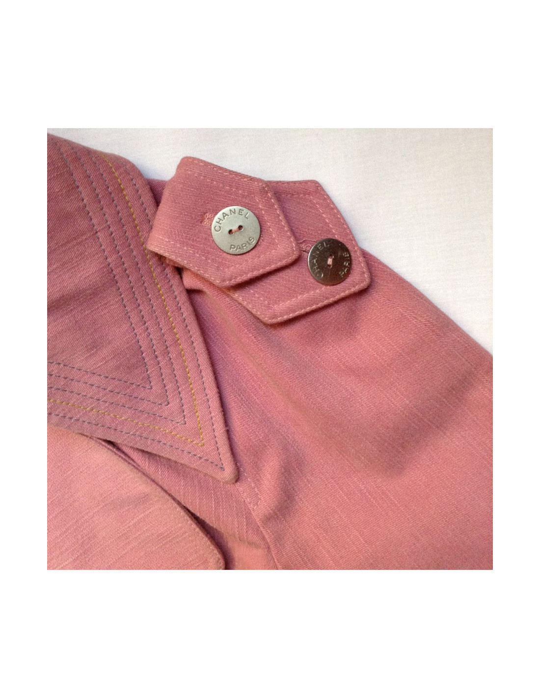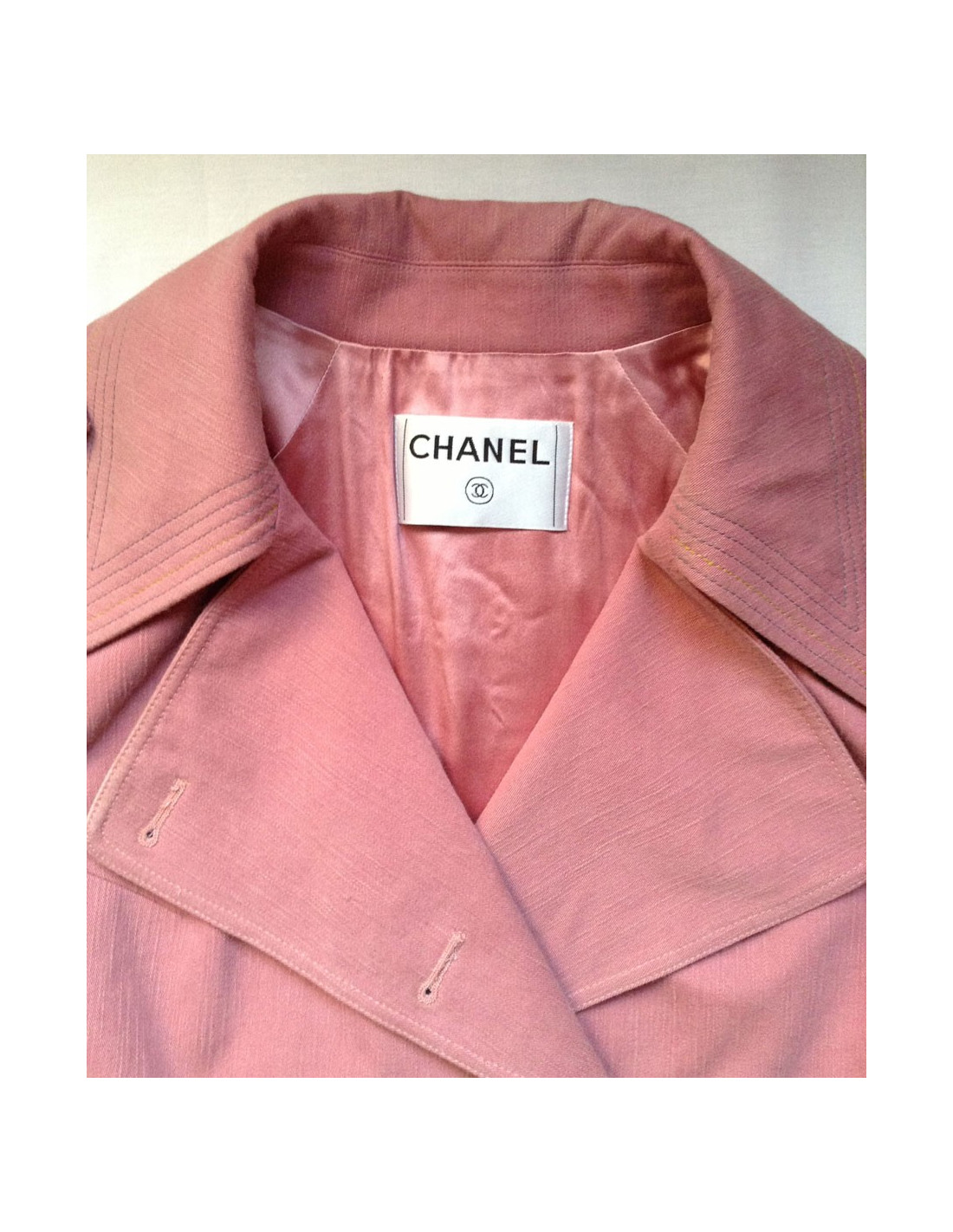 Trench pink CHANEL, mi long. T42Fr Double legs to shoulders seeded by 2 serious Silver flat buttons "Chanel Paris". Closing cross at the centre by 10 buttons. 2 large flap pockets buttoned at the front, closing flange 2 buttons at cuffs. Slot opening by 4 buttons at the bottom on the back. Silver initials flat buttons "Chanel Paris" throughout the coat. Stitching of sky blue and yellow color on the neck, flange sleeves, the ends of the 2 front pockets and belt integrated into the size. Pink silk lining.