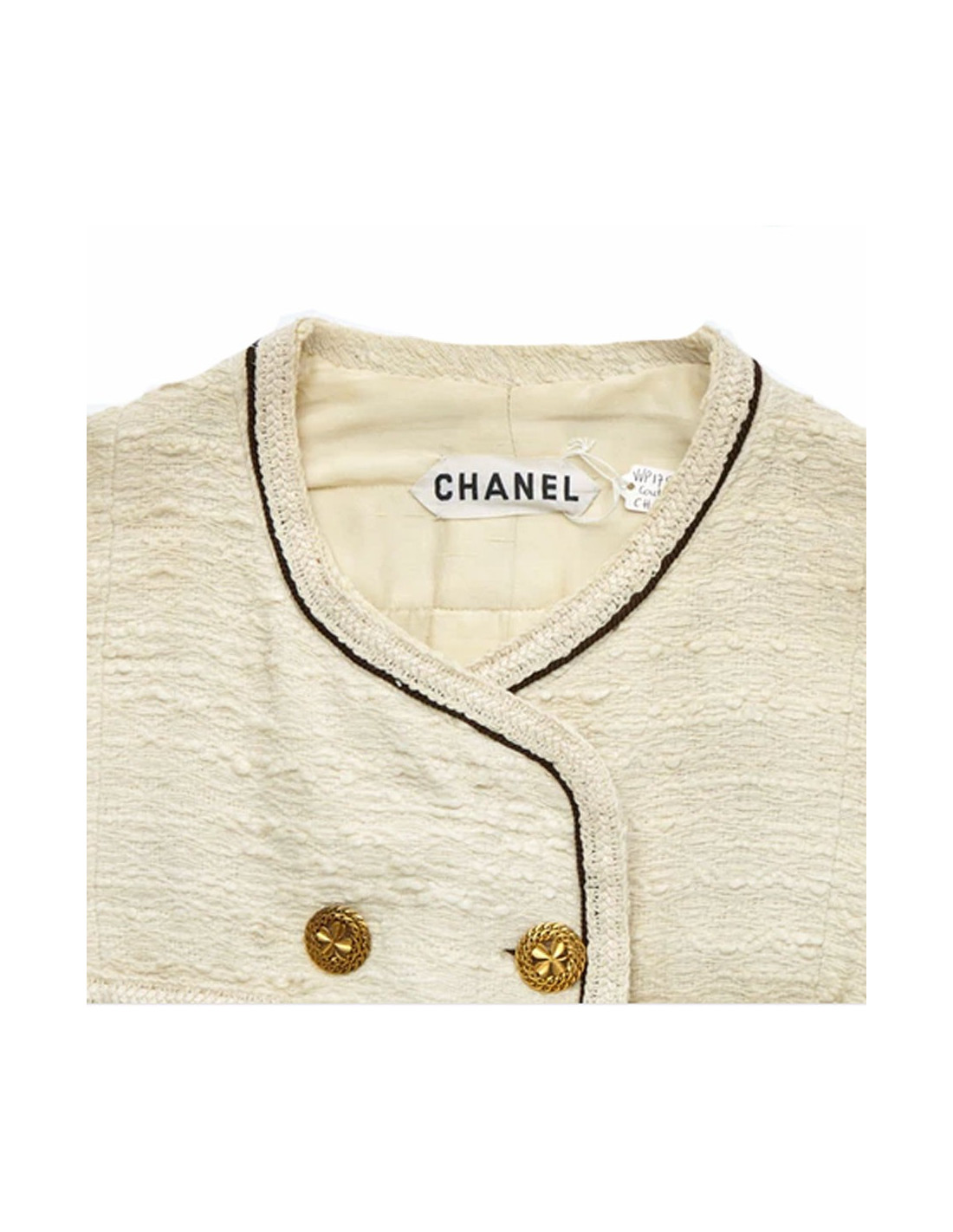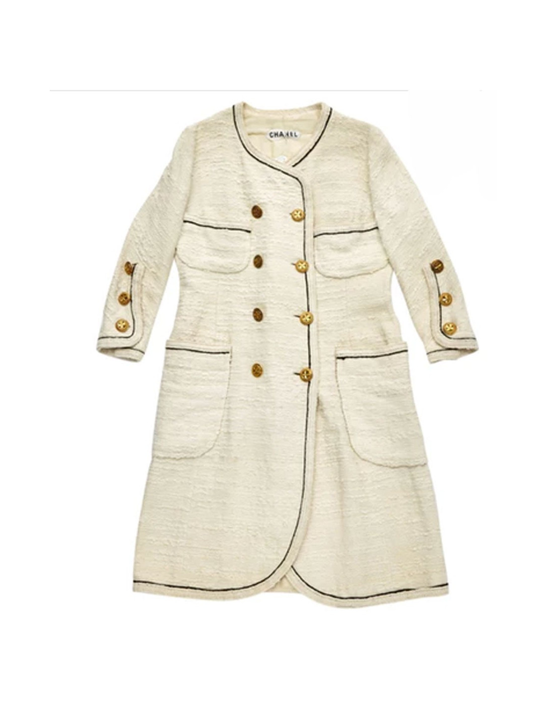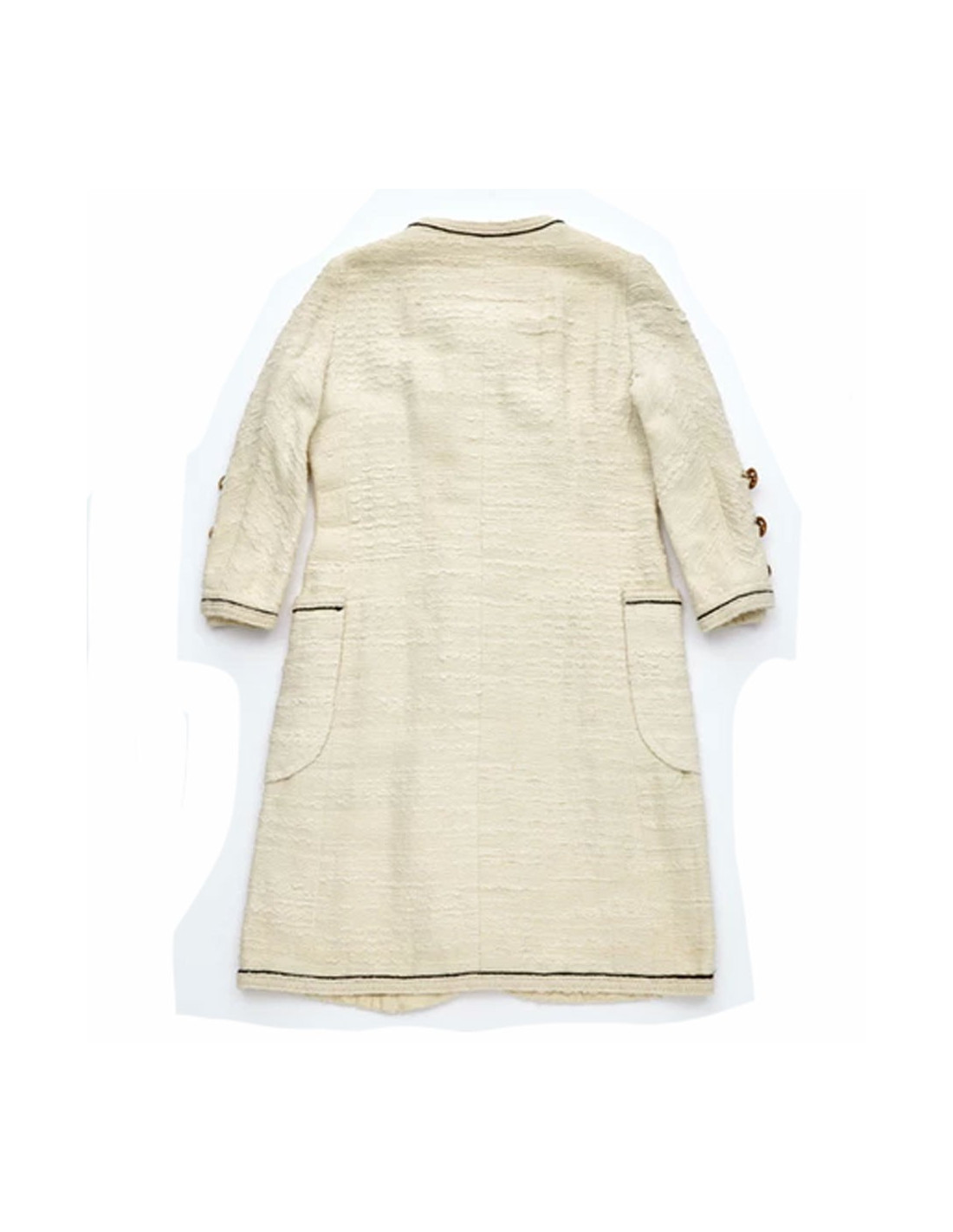 Details: Couture and Vintage! Chanel Couture coat dress with three-quarter sleeves in ivory tweed and gold metal buttons. Double button placket, four pockets. This lovely piece is lined in silk. Please note a trace of rust under the buttons due to age. No size label, but corresponds to a 40FR.