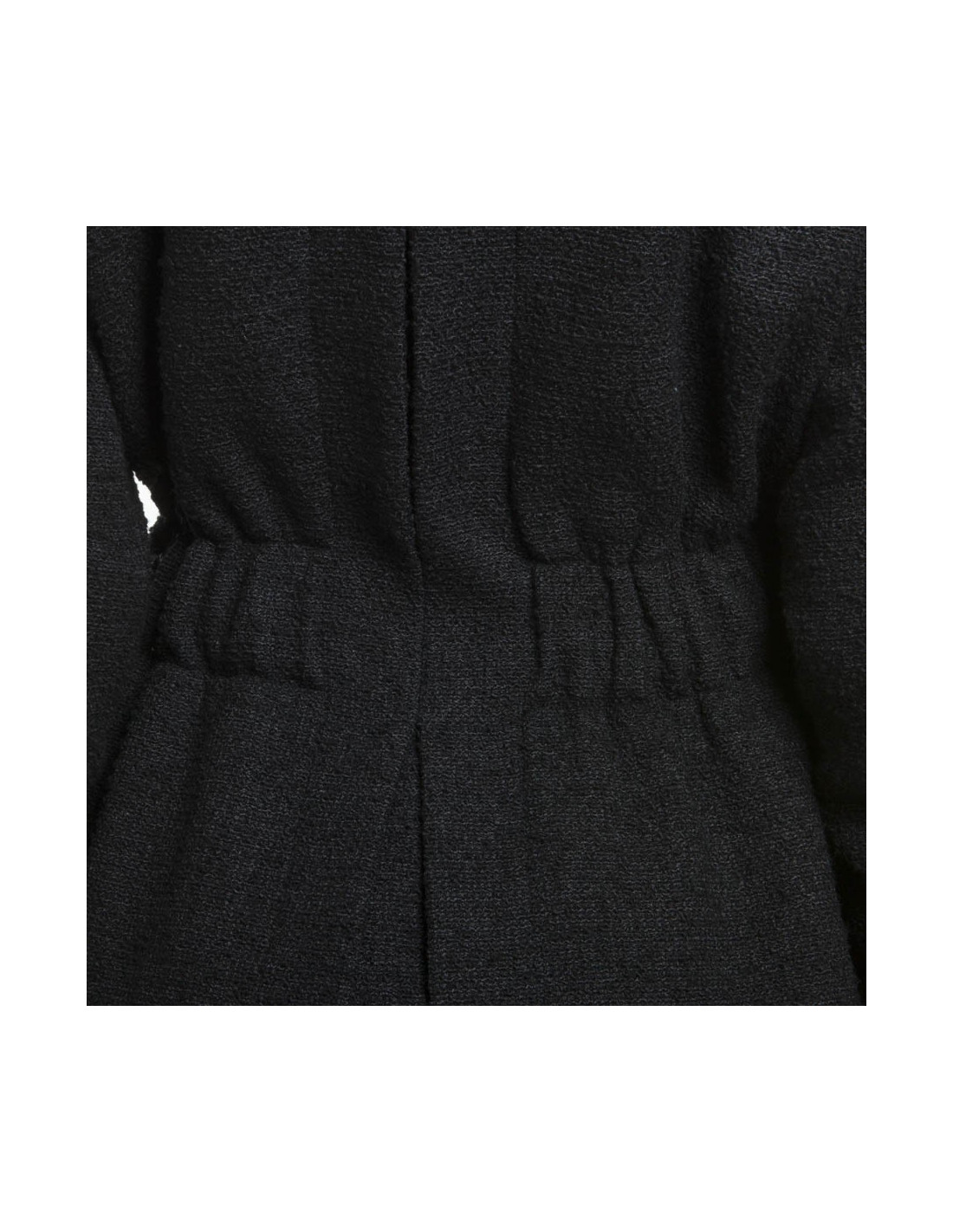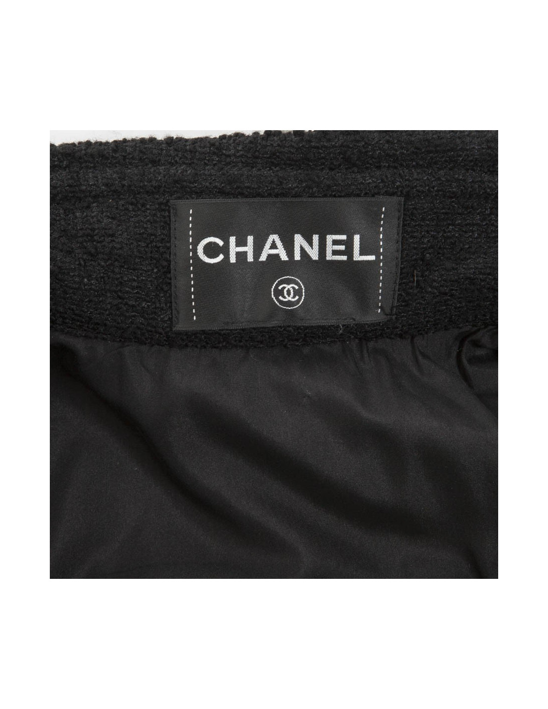 It closes with 6 Chanel logo buttons and sliding black leather straps at the waist. The lining is made of black silk.