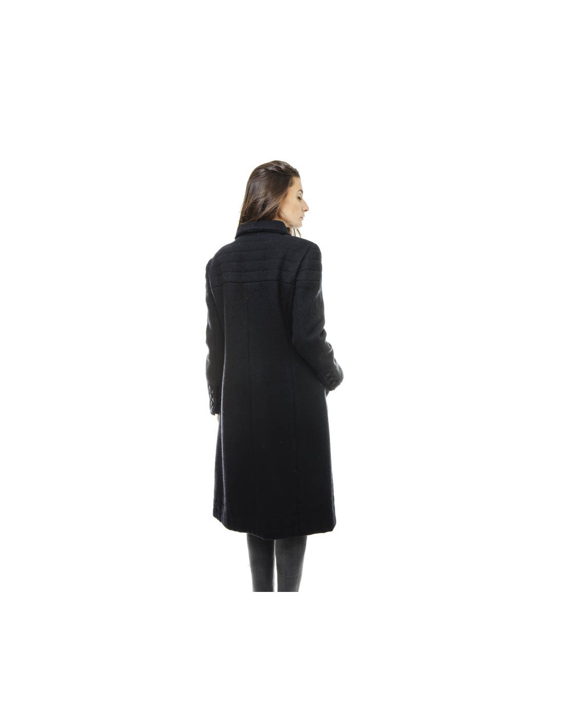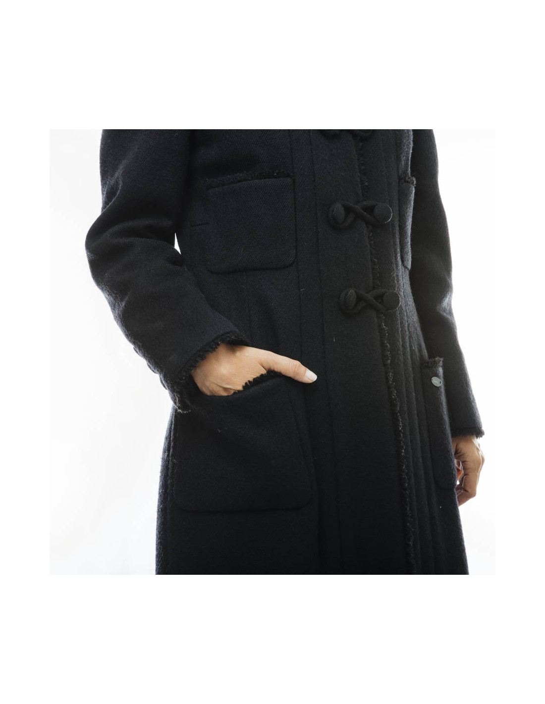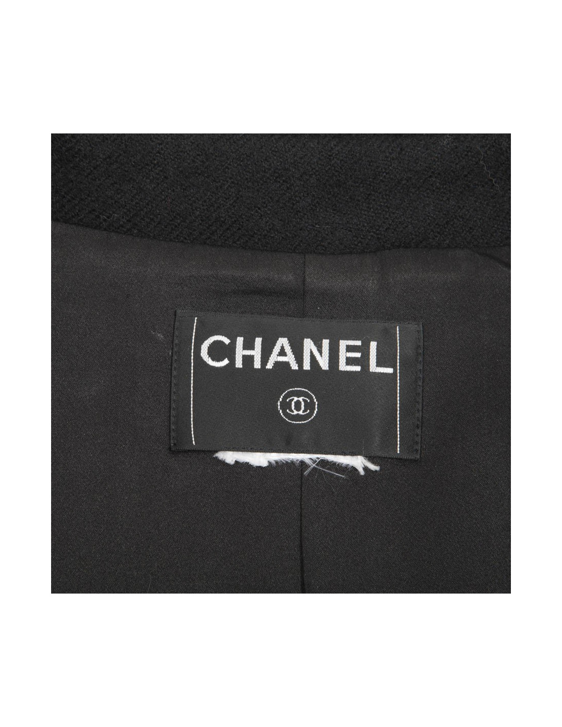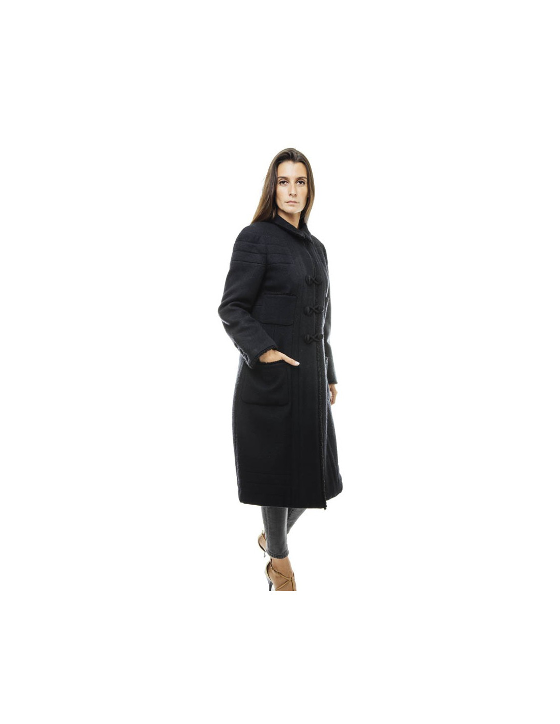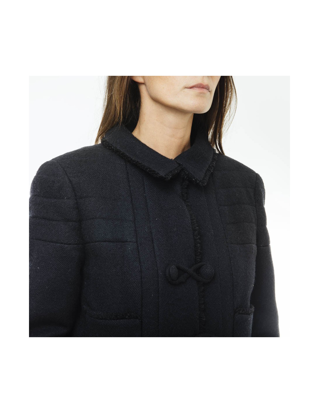 Chanel coat in black wool. 4 patch pockets on the front. Closing with 3 buttons Brandenburg and 1 button at the collar.