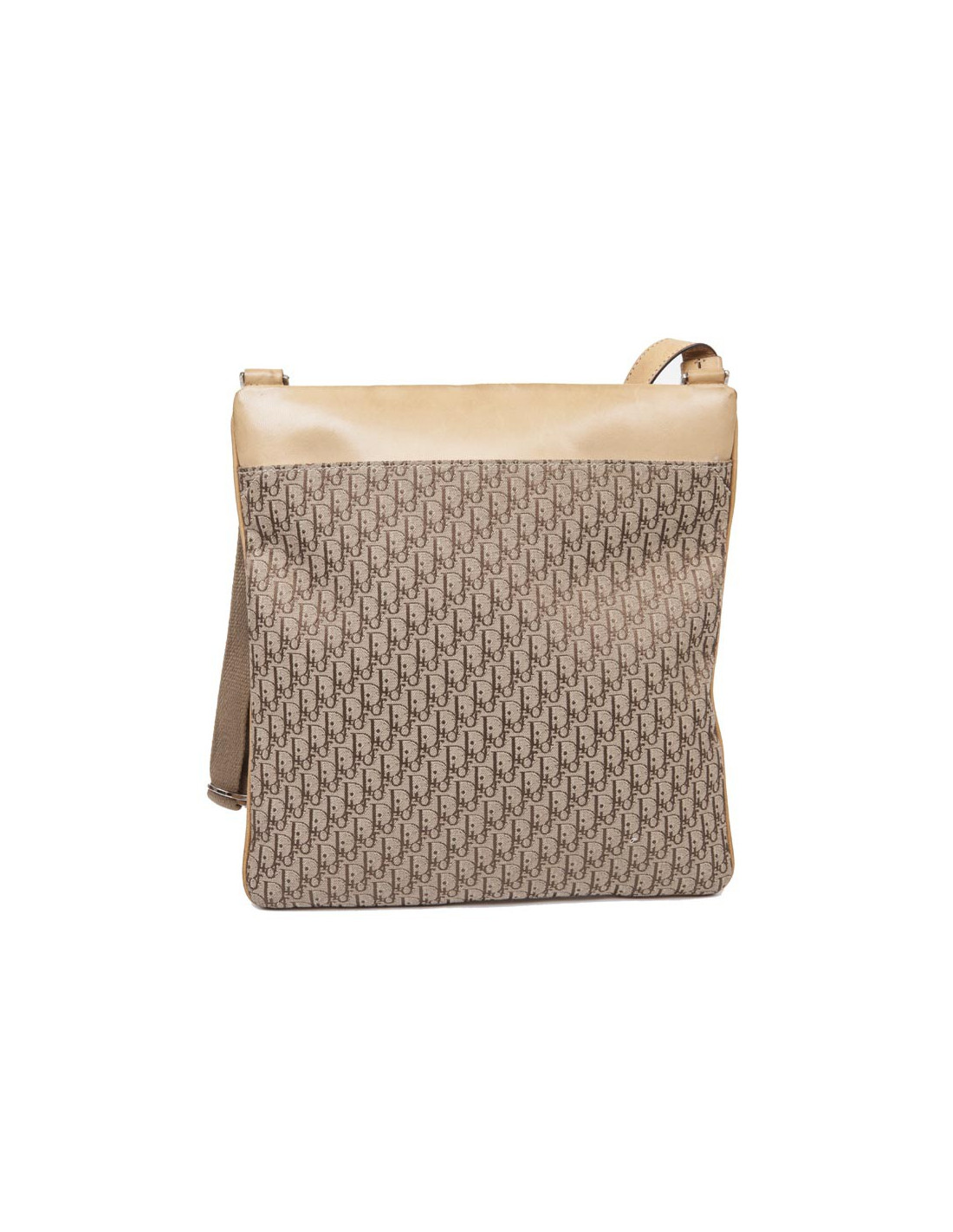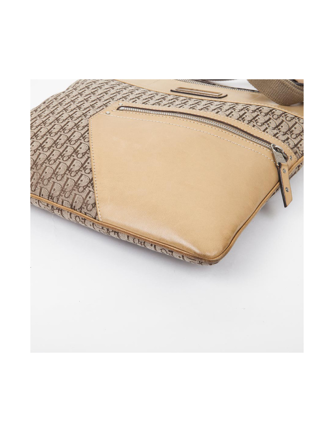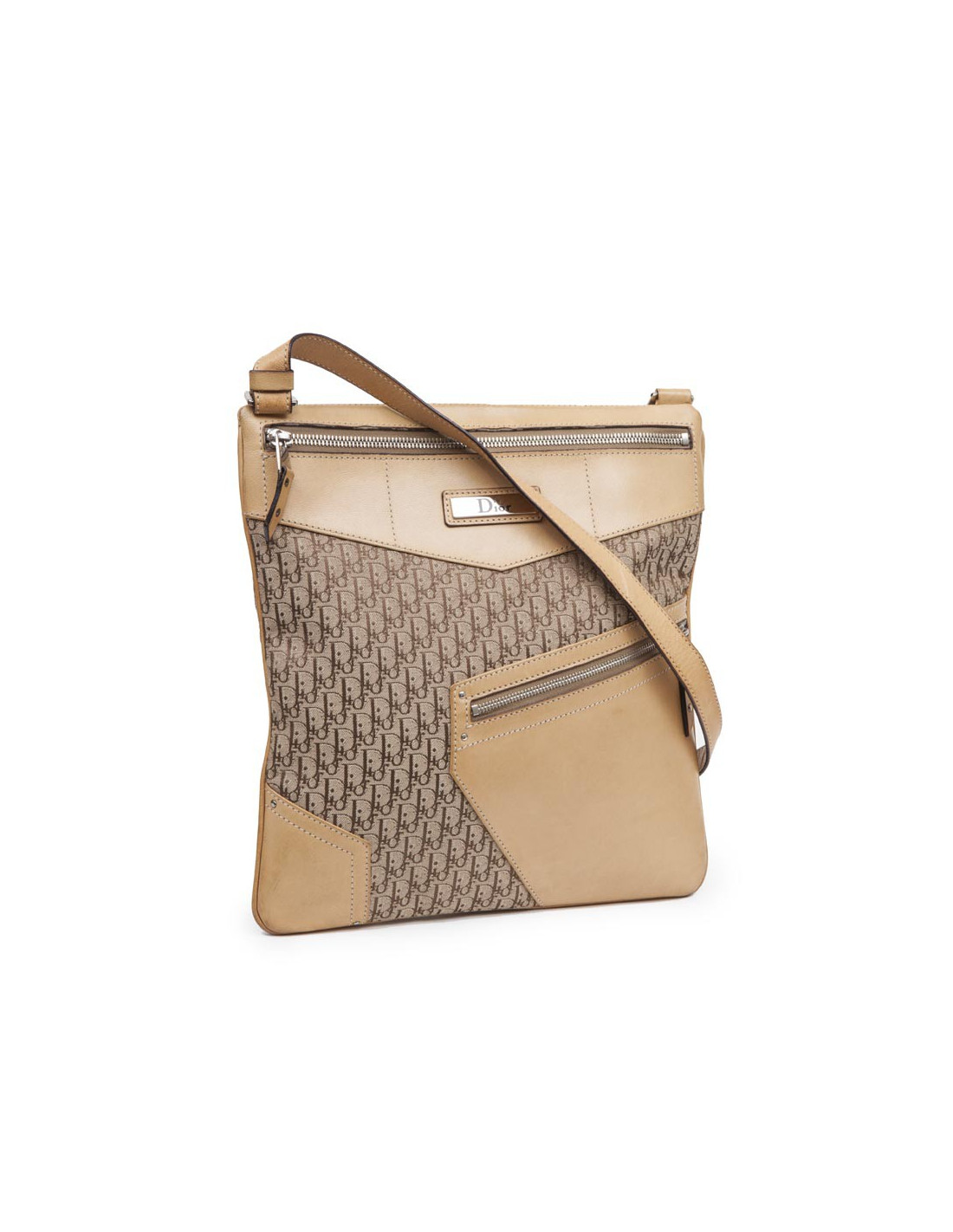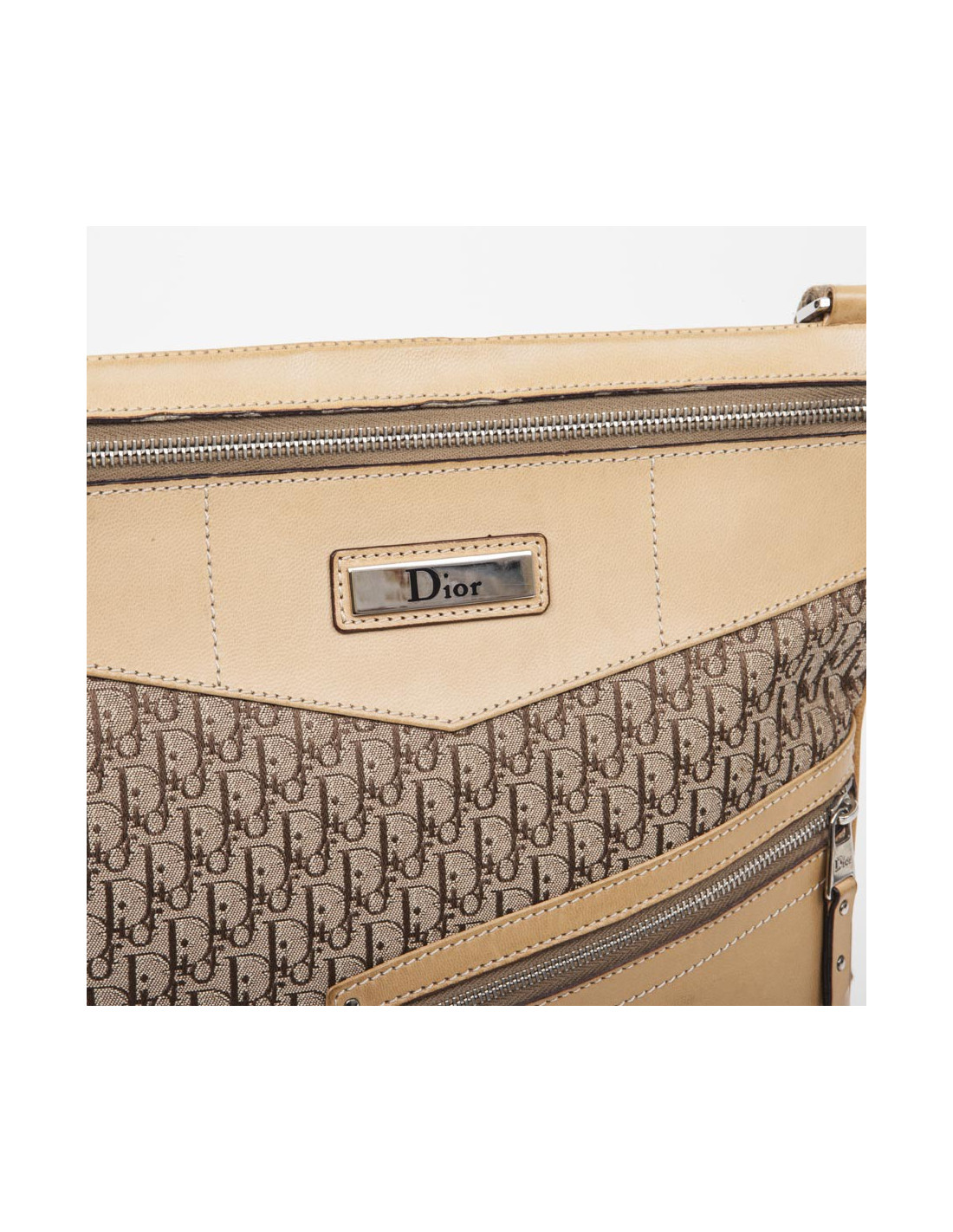 DIOR bag in beige monogram canvas and leather. It has a big slot on the back and two zipped pockets in the front.