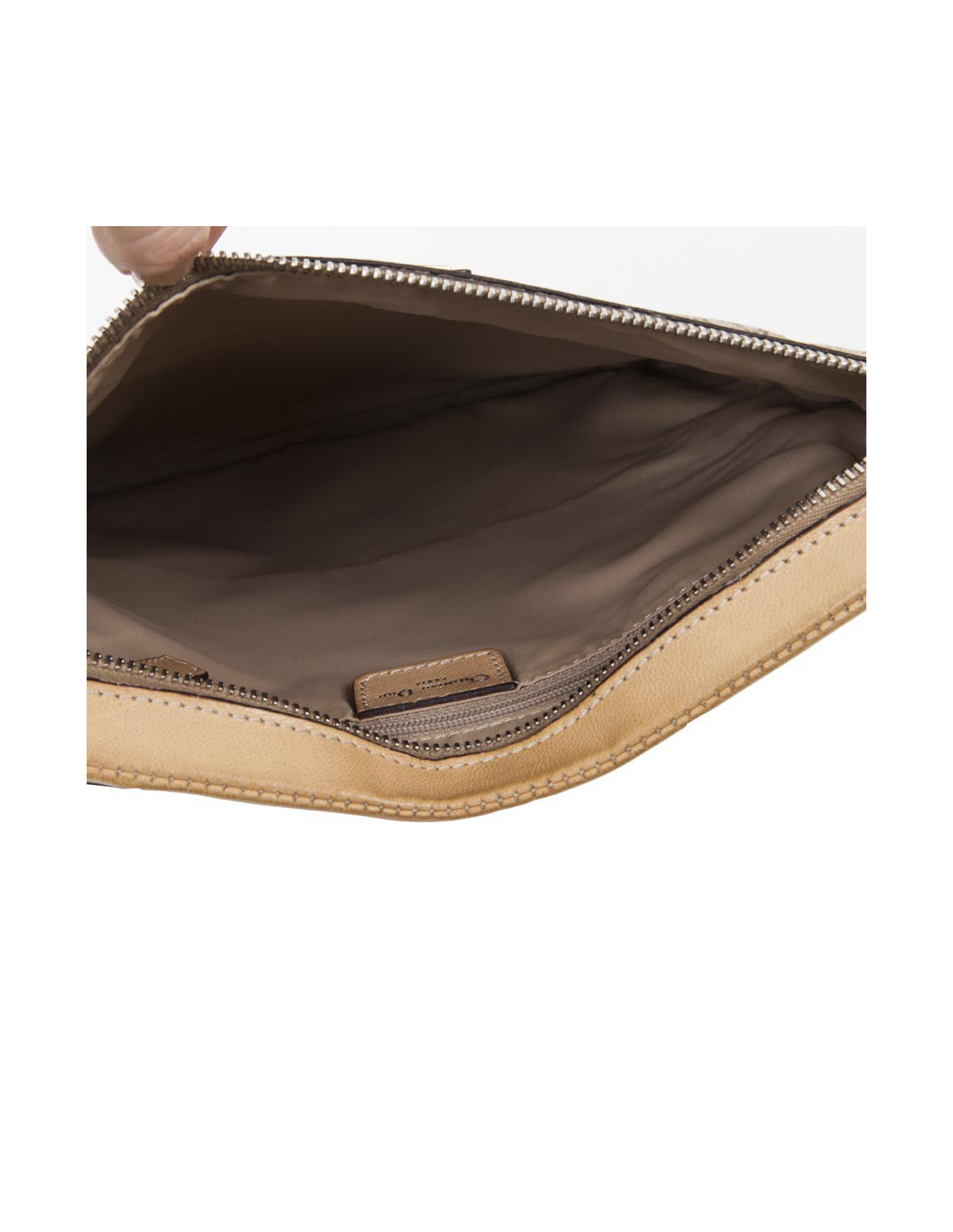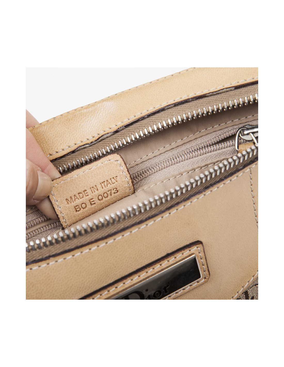 The interior is in beige canvas with a zipped pocket. Hologram BO E 0073.