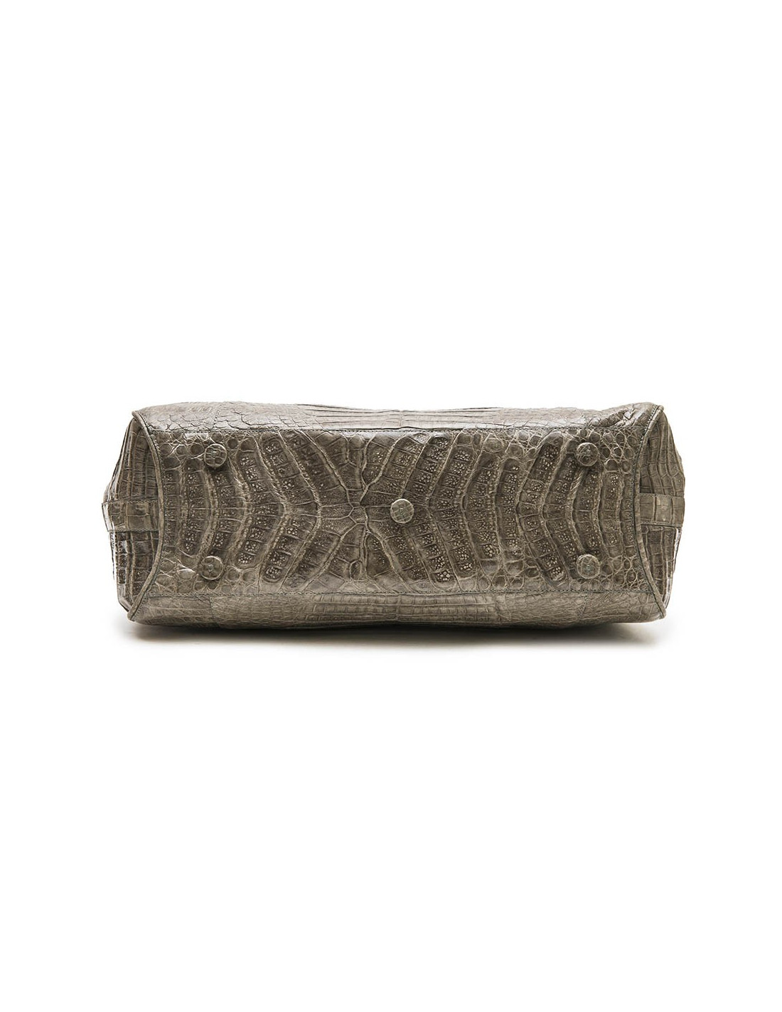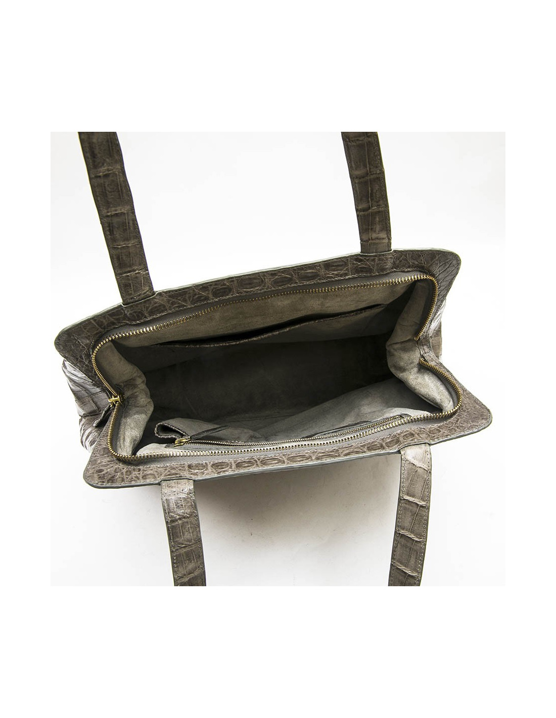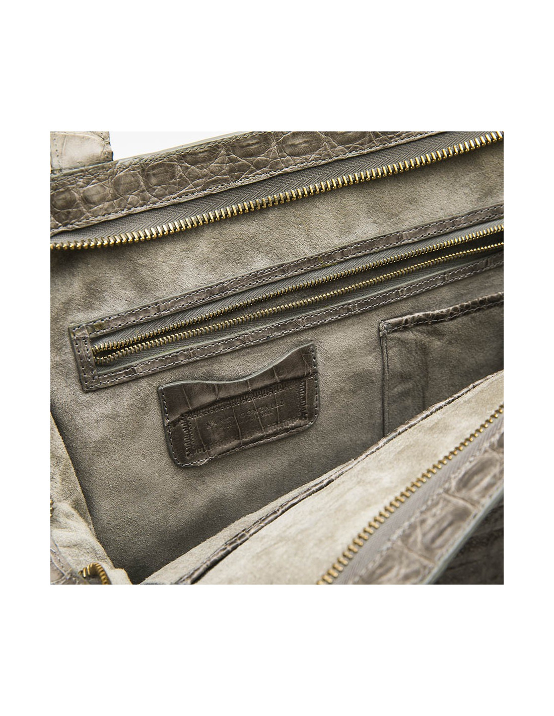 Nancy Gonzales bag in gray crocodile. Zip closure. A zipped pocket and a patch pocket inside.