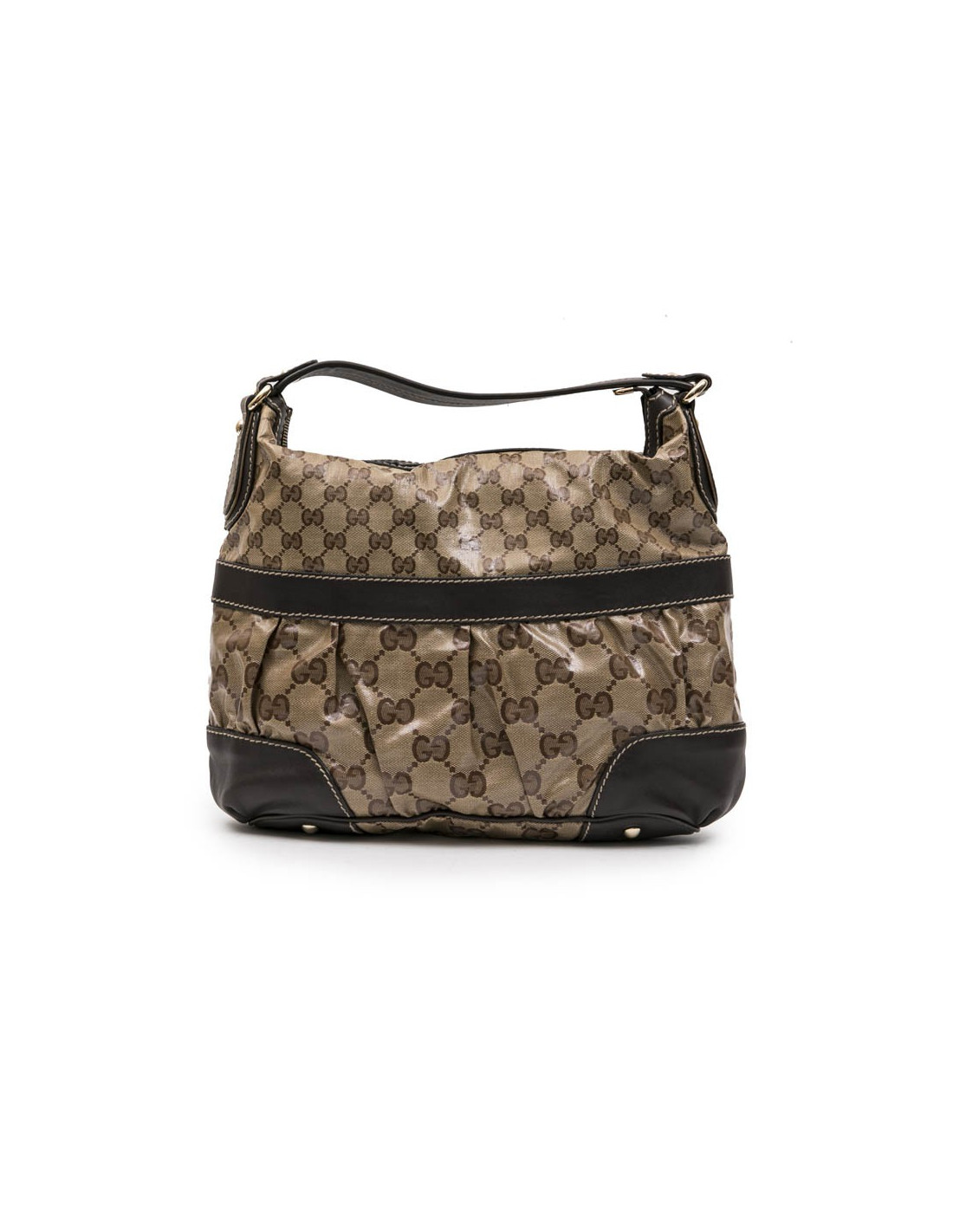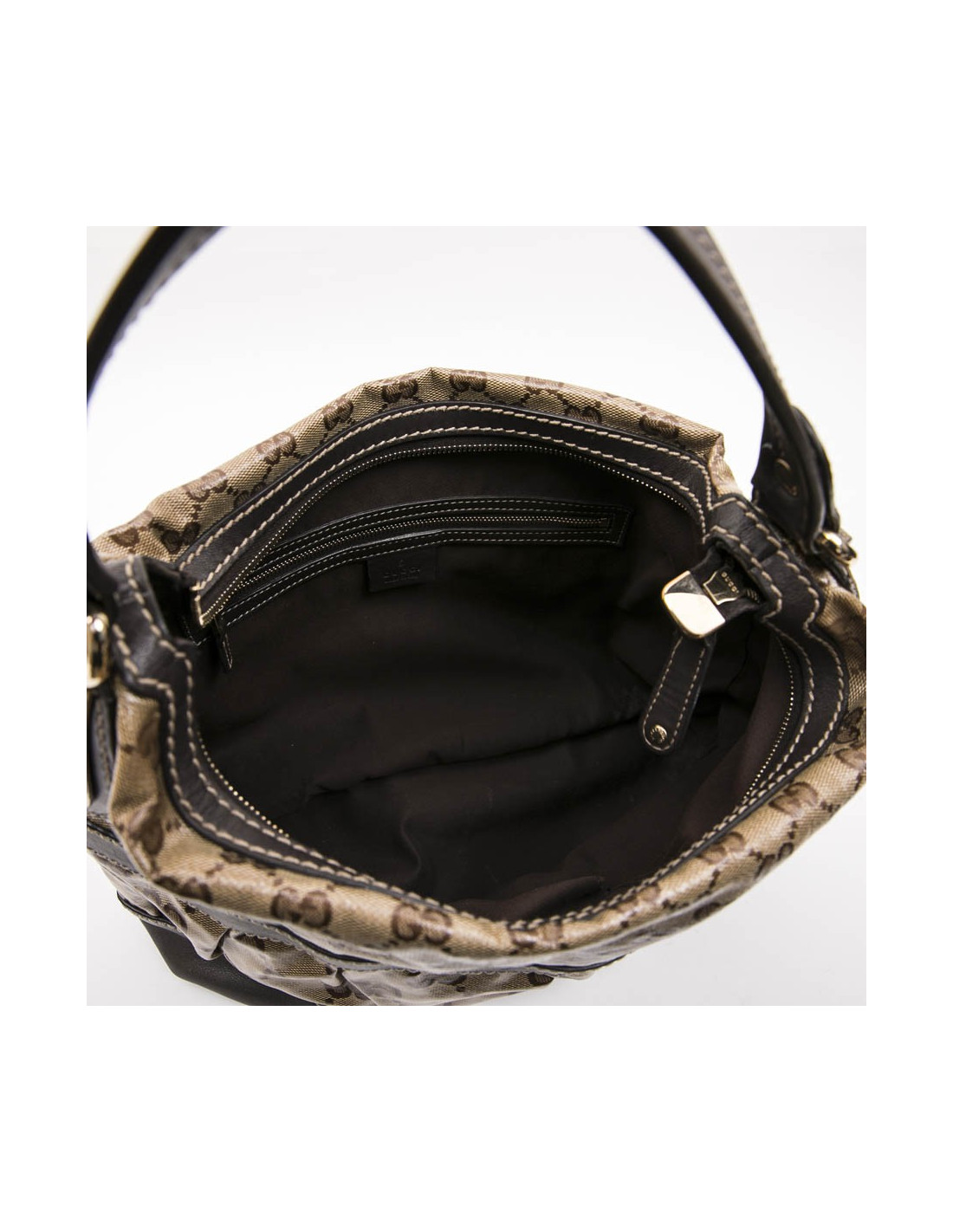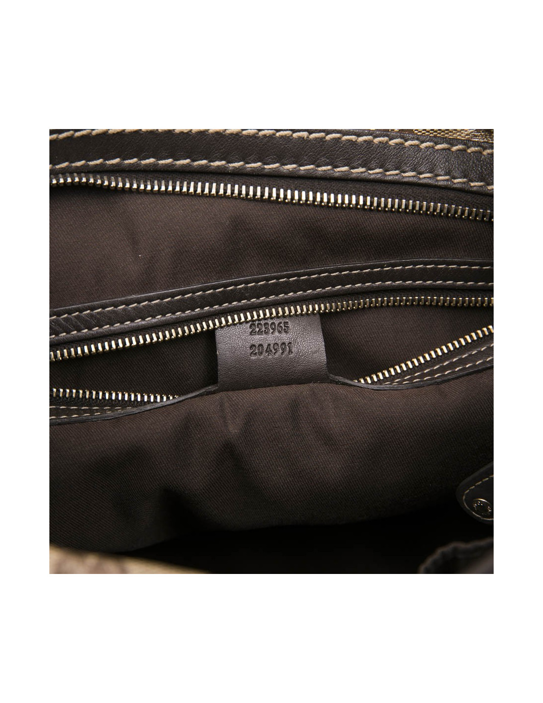 Gucci vintage bag in brown monogrammed canvas. The corners and the handles are in brown leather. It is lined in canvas with a zipped pocket. Golden metal hardware. Serial number under the inner tabs.