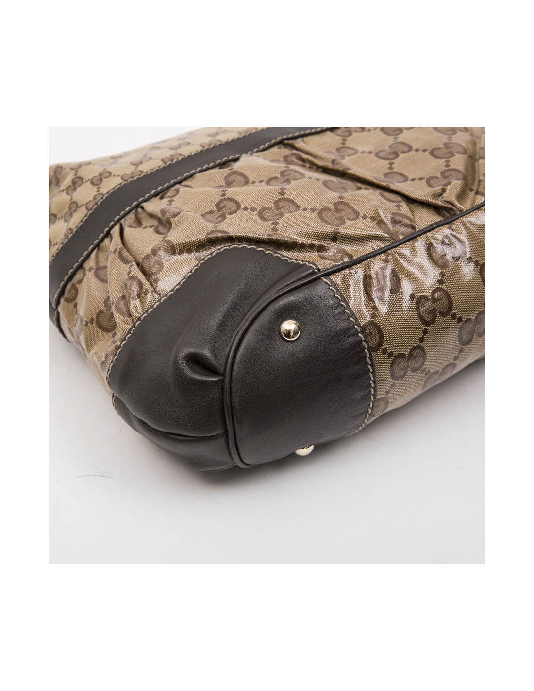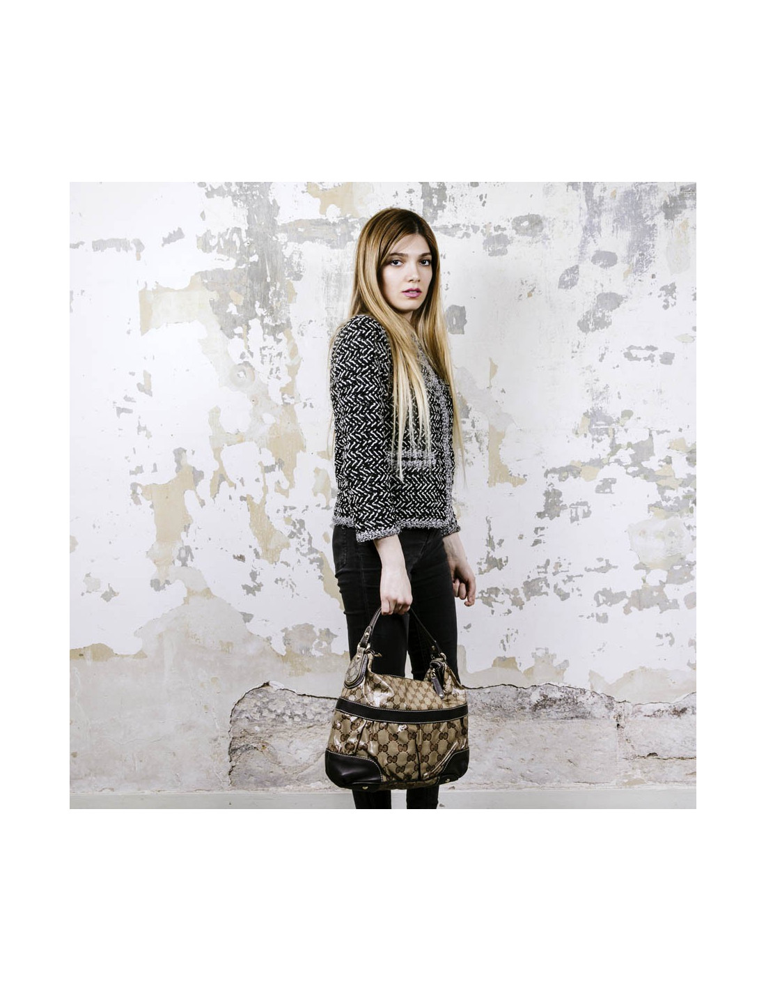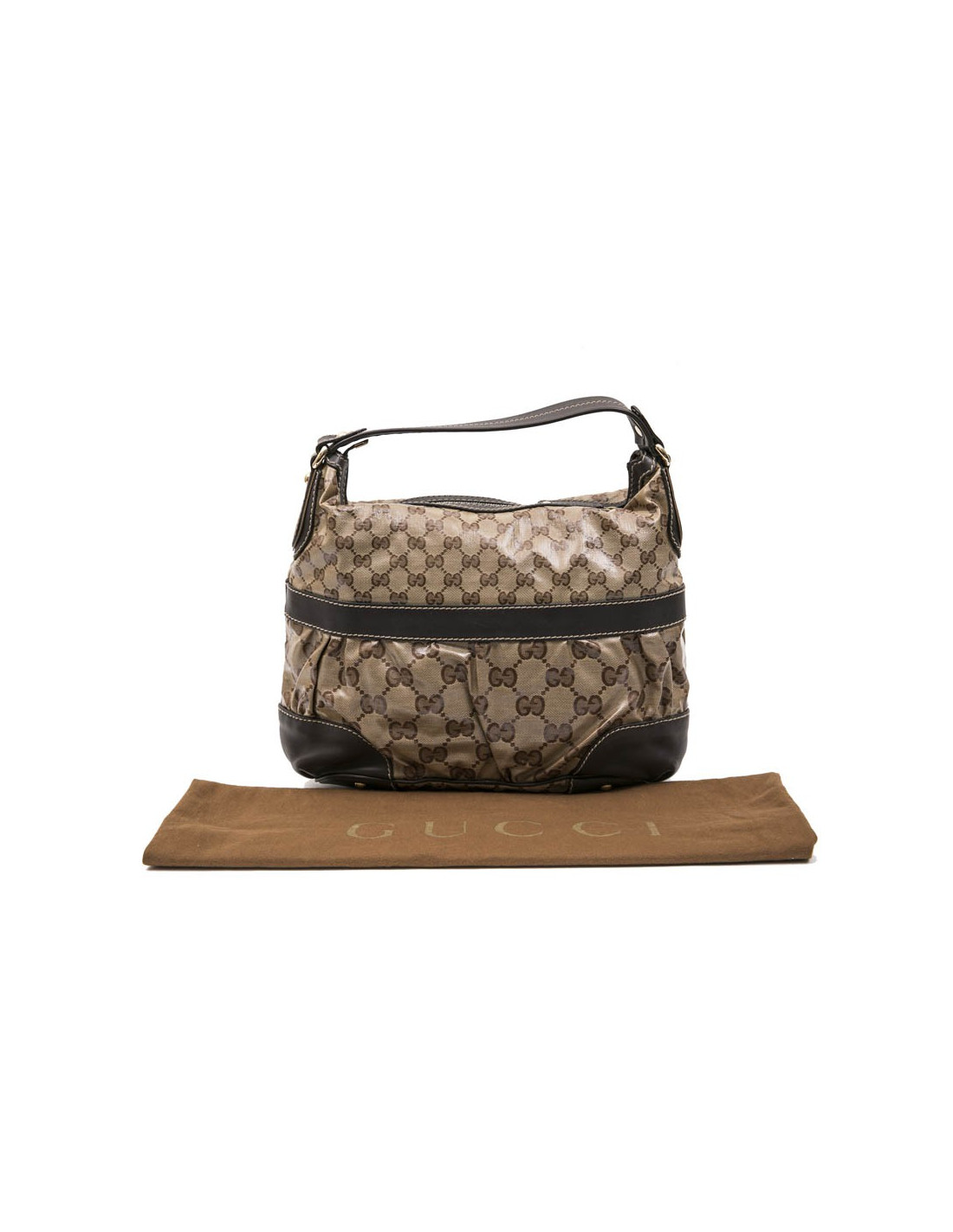 Gucci vintage bag in brown monogrammed canvas. The corners and the handles are in brown leather. It is lined in canvas with a zipped pocket. Golden metal hardware. Serial number under the inner tabs.