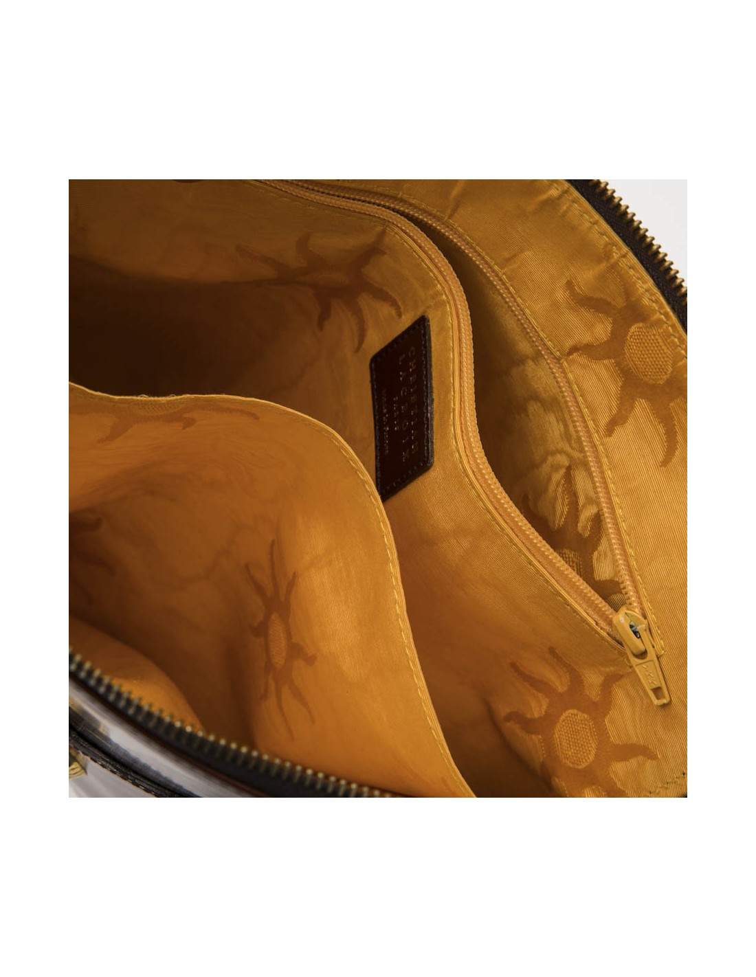 Vintage Christian Lacroix bag in smooth tawny leather. The interior is in yellow satin monogram with 2 pockets one flat and the other with a zipper.