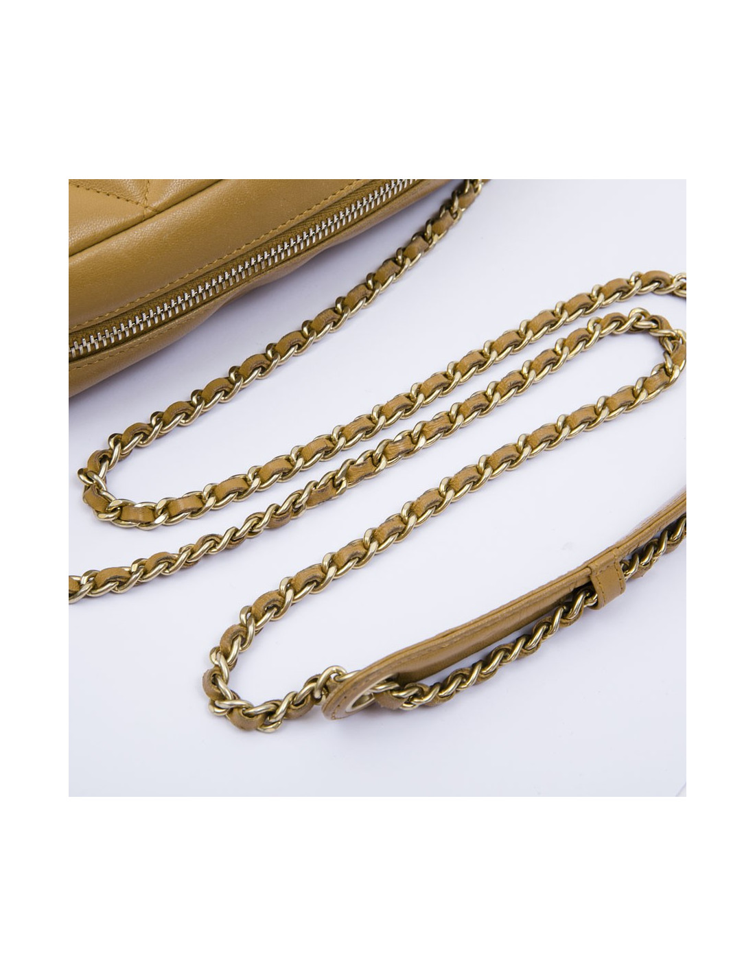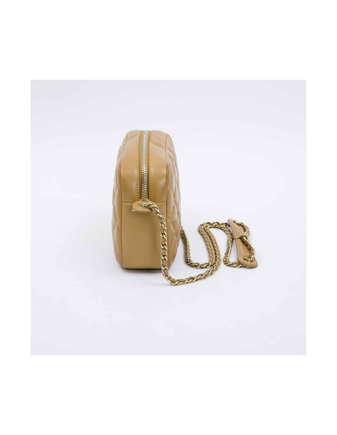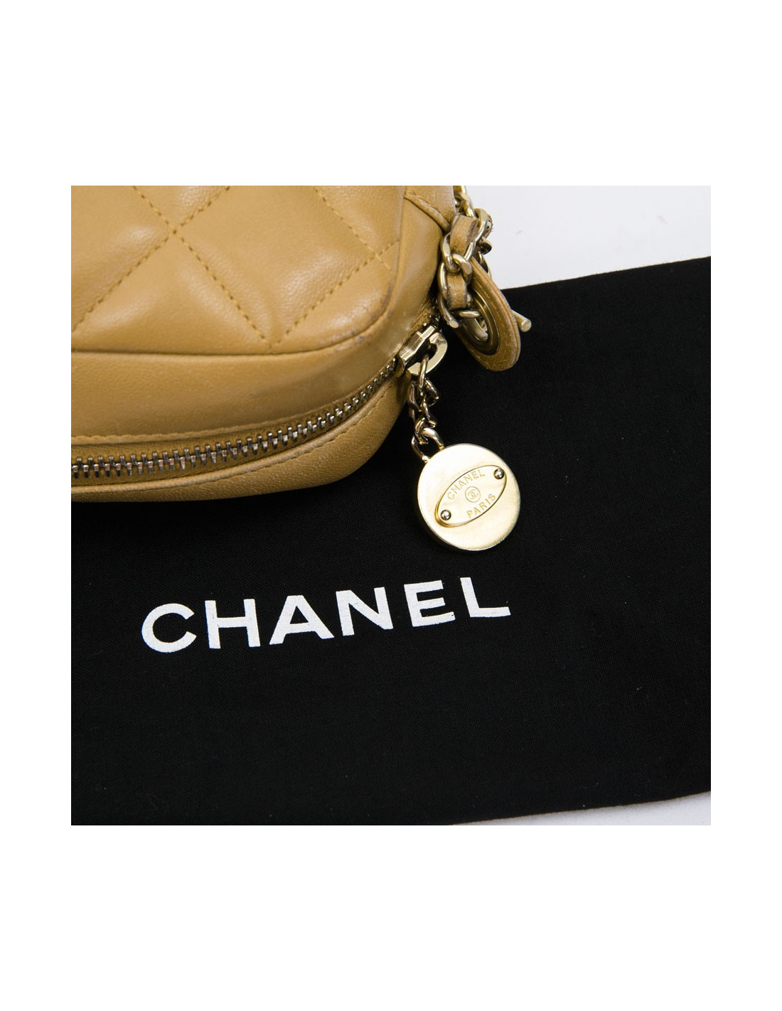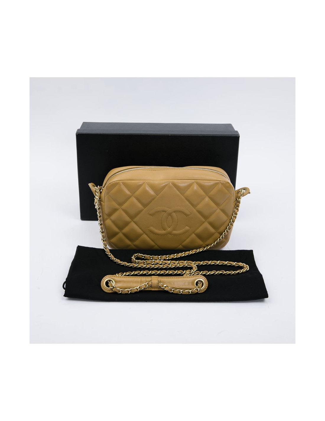 Chanel camel quilted leather camera bag. Light gold metal hardware. Zipper. Inner lining in burgundy leather with a flat zipped pocket.