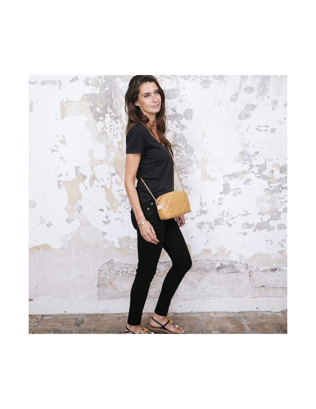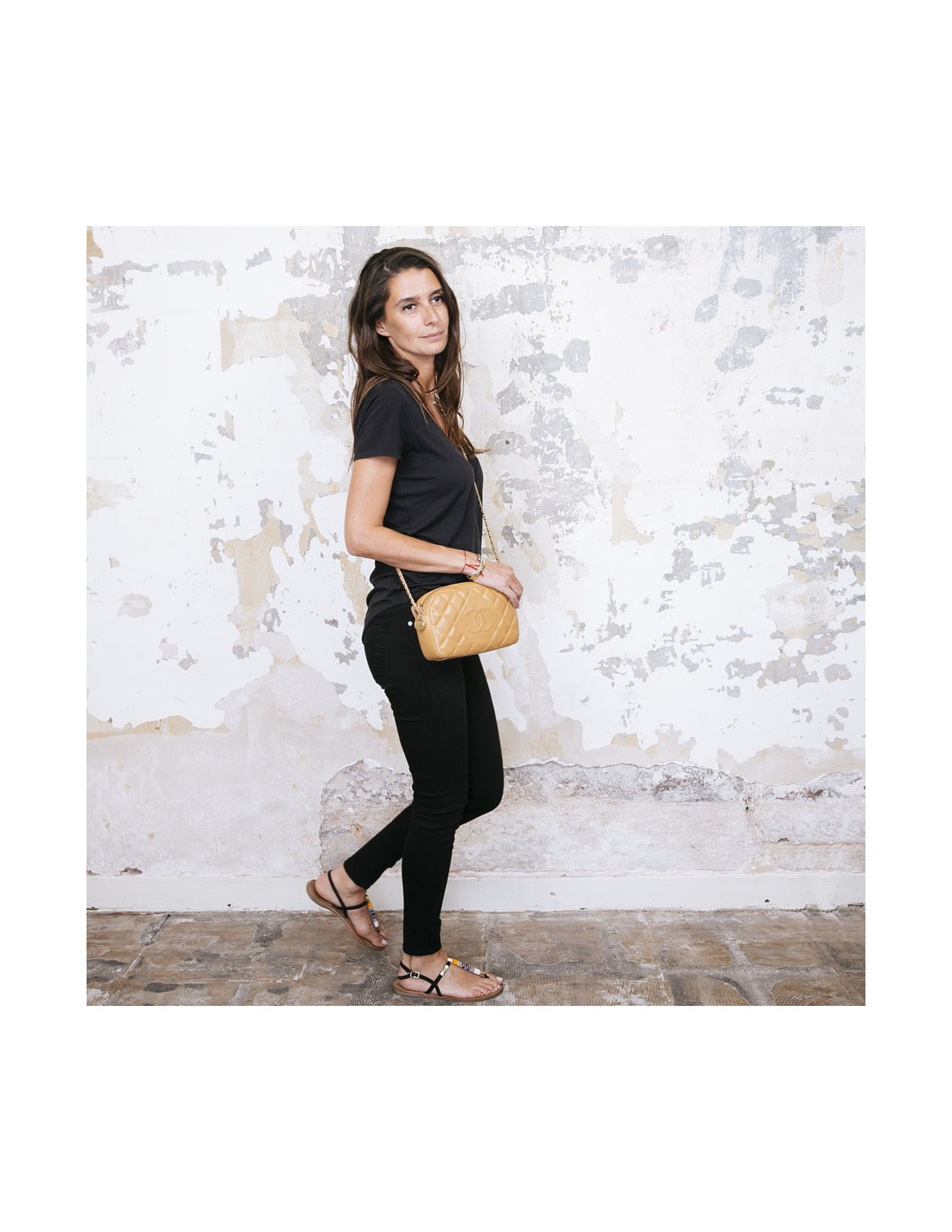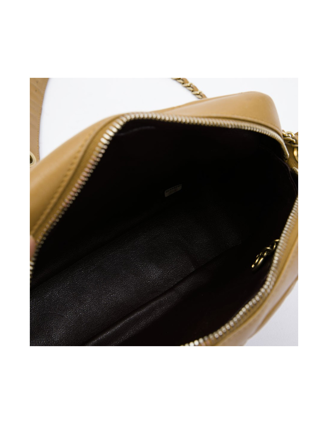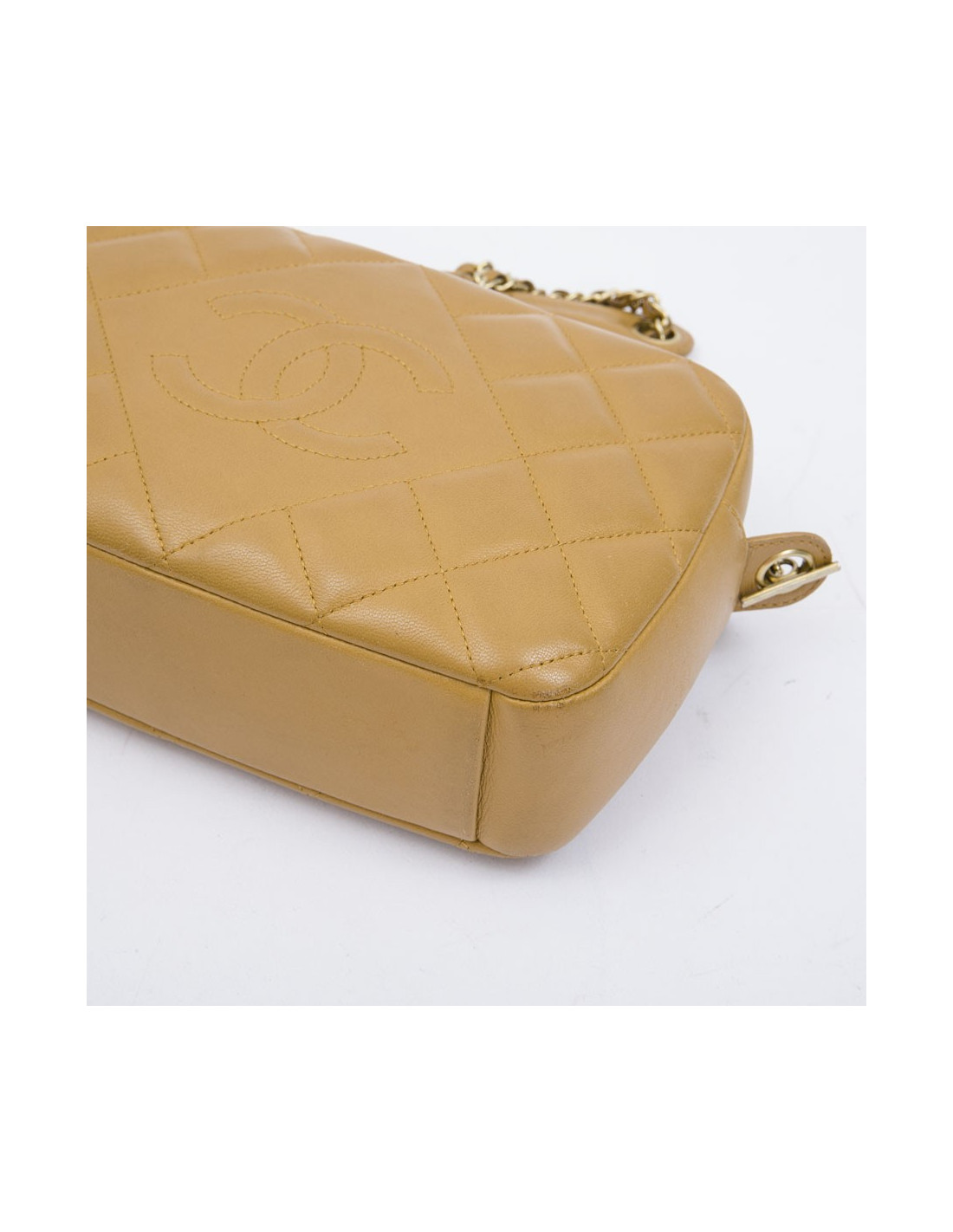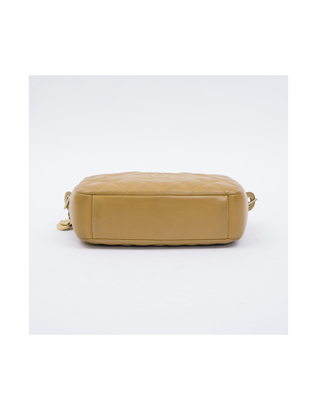 Chanel camel quilted leather camera bag. Light gold metal hardware. Zipper. Inner lining in burgundy leather with a flat zipped pocket.