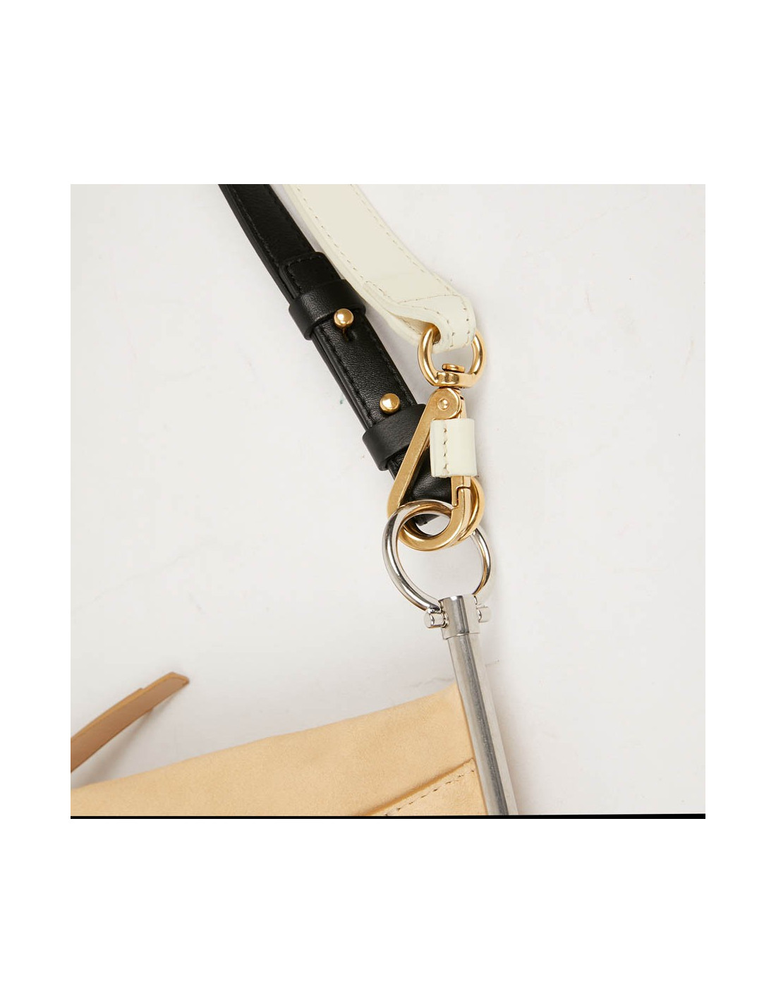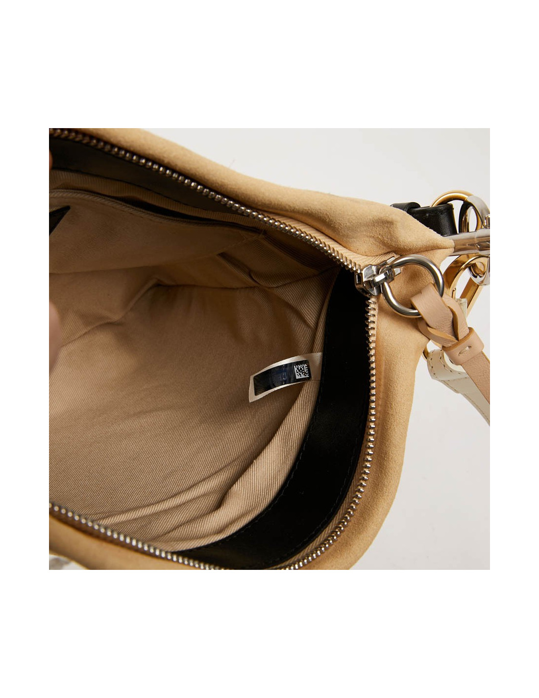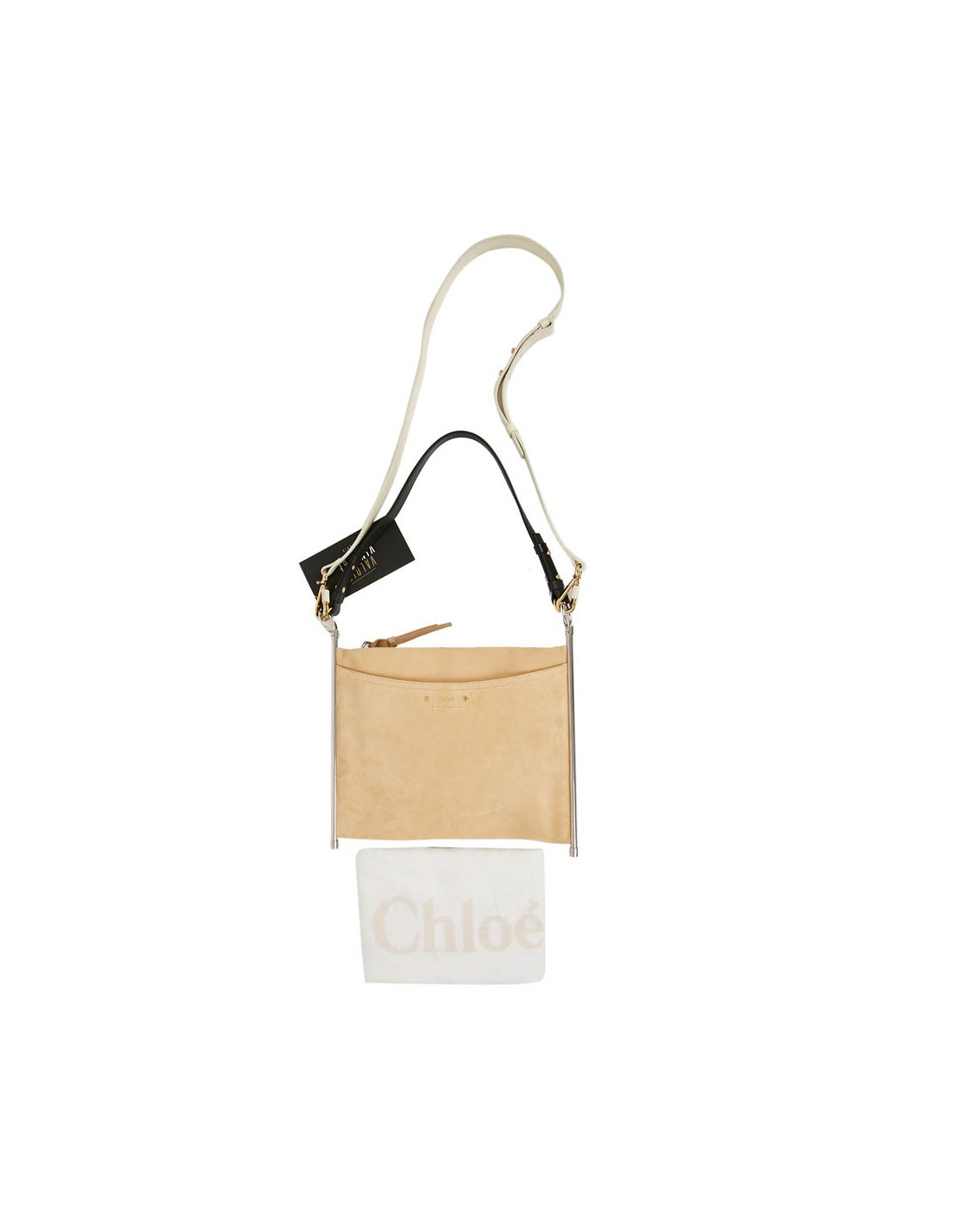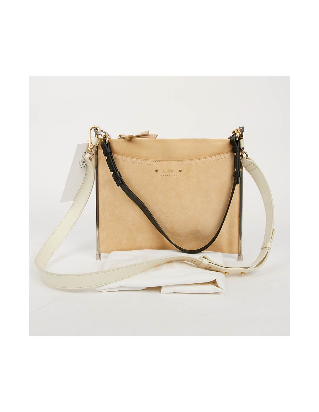 Chloé bag, never worn, in beige leather and suede. The jewelry is two-tone silver and gold. the long shoulder strap is removable and adjustable. the bag closes with a zip.