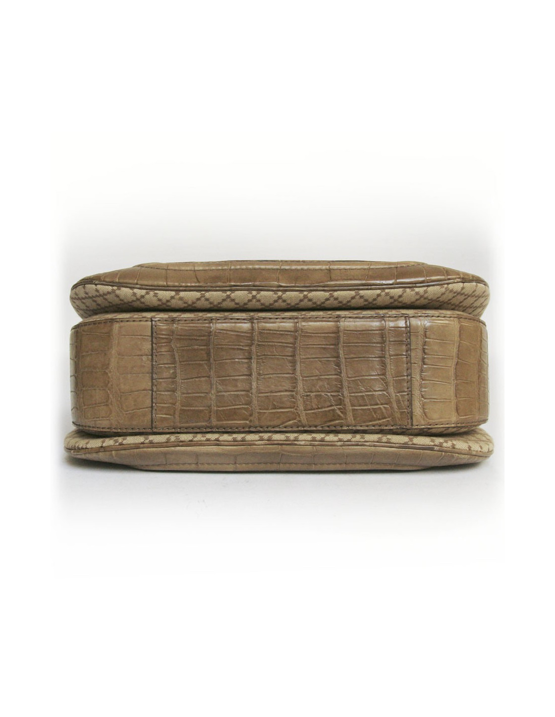 It is made of embroidered beige and brown canvas and trimmed with beige crocodile parts.