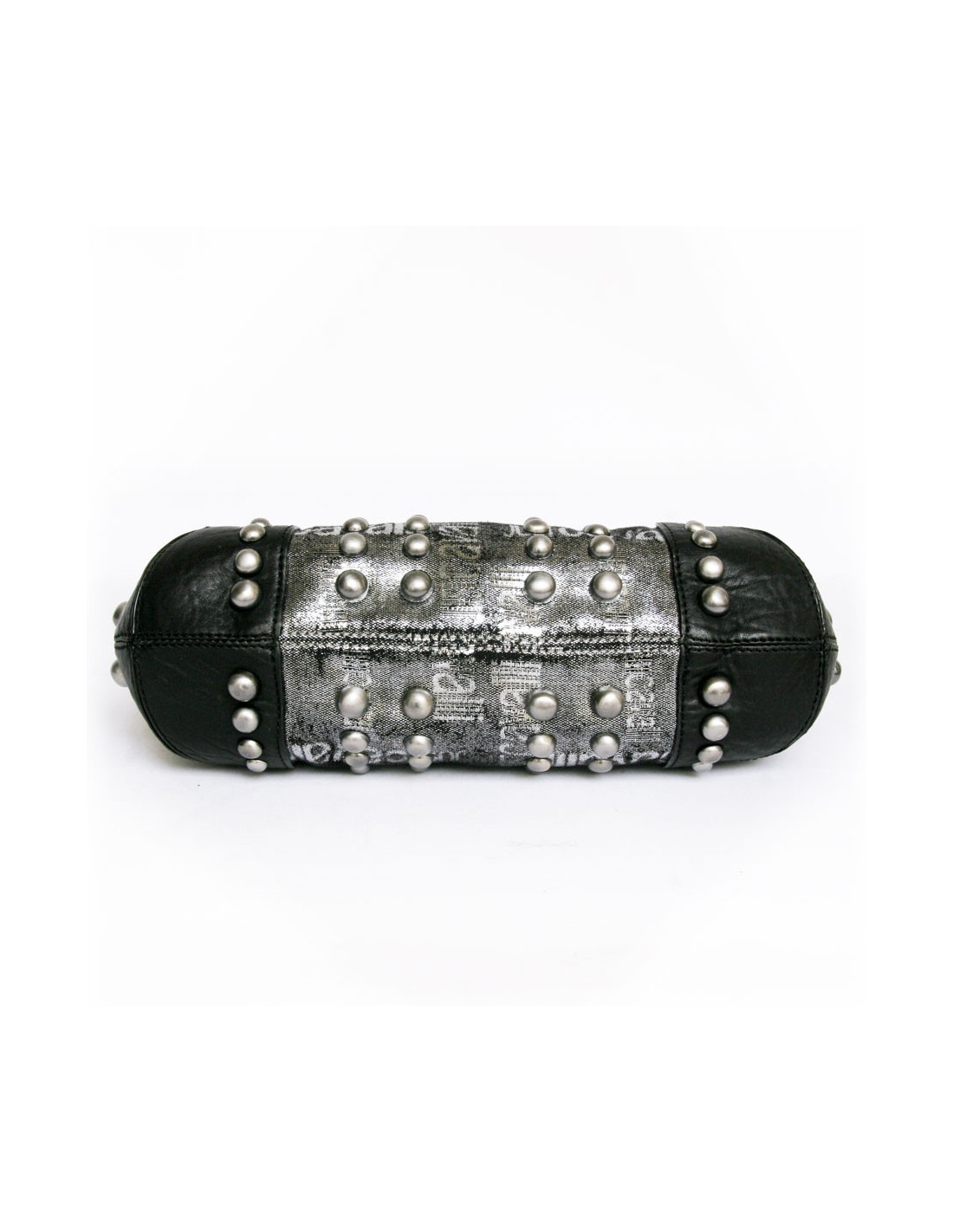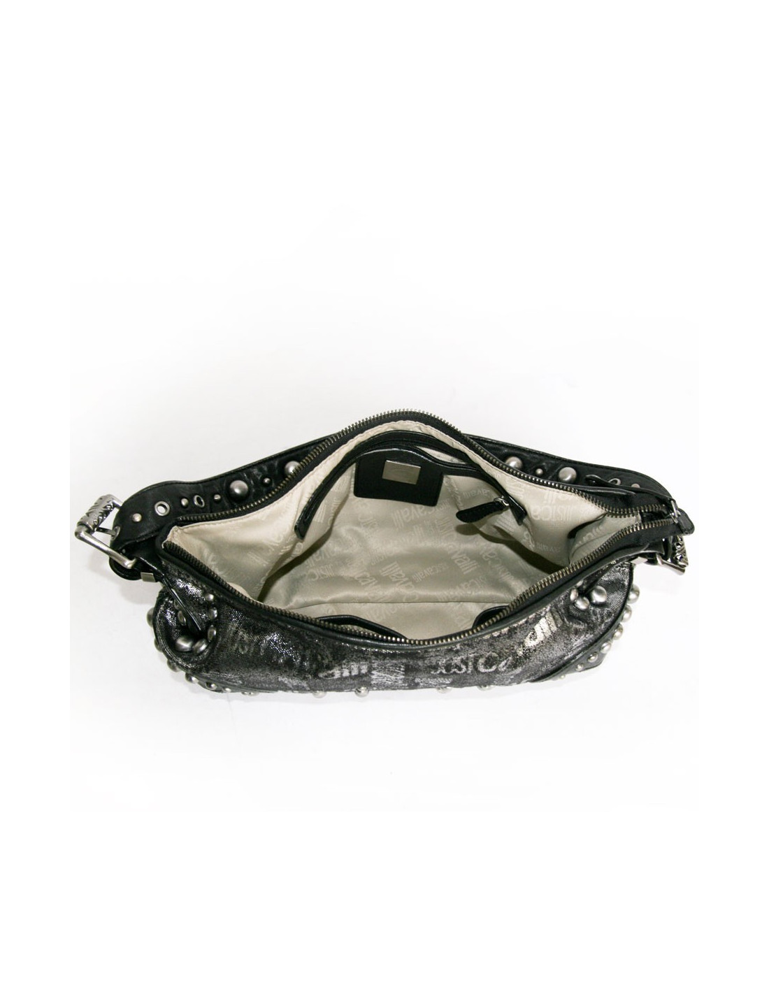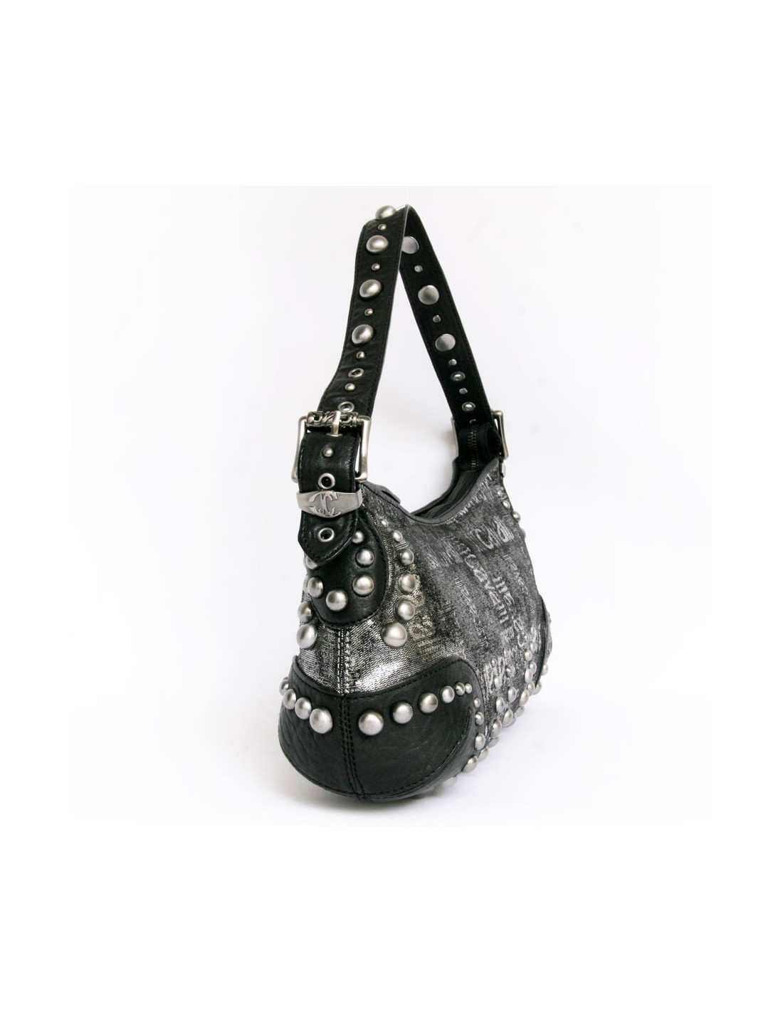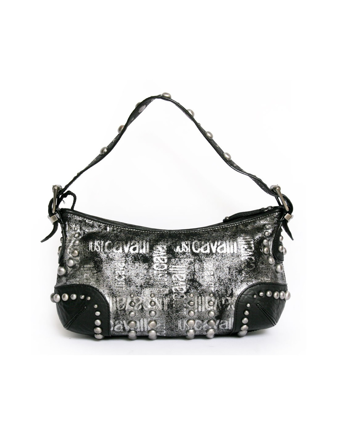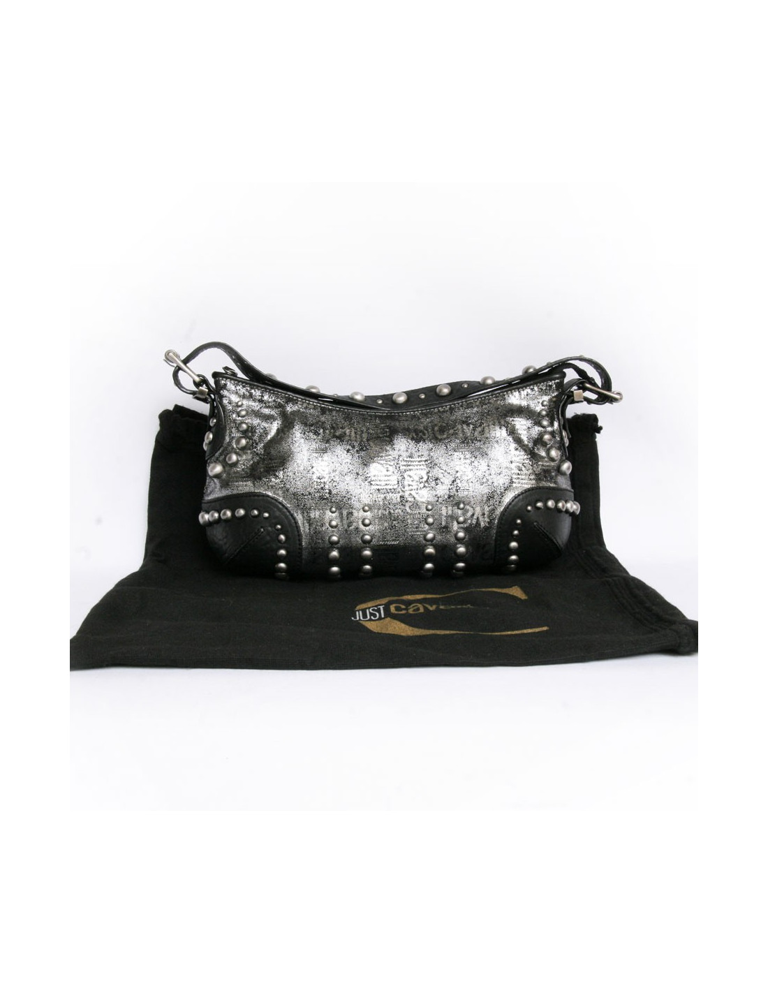 Bag Just Cavalli leather black and lame gray. Zipped. Studded all over the bag. "Just Cavalli" inscriptions on the bag. Inside is beige monogrammed canvas with 3 pockets and one zipped. It is worn on the shoulder with a removable and adjustable 5-hole loop. In very good condition.