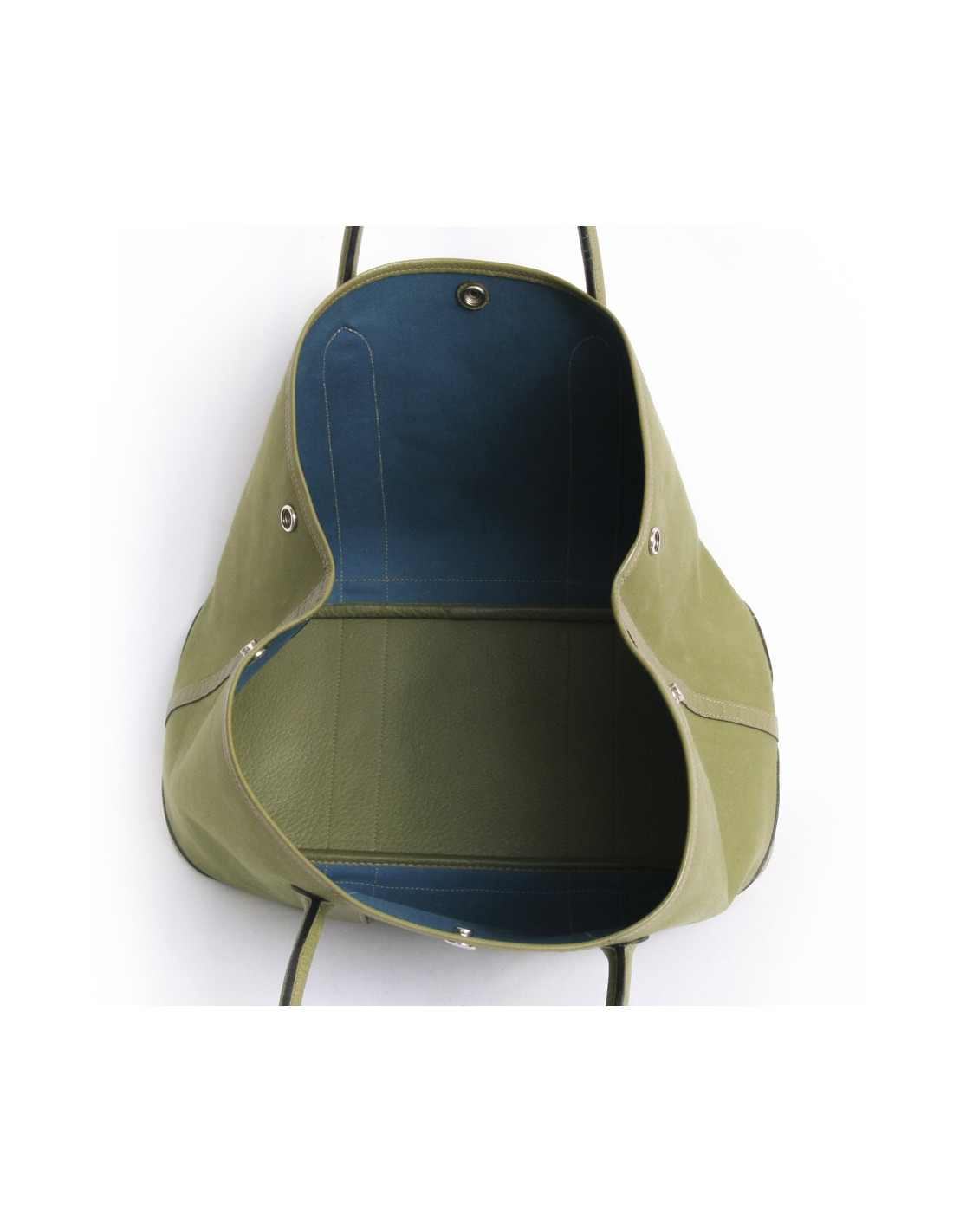 Hermès 'Garden party' bag in khaki canvas and bull leather Clémence. It is two-colored because it is lined in blue petrol color canvas.