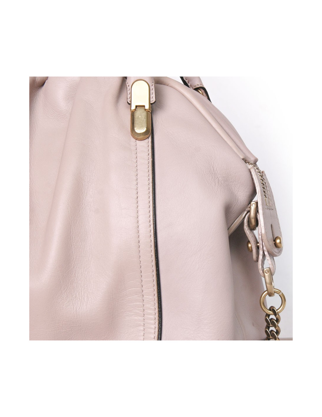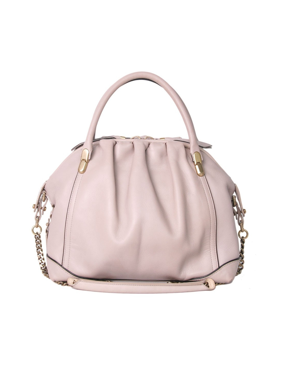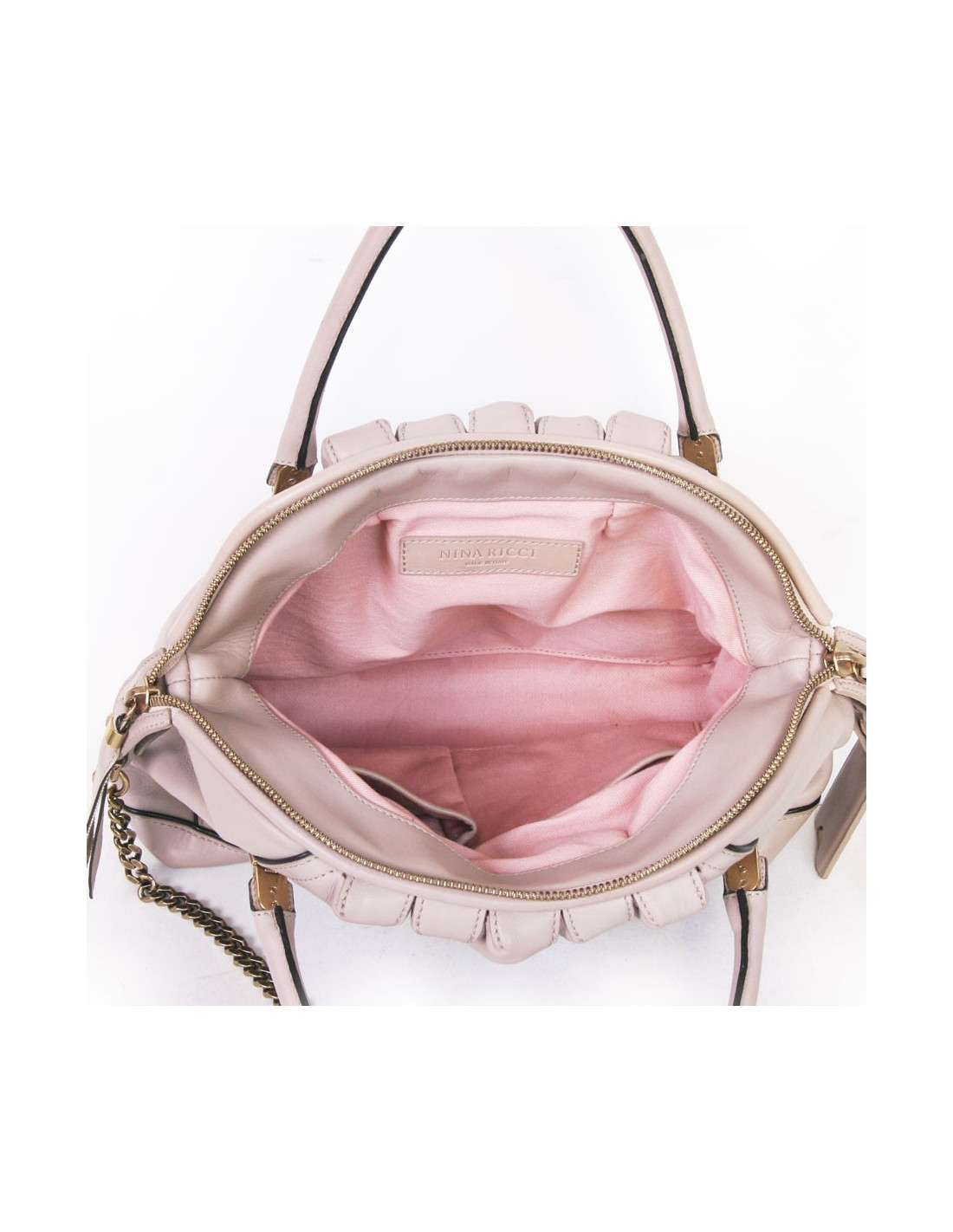 Nina Ricci 'La Rue' Bag in powder pink lambskin leather. Matte gold hardware.
